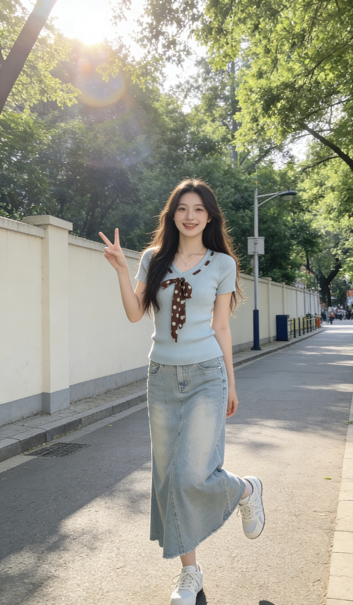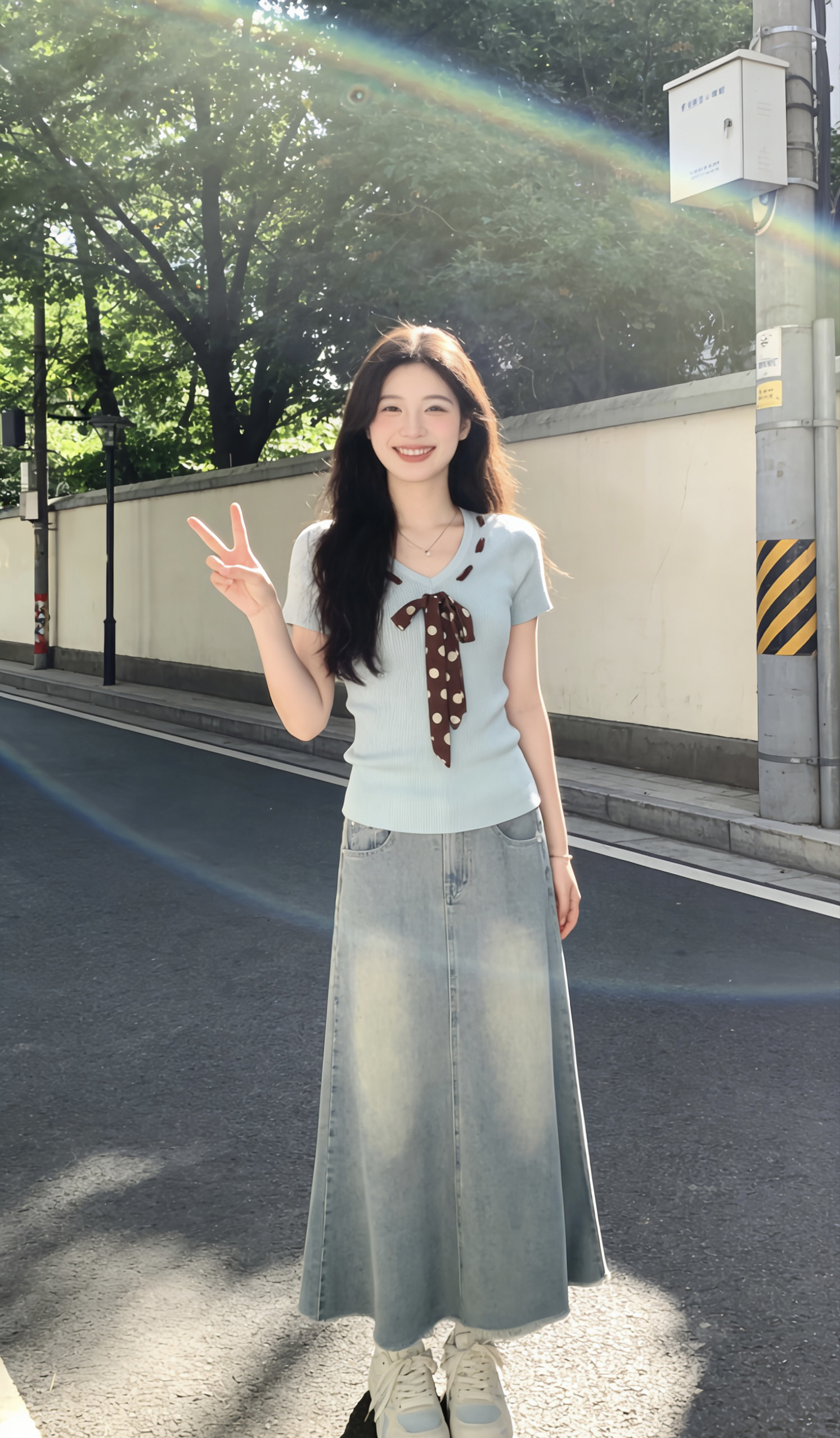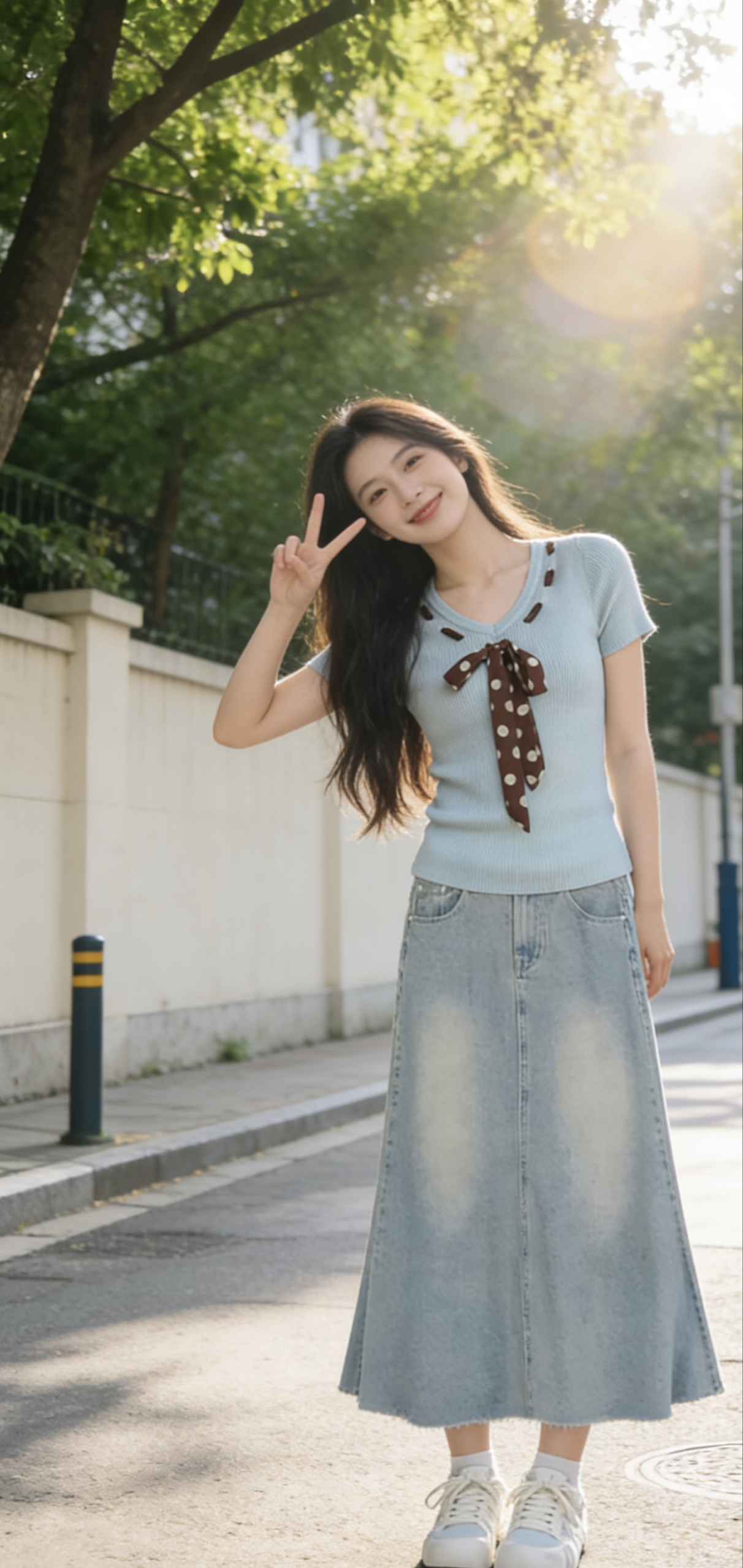 谁懂啊!这套浅蓝系穿搭直接把春日的温柔与活力焊在身上了✨ 清新显白又自带慵懒氛围,早春穿它出门,回头率真的绝绝子! • 上衣:薄荷蓝V领针织短袖太戳我!软糯的坑条面料贴肤不闷,领口的波点丝巾系带是点睛之笔~甜而不腻,温柔又带点小俏皮,V领还能悄悄拉长颈线,显脸小一绝💙 • 下装:复古浅蓝水洗牛仔半身裙,版型真的太懂女生了!高腰设计直接拉高腰线,垂坠的A字裙摆藏肉又显瘦,走路带风的慵懒感拉满,春...