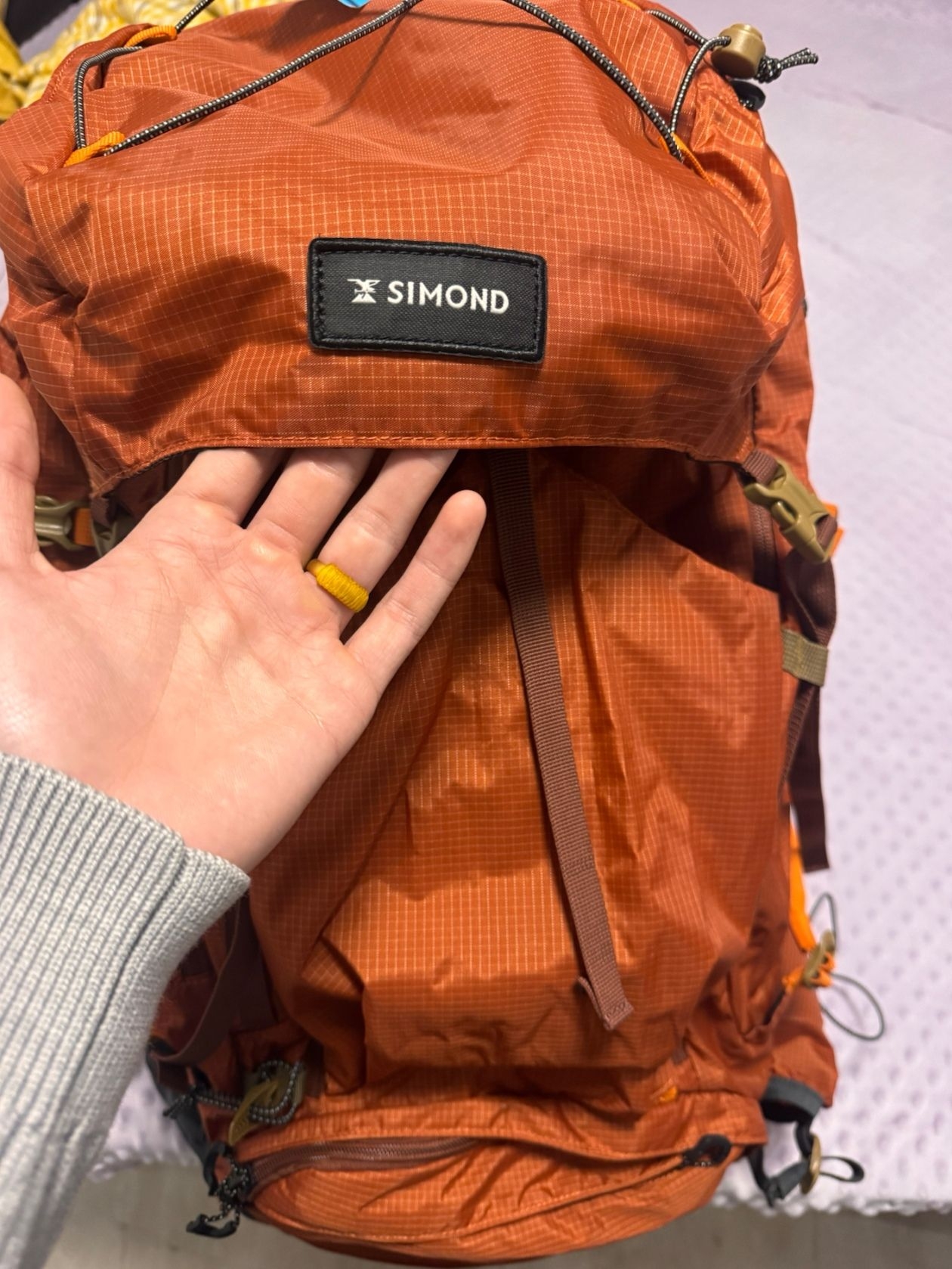 已经背着进了一次山,背负系统挺方便的,也比较符合人体工学,包容量很大70升,再大的包容纳东西也得讲究搭配压缩。包有很多分区可容纳不同需求的户外用品,喜欢包的这个颜色,在户外比较显眼,底部防雨罩可以应对雨水天气。