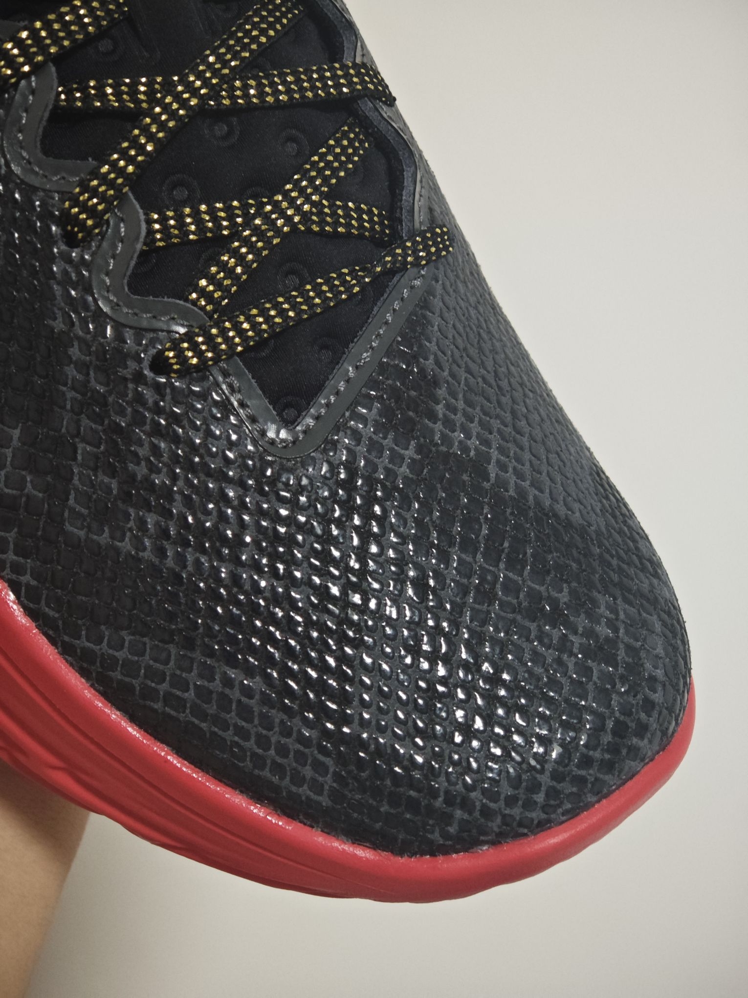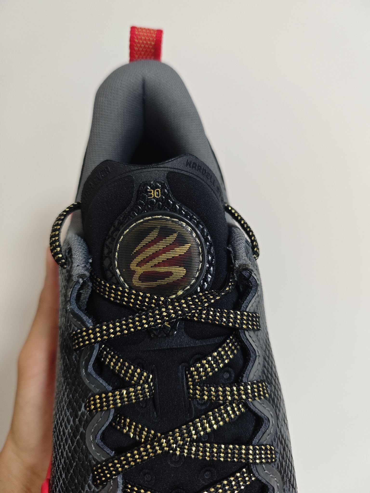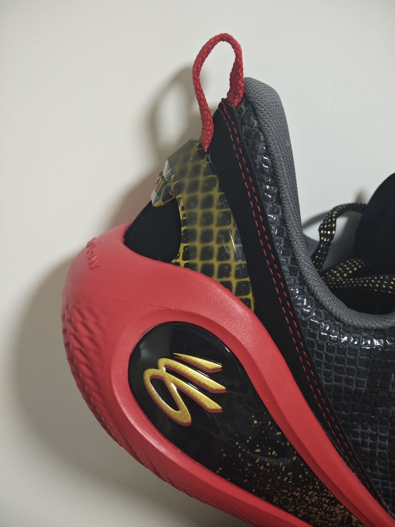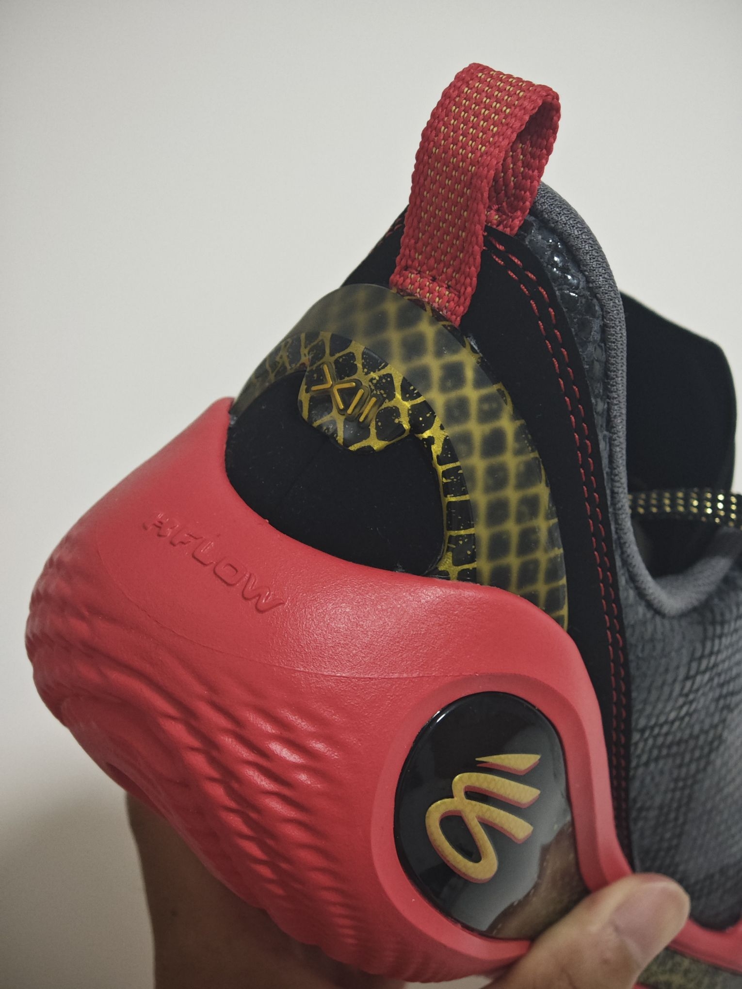 这款库里12的蛇年配色跟其他版本还真不太一样,鞋面采用了皮质的材质模拟蛇的皮肤,要说好出就是鞋面支撑的强度更大,刚性更强 但相应的可能也在一定程度上削弱库里球鞋特有的场地感和鞋脚一体性 外观来讲的话其实细节处理还是不错的,现在400元左右的价格,没体验过flow的兄弟们值得一试