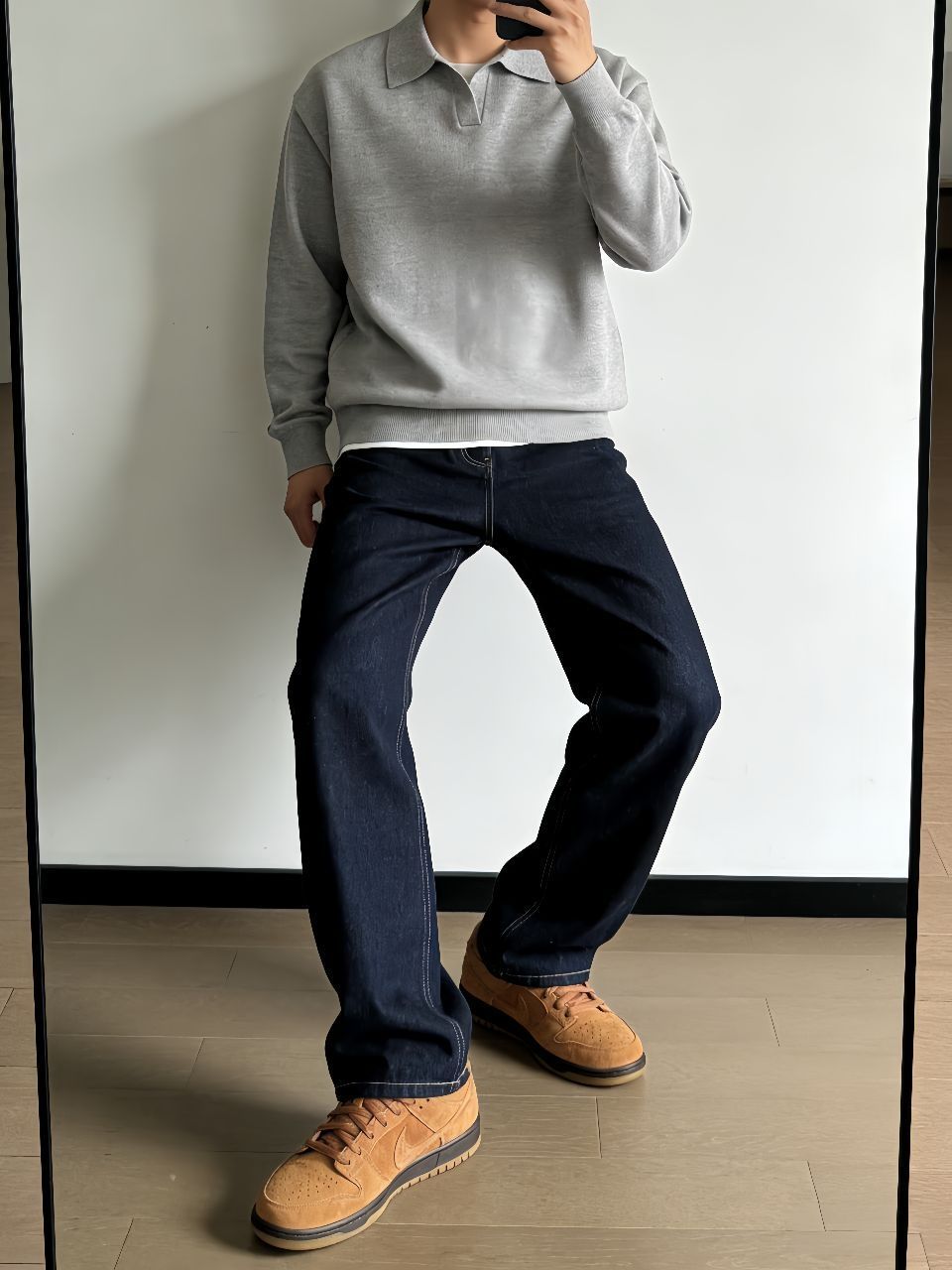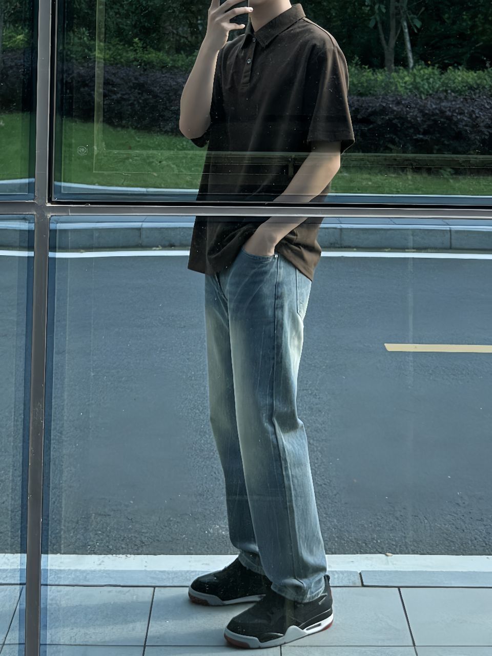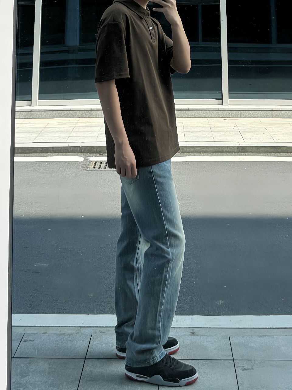春天就爱这身:班尼路这件Polo,宽松舒服,黑灰色不挑人,单穿正好。下身SUPEREALLY微喇牛仔裤,猫须水洗很有味道,垂感好不勒腿,走路带风。鞋子Jordan AJ4 RM黑红,复古百搭,踩着软。搭配心得:Polo下摆塞一点进裤子,瞬间拉腿,鞋子红勾跟衣服深色一撞,痞帅不油腻。春天这么出门,透气又利落。
