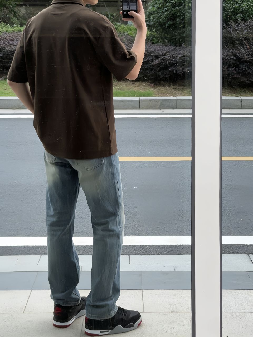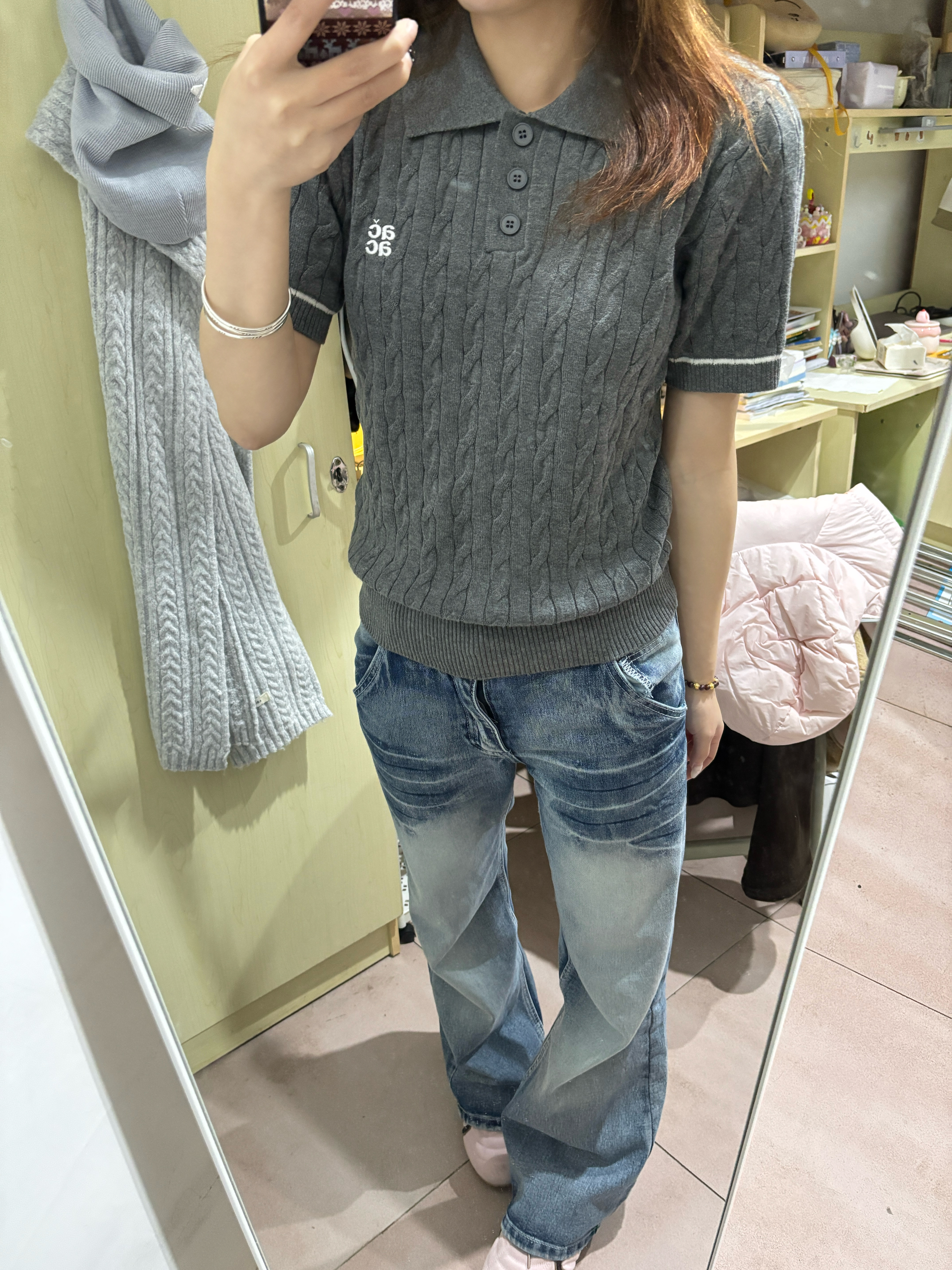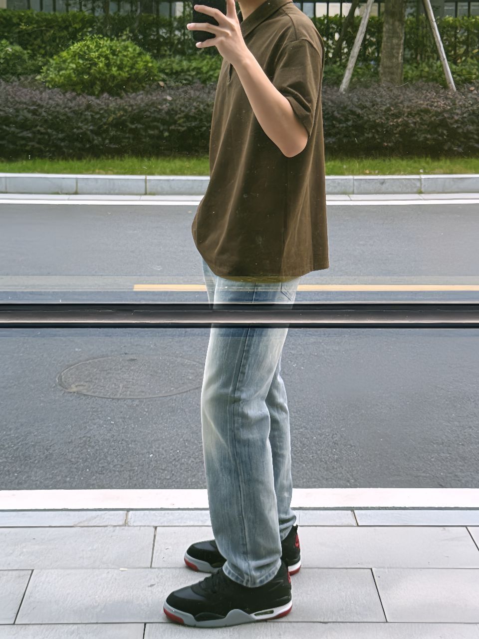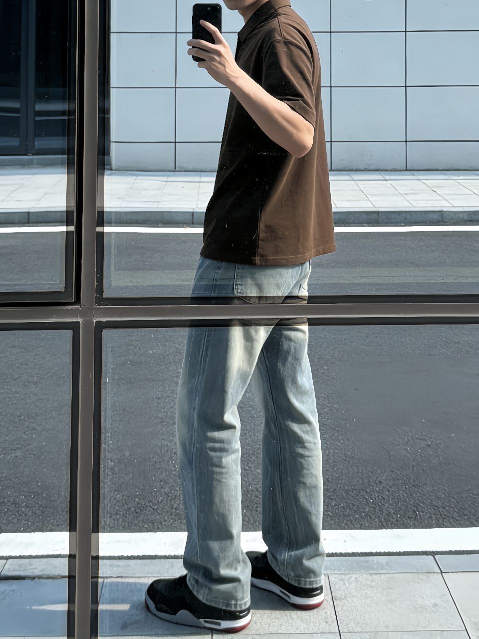 春天就爱这身:班尼路这件Polo,宽松舒服,黑灰色不挑人,单穿正好。下身SUPEREALLY微喇牛仔裤,猫须水洗很有味道,垂感好不勒腿,走路带风。鞋子Jordan AJ4 RM黑红,复古百搭,踩着软。搭配心得:Polo下摆塞一点进裤子,瞬间拉腿,鞋子红勾跟衣服深色一撞,痞帅不油腻。春天这么出门,透气又利落。