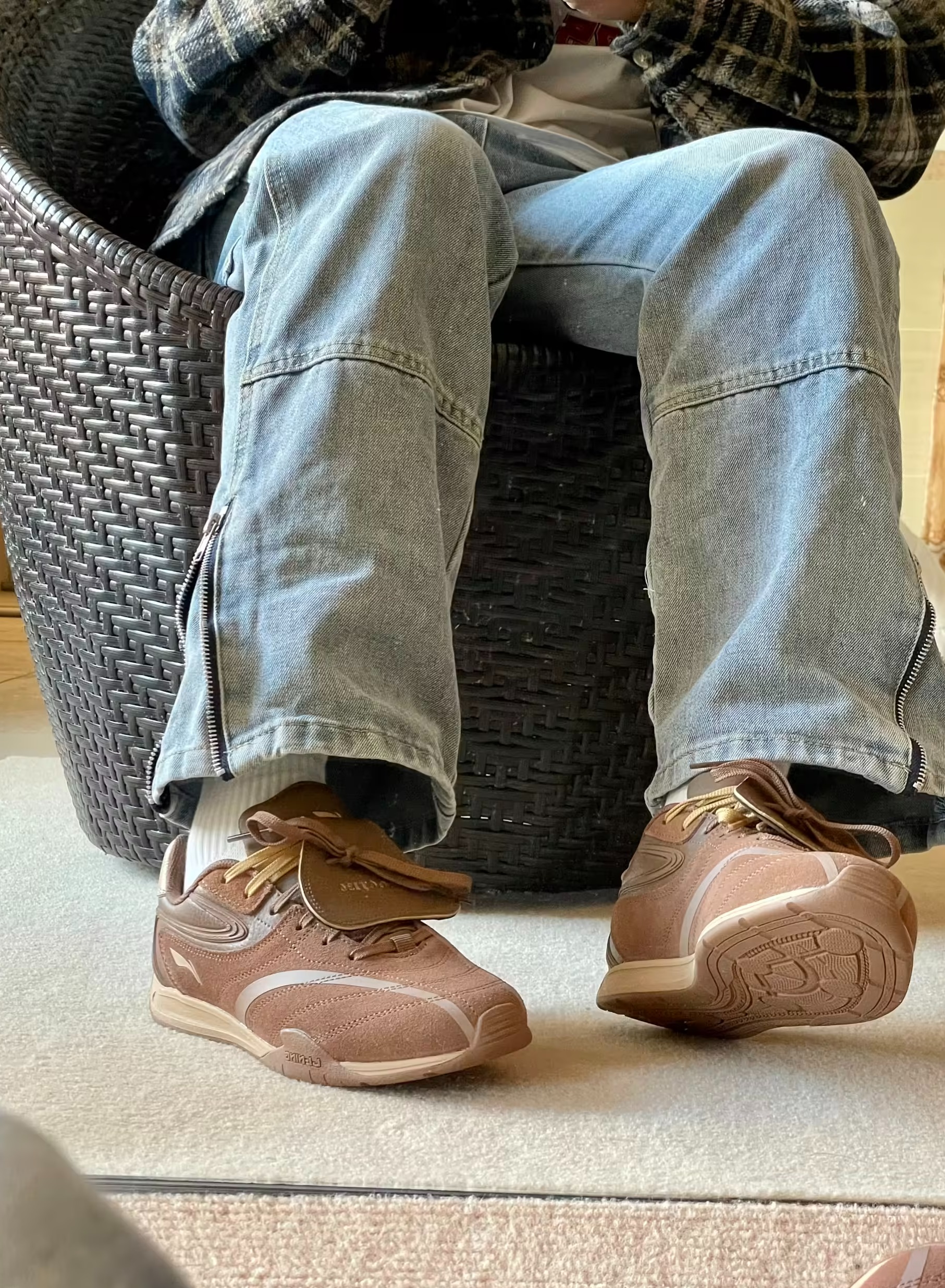 穿上这双鞋< 丶脚感偏软但支撑够,我下身配了条深灰 色加绒卫裤,上身是件橄榄绿的摇粒绒外套鞋身的 黄绿撞色让整套穿搭更协调了等快递时,同楼的女生盯着看了好半天(这双选正码就合适,不用刻意选大或选小就是鞋头的翻毛皮有点不耐脏,刚穿两天就沾了点灰