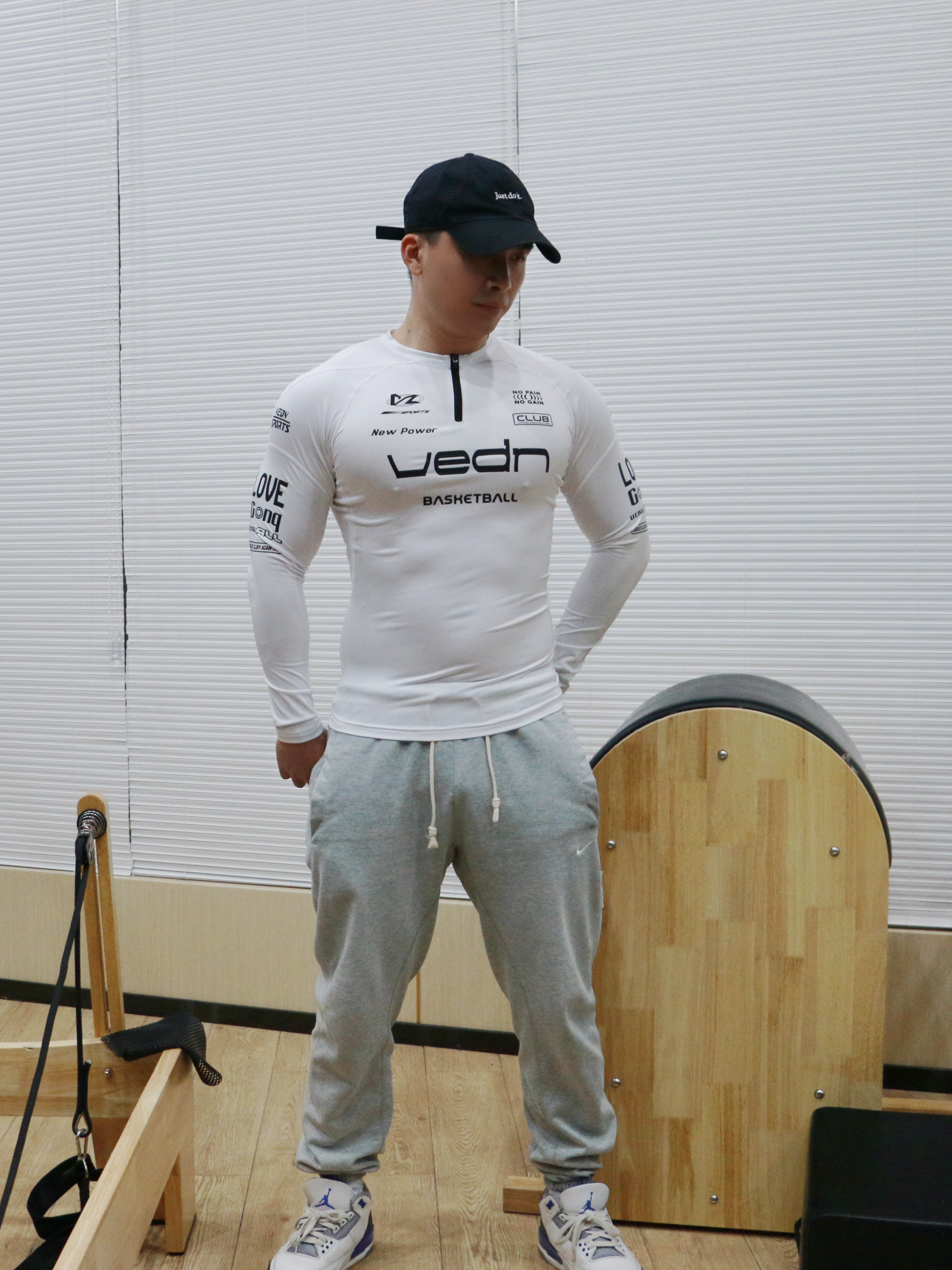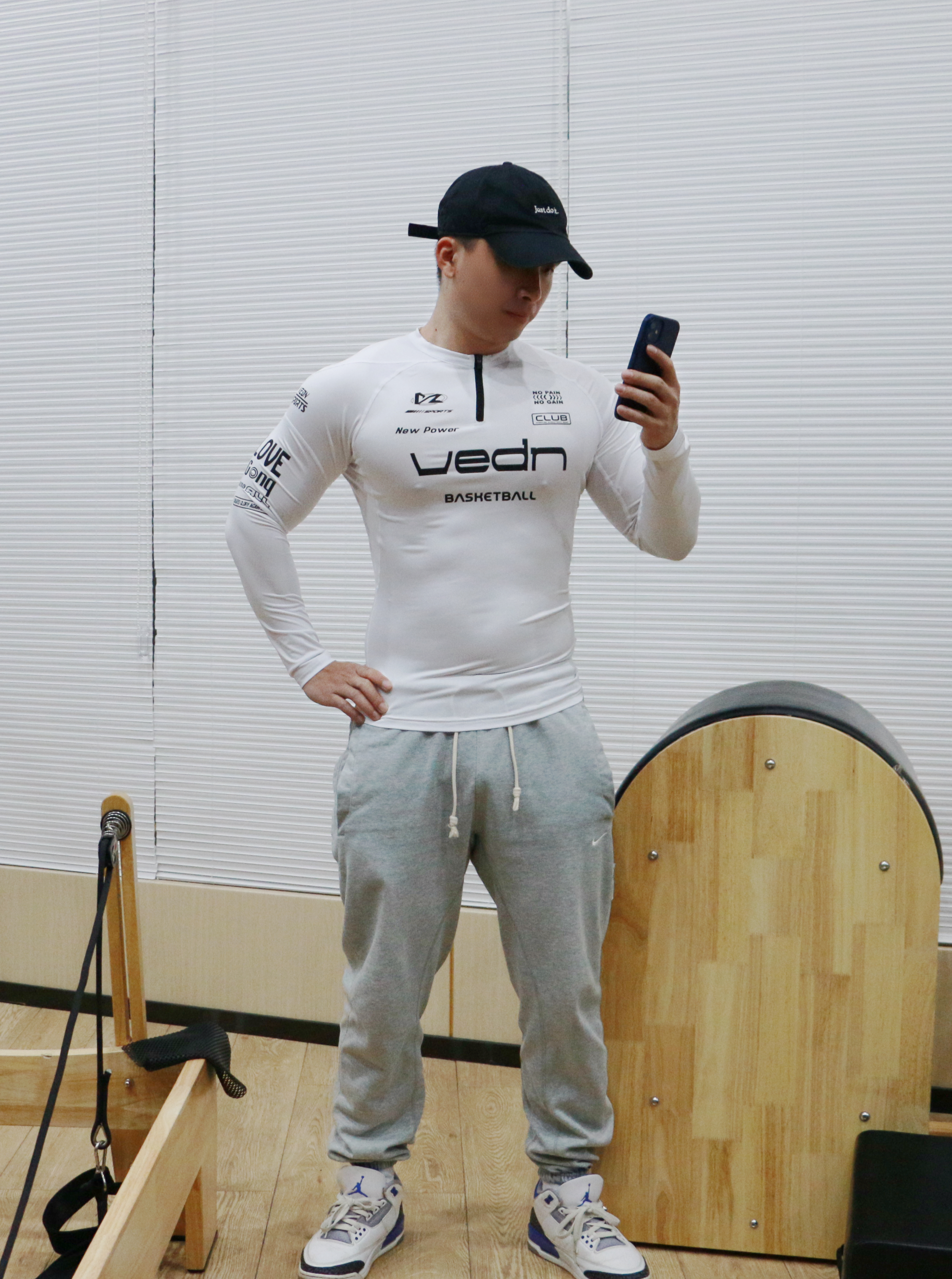 搭配浅灰色运动裤与运动鞋,整体造型利落清爽,运动氛围感拉满。