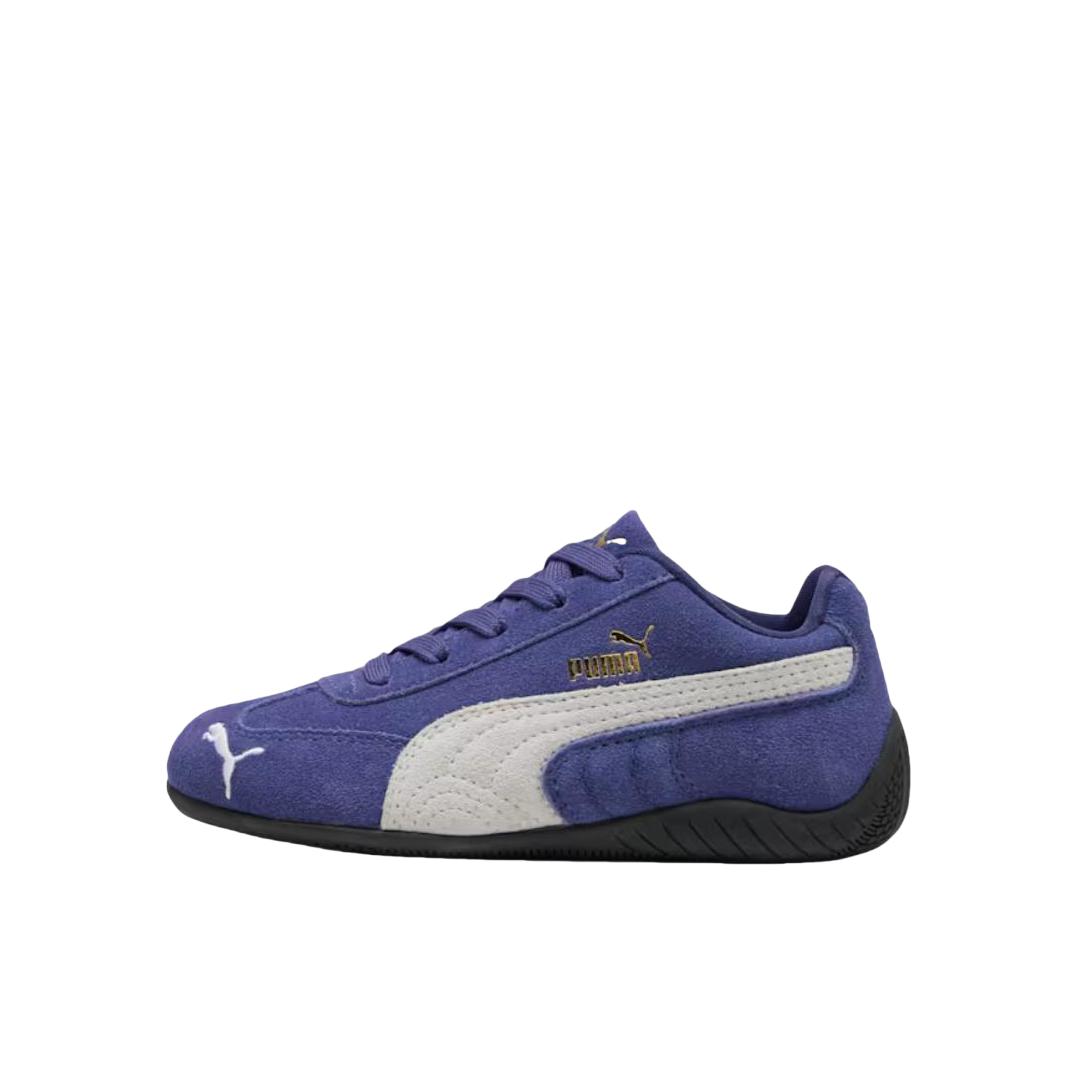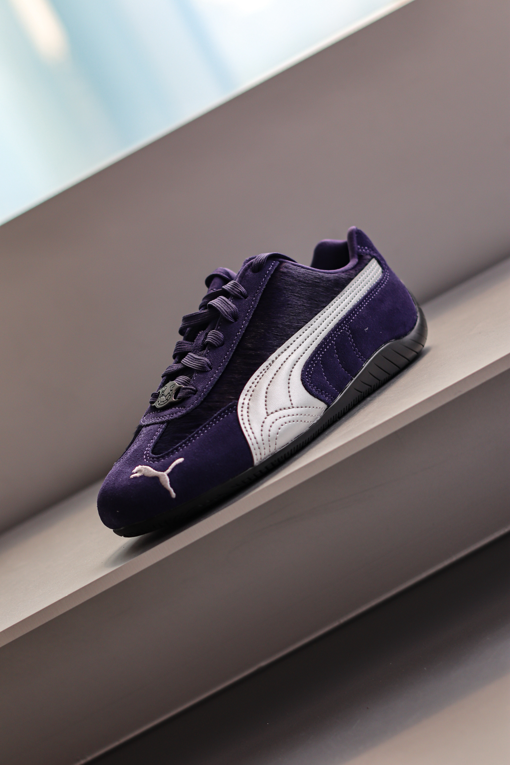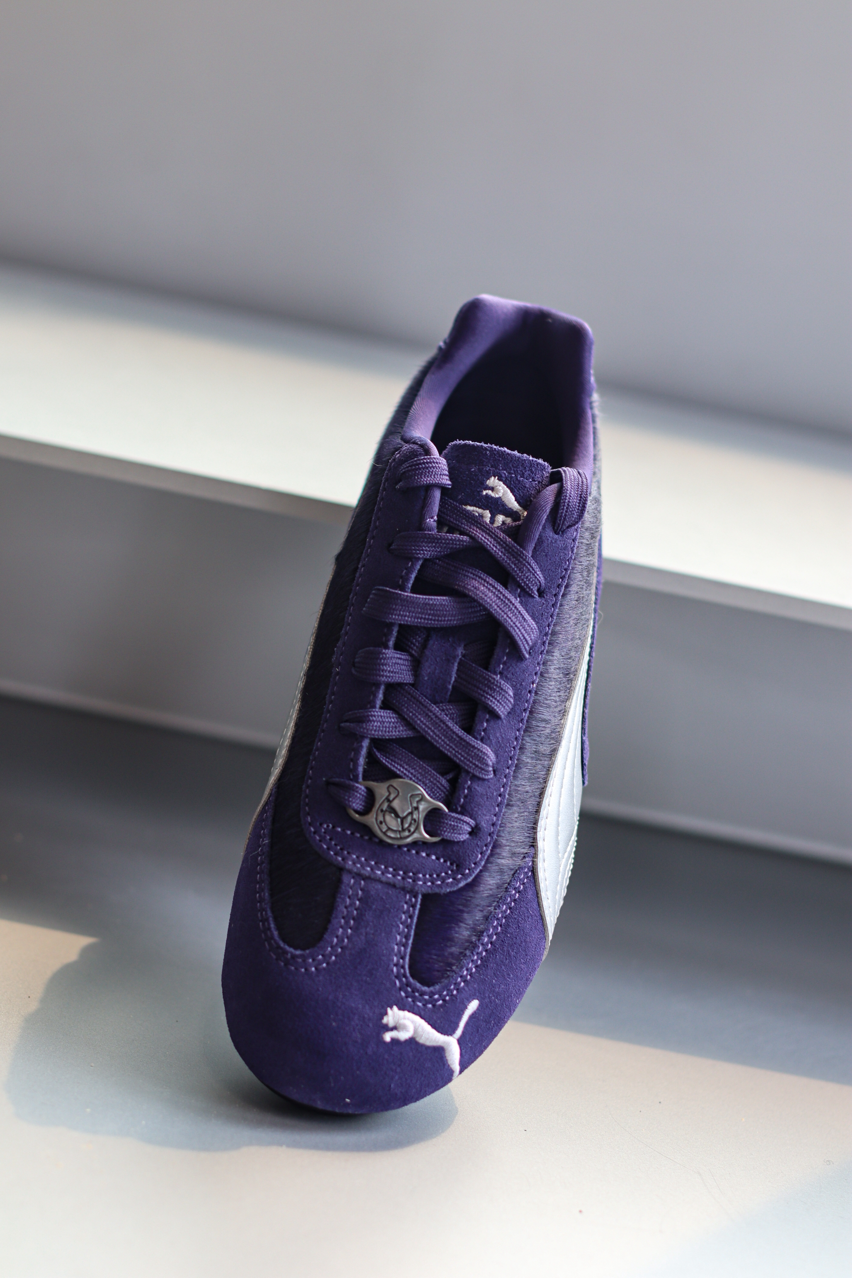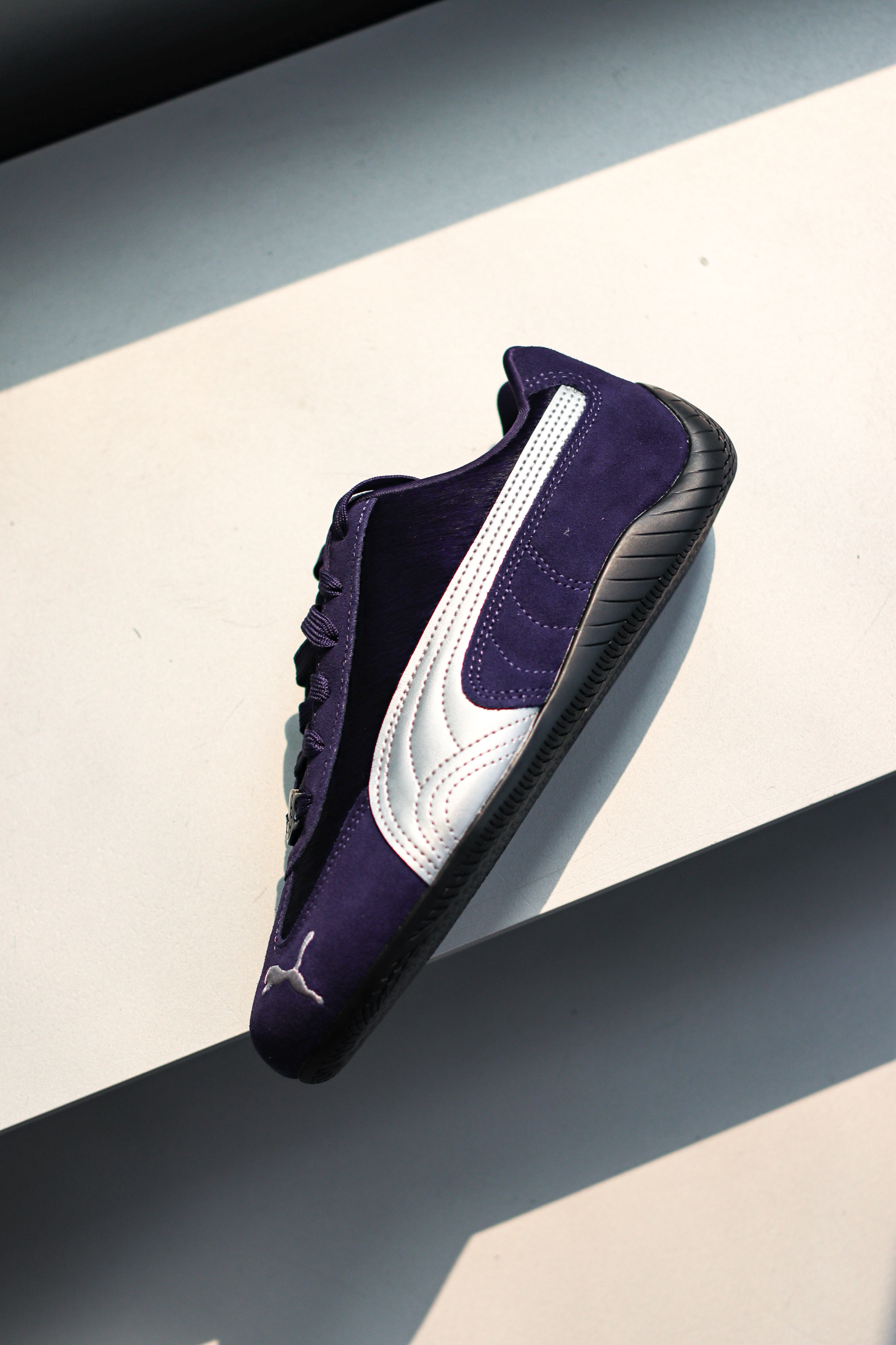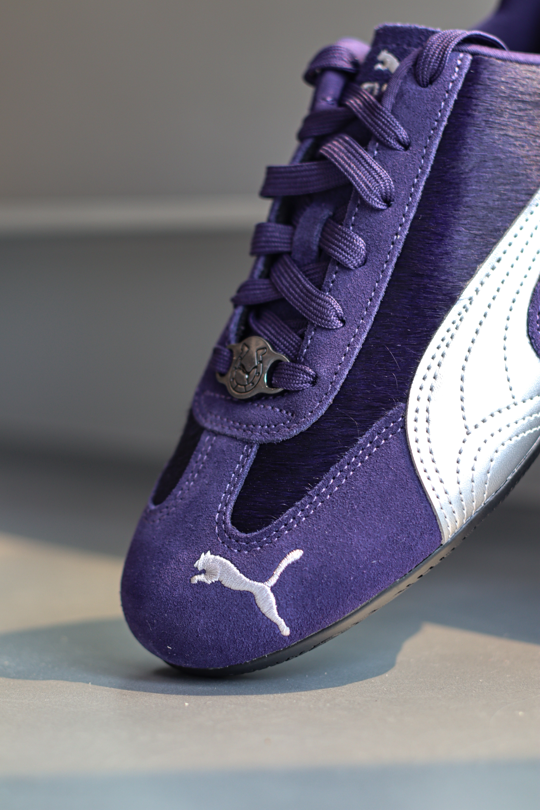Speedcat赛车🏎️薄底鞋我相信已经很出圈了!而这双CNY马年限定有点特别~ 它整体是很有韵味的紫色,侧面logo用银色呈现,这个配色还挺有个性的! 它的鞋面材质也很丰富!翻毛皮拼接仿马毛材质,还有个马蹄铁金属扣,细节方面呼应马年限定主题~ Speedcat经典的薄底赛车鞋型,上脚既复古又潮流,日常也很好搭配!