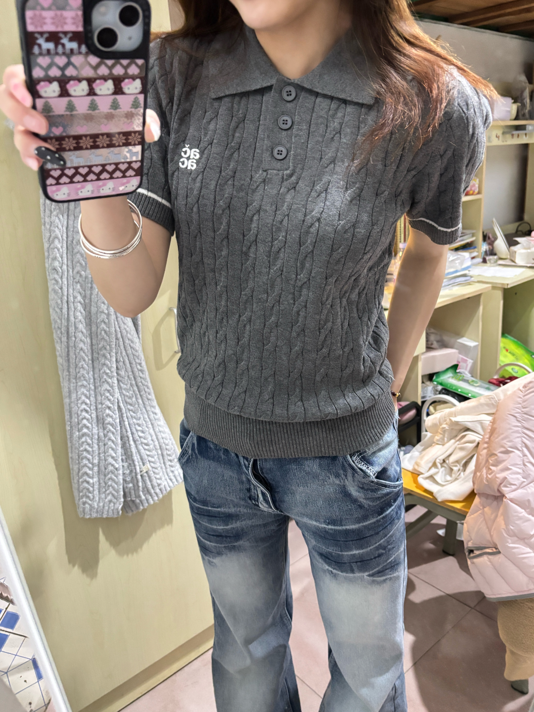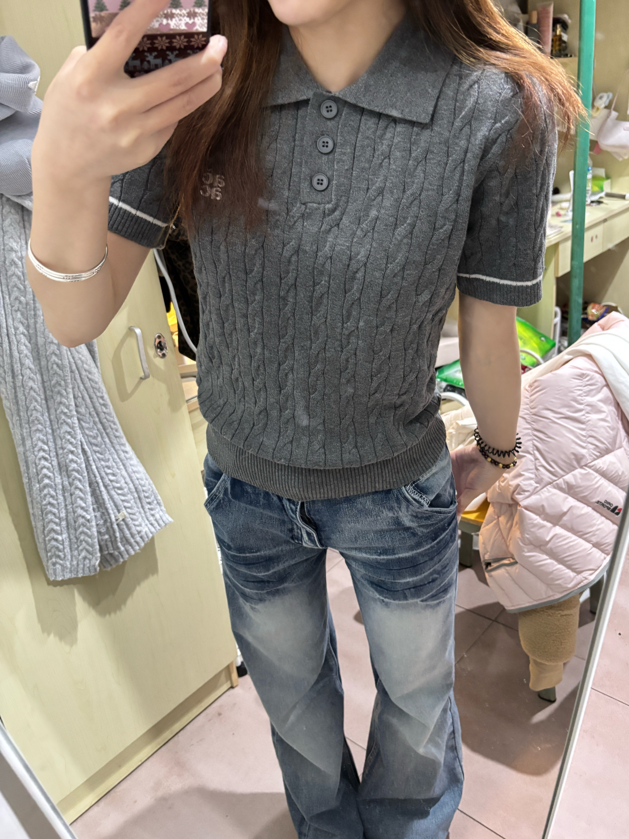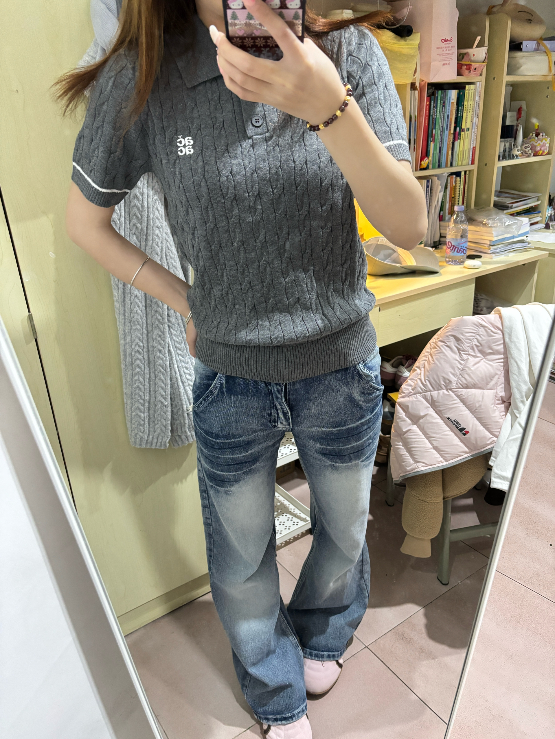 谁懂啊!这件灰色绞花Polo针织衫真的太有质感了🥹 麻花纹理+撞色包边,简约又高级,修身不紧绷,巨显身材。 搭配做旧微喇牛仔裤,韩系知识分子风直接拉满,通勤上学都适配!