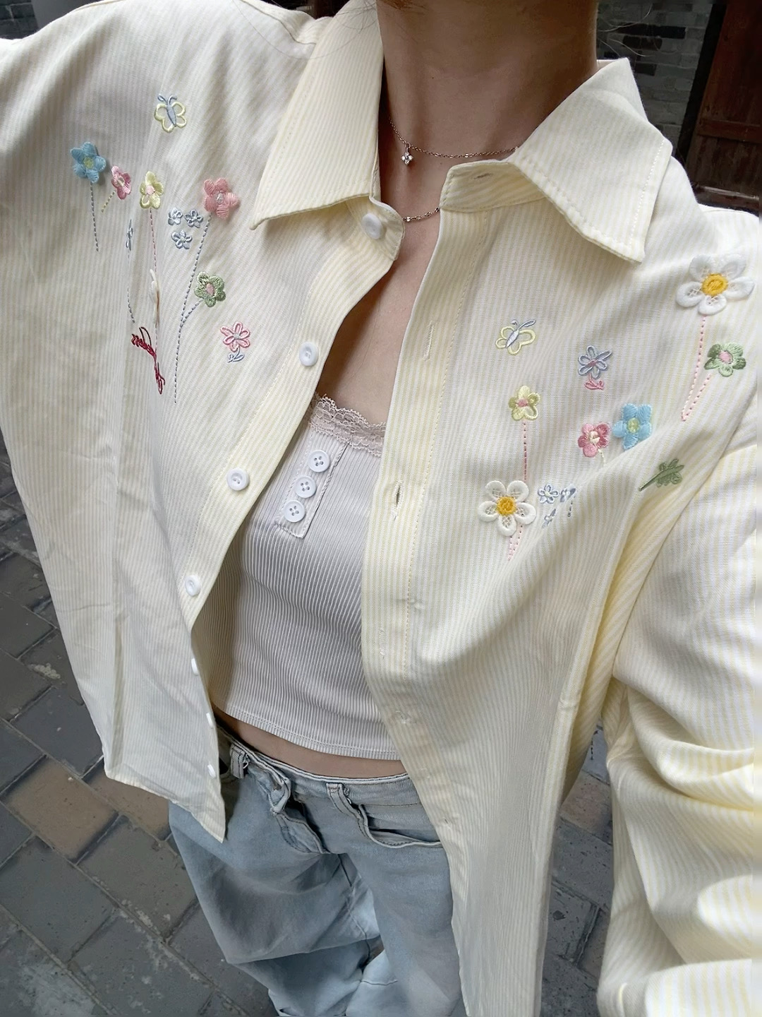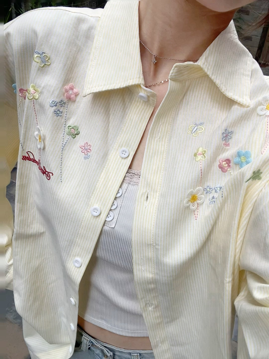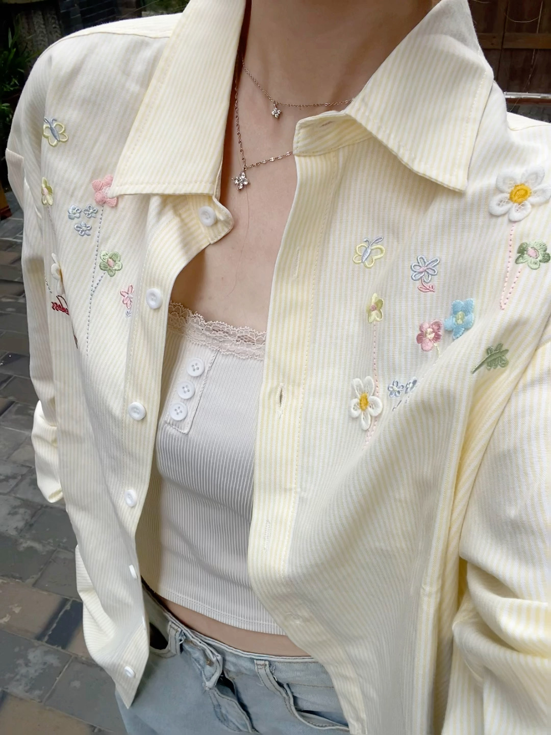 谁懂啊!这件黄白条纹衬衫真的长在我的心巴上~立体刺绣小花花软乎乎的,马卡龙配色超显白,单穿是甜妹,搭牛仔裤又带点随性,春夏穿它出门,感觉连风都是甜甜的~