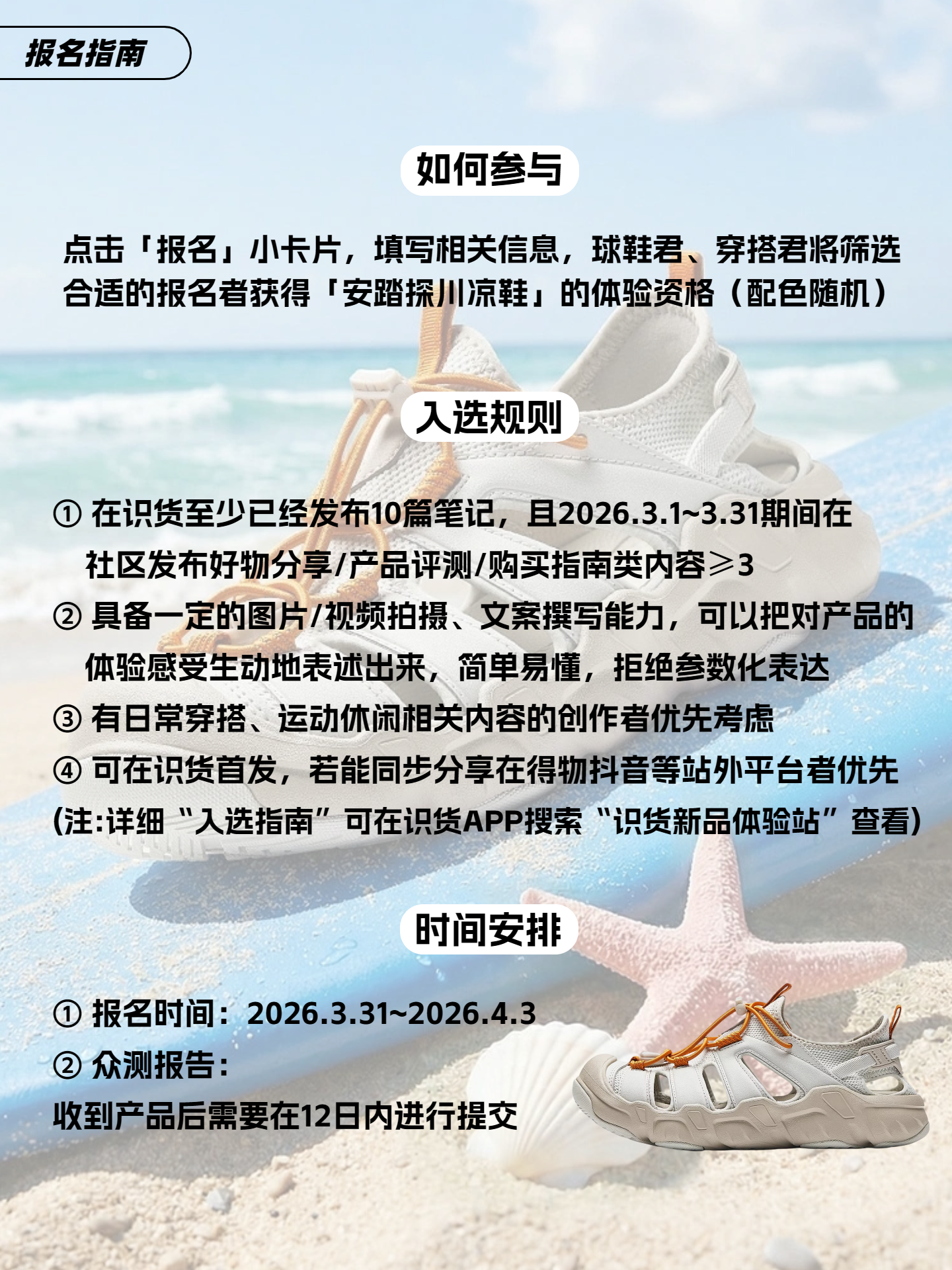 招募人数:10人 【如何参与】 点击「报名」小卡片,填写相关信息,球鞋、穿搭君将筛选合适的报名者获得「安踏探川凉鞋」的体验资格 【入选规则】 1、在识货至少已经发布10篇笔记,且2026.3.1~3.31期间,在社区发布好物分享/产品评测/购买指南类内容 2、具备一定的图片/视频拍摄、文案撰写能力,可以把对产品的体验感受生动地表述出来,简单易懂,拒绝参数化表达 3、有日常穿搭、运动休闲内容的创...
