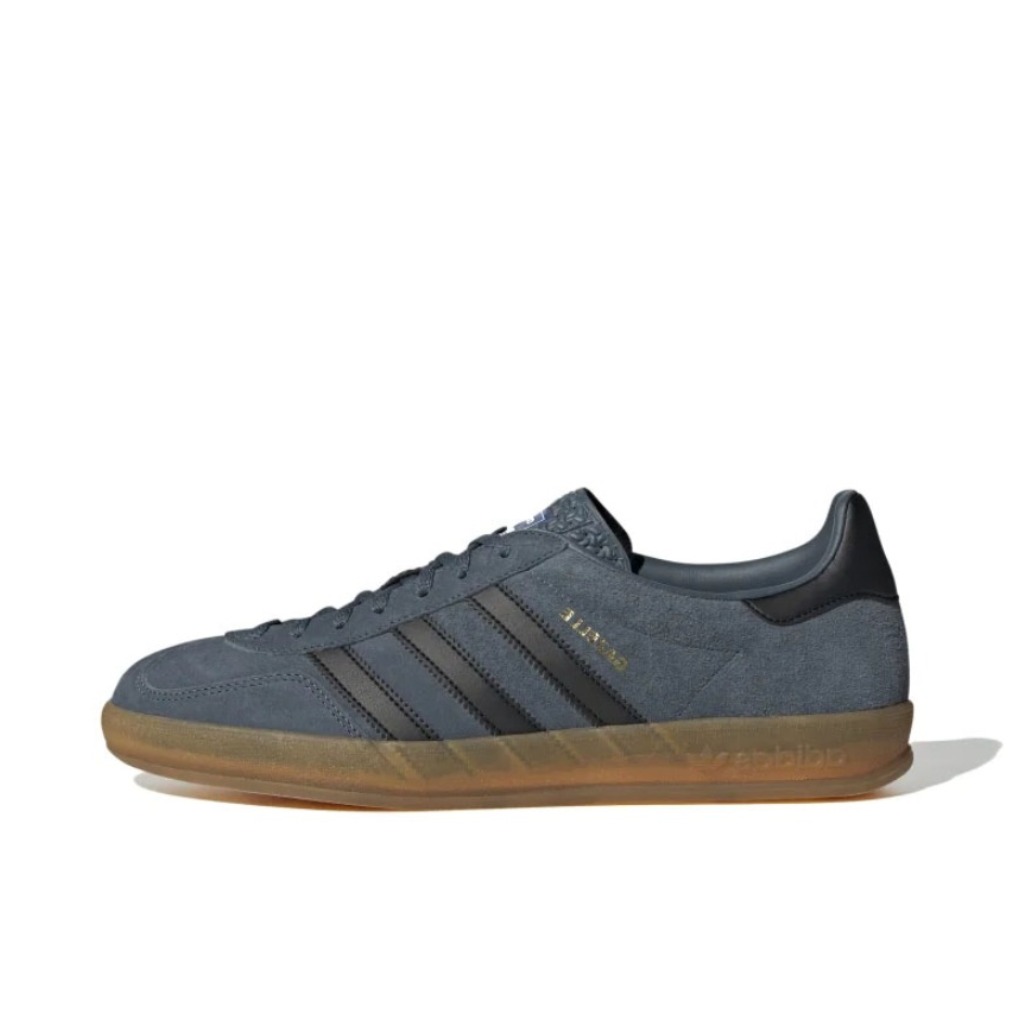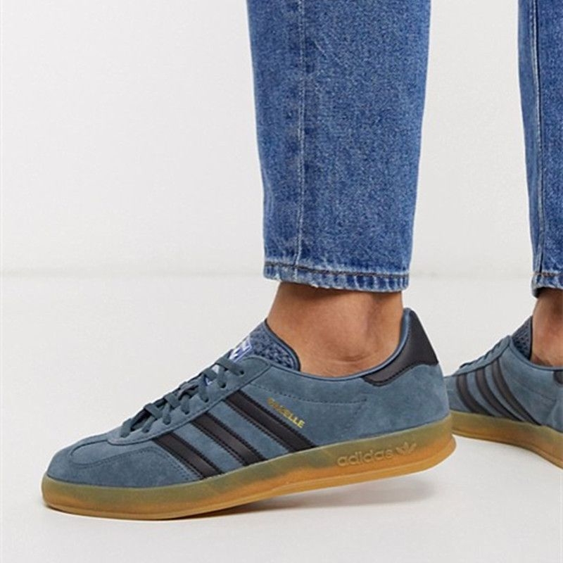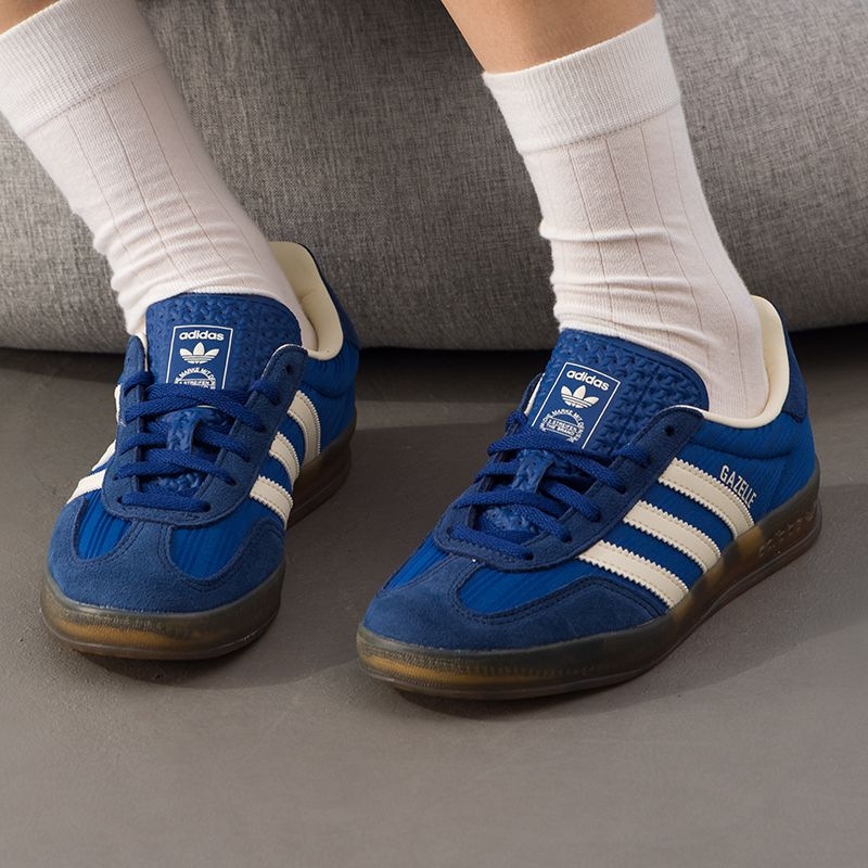 👟球鞋名称:adidas Originals GAZELLE INDOOR 🔍分享理由 这是阿迪达斯三叶草经典复古德训鞋,也是当下潮流圈热门的「T头鞋」之一 ✨ 核心特征 - 材质:鞋面采用绒面革(麂皮),质感柔软复古,搭配标志性三条纹与后跟白色皮革贴片。 - 配色:图中为经典蓝白+生胶底配色,明亮蓝色与半透明生胶底形成复古学院风,视觉清爽。 - 设计:低帮版型,鞋型修长,鞋舌压印三叶草徽标,侧...