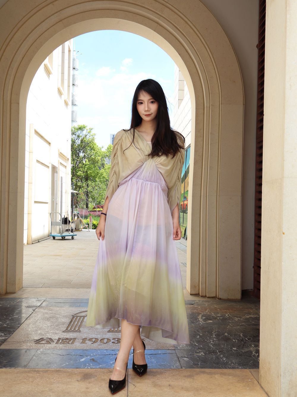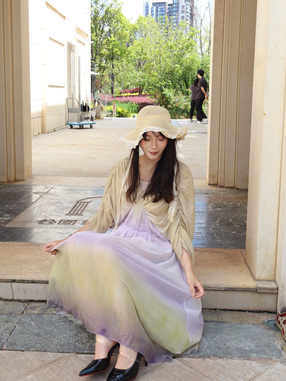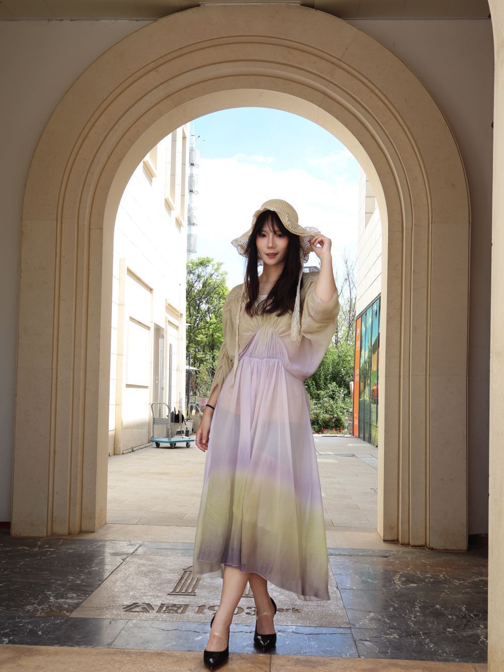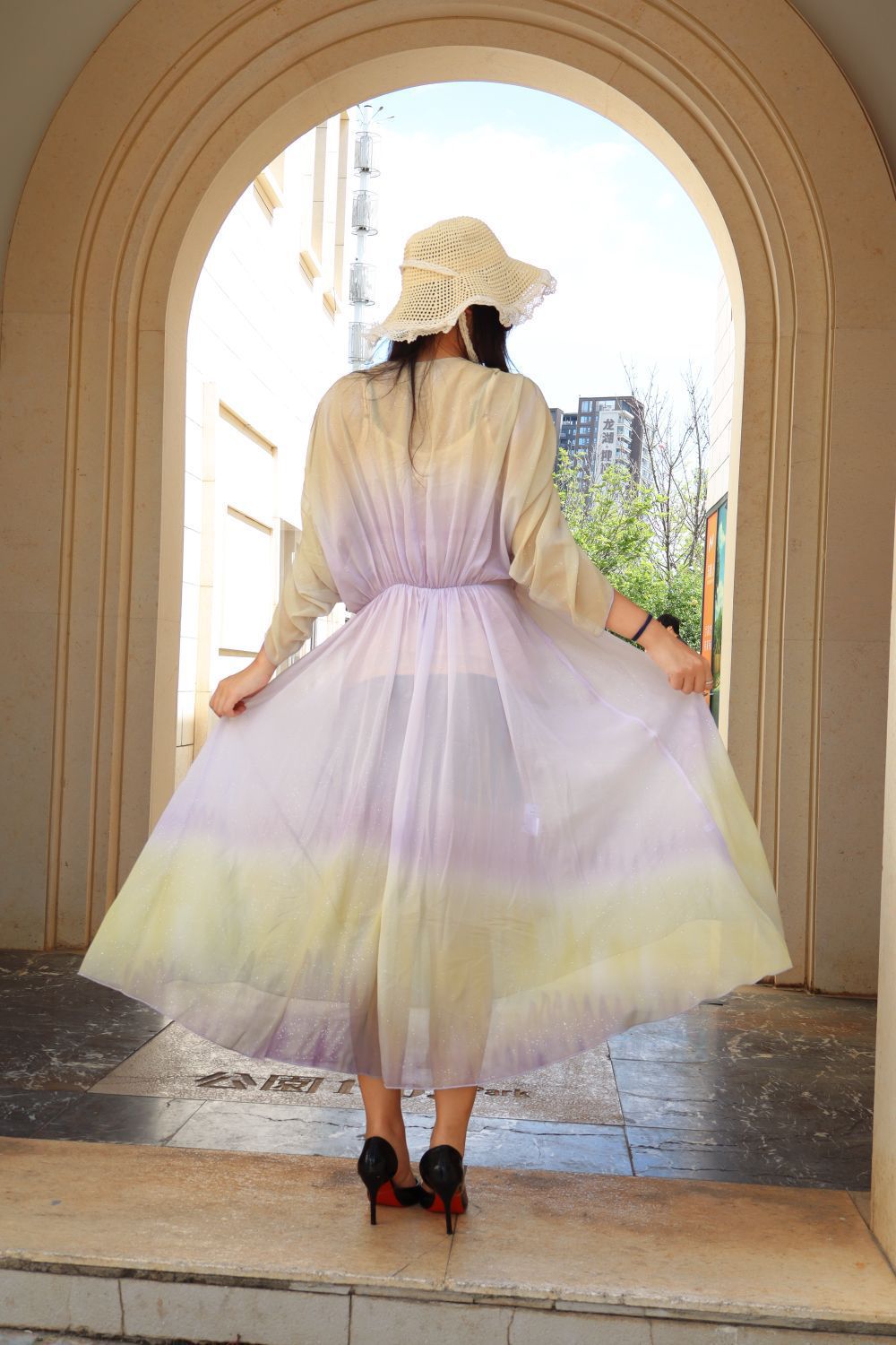 黄紫渐变也太绝了吧!自带柔光滤镜的氛围感直接拉满,薄纱面料轻盈到像裹了层云,转个圈裙摆飘起来的瞬间,整个人都在发光,宽松版型完全不挑身材,藏肉显瘦一把好手,还自带细闪小心机,阳光下blingbling的超灵动!草帽+高跟鞋一搭,度假感、氛围感直接焊在身上,日常穿温柔,拍照出片率100%,夏天穿清爽又仙气,谁穿谁是氛围感美女。