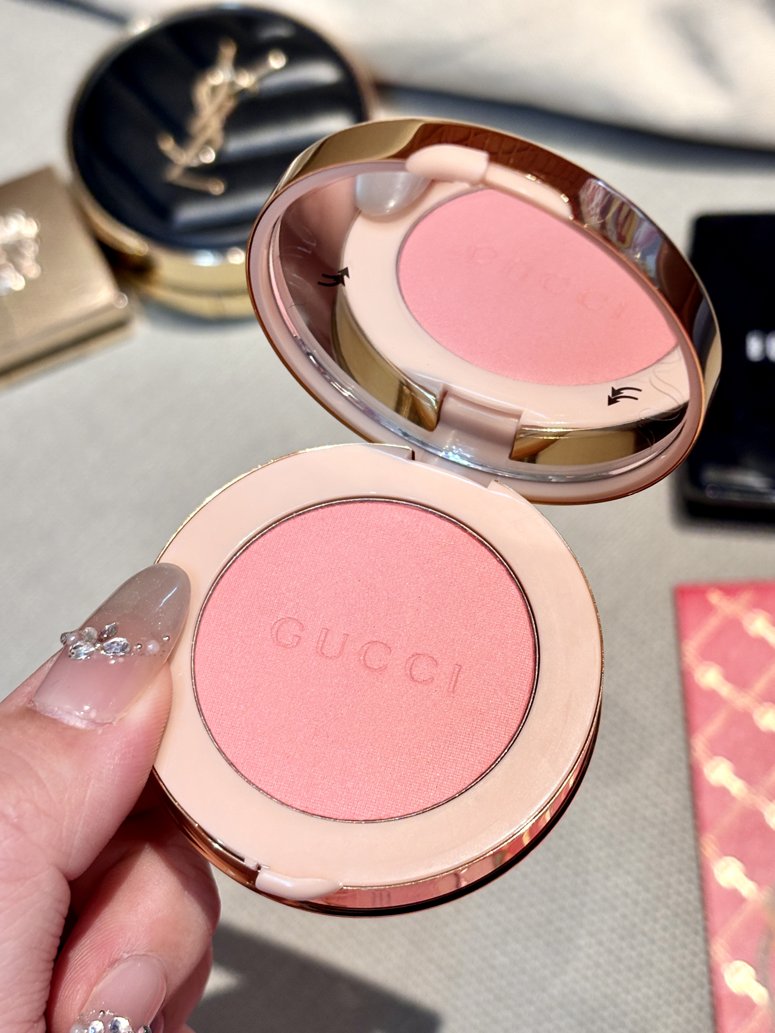 Gucci这款腮红真的美到心巴上!金粉外壳颜值拉满,粉质细腻软糯,上脸是自然的蜜桃粉,温柔又提气色。 显色度适中,新手也不怕重手,打造自然的氛围感腮红。持妆久不飞粉,黄皮白皮都适配,日常通勤、约会都合适,是颜值与实力并存的宝藏腮红!