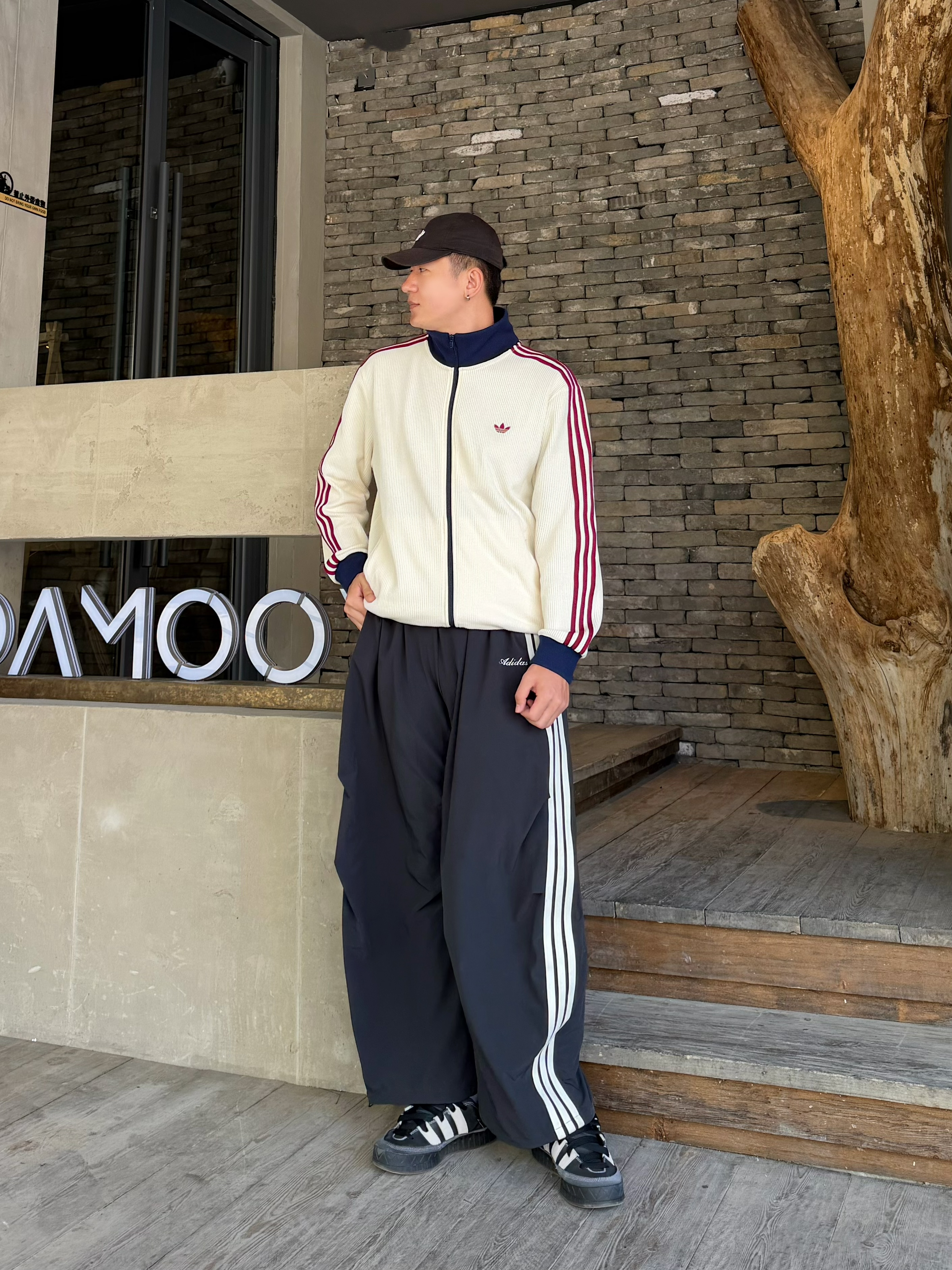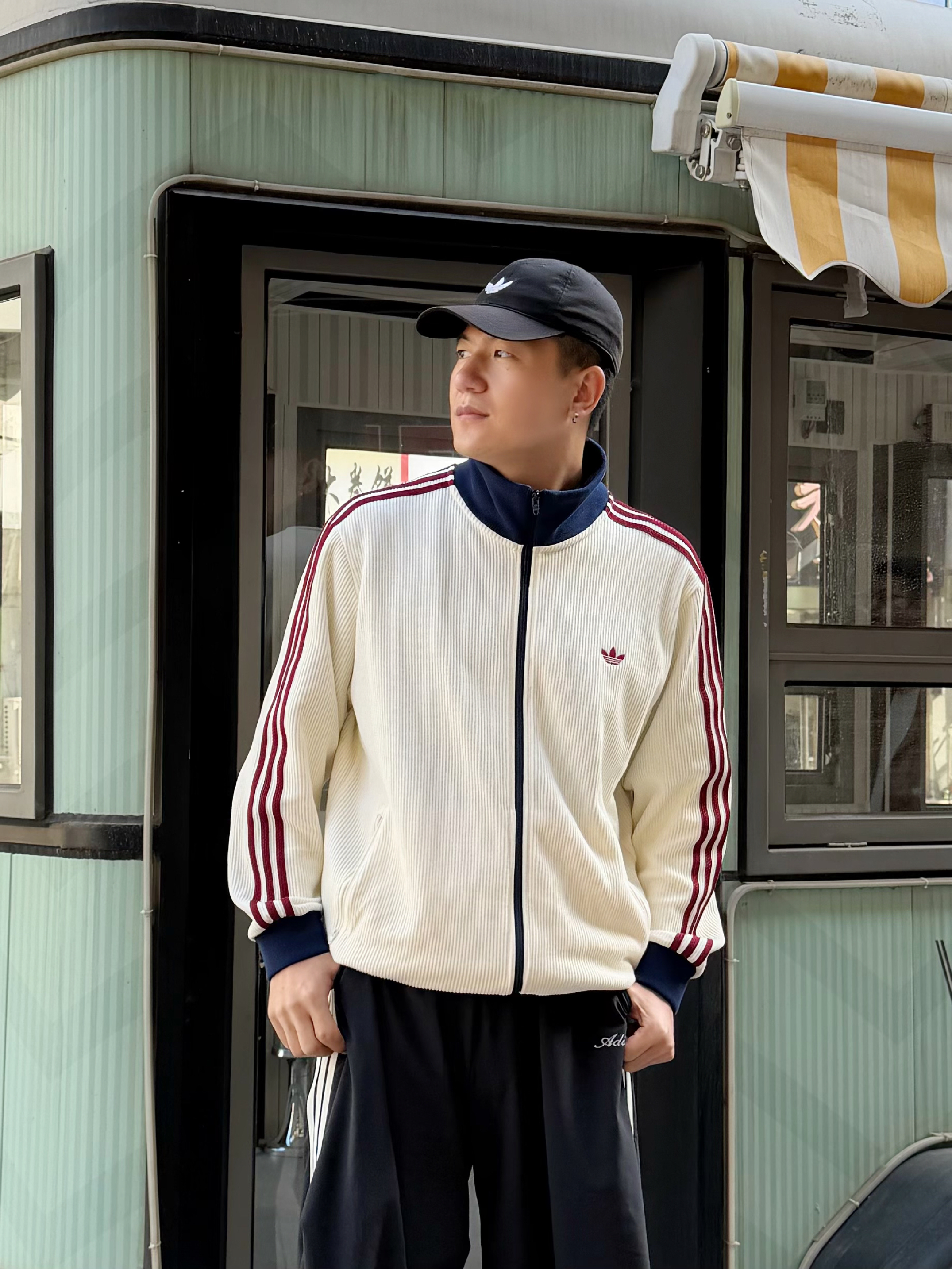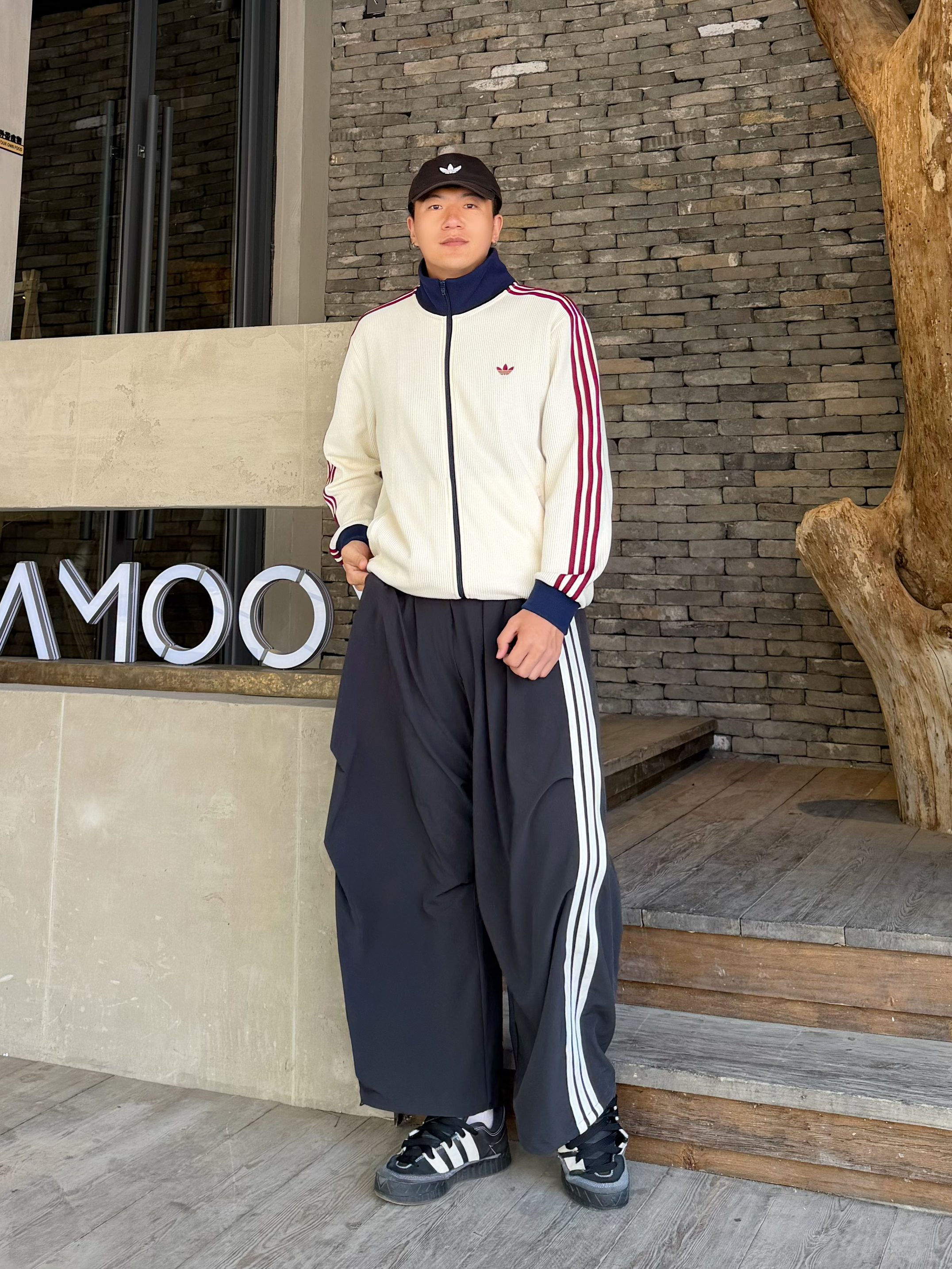 潮人的春天真的来了🍃 上身这件Adidas乳白色华夫格外套 藏蓝立领撞酒红条纹,三色拼得刚刚好 上身很有活力💯 下身搭条Adidas黑色伞兵裤,宽松阔腿随性舒服 踩双阿迪黑板鞋,一套下来松弛感很不错😎 好看又百搭,复古运动感拿捏了 👦🏻:188 | 85 🧥:XXL 👖:XL