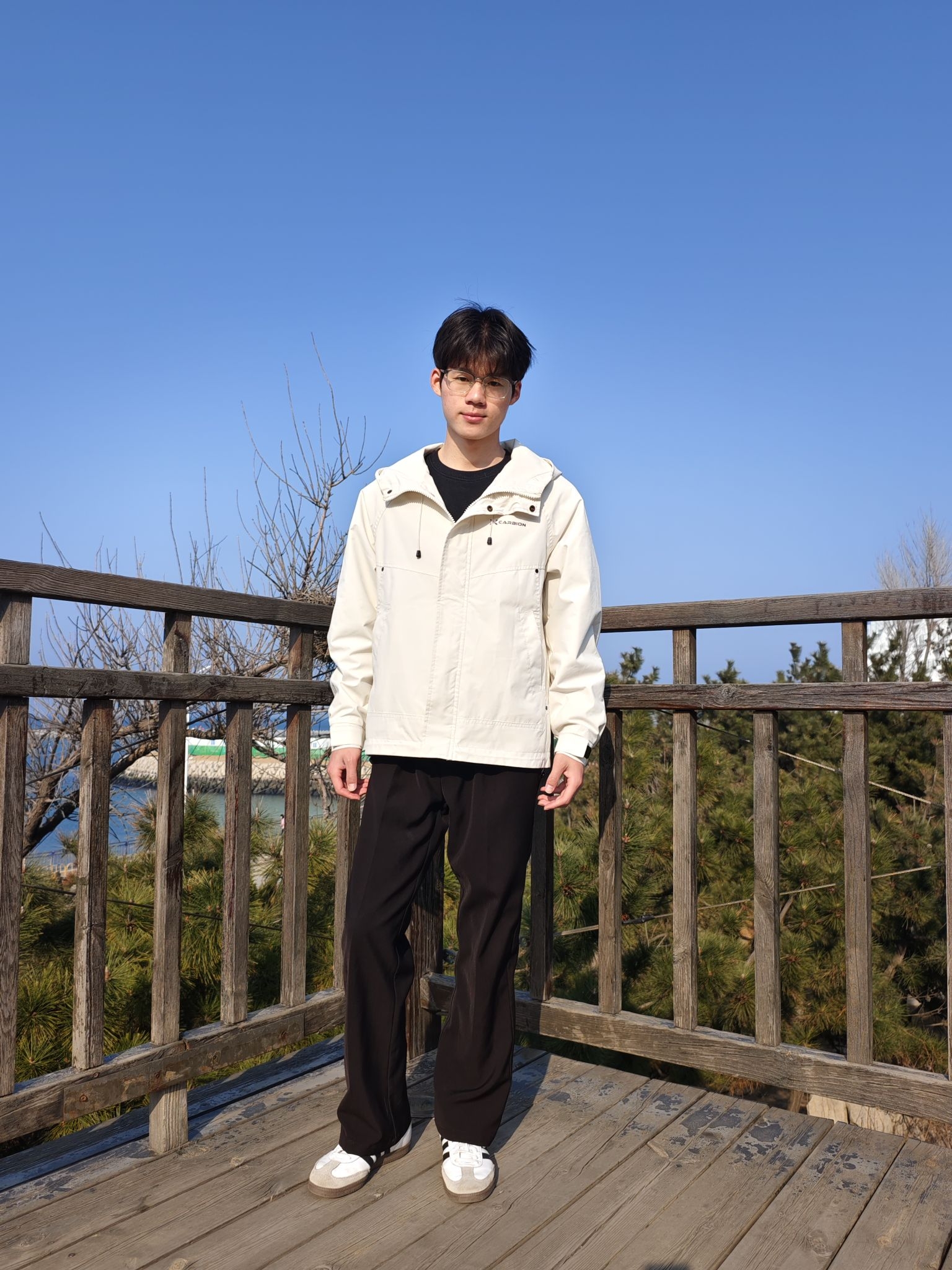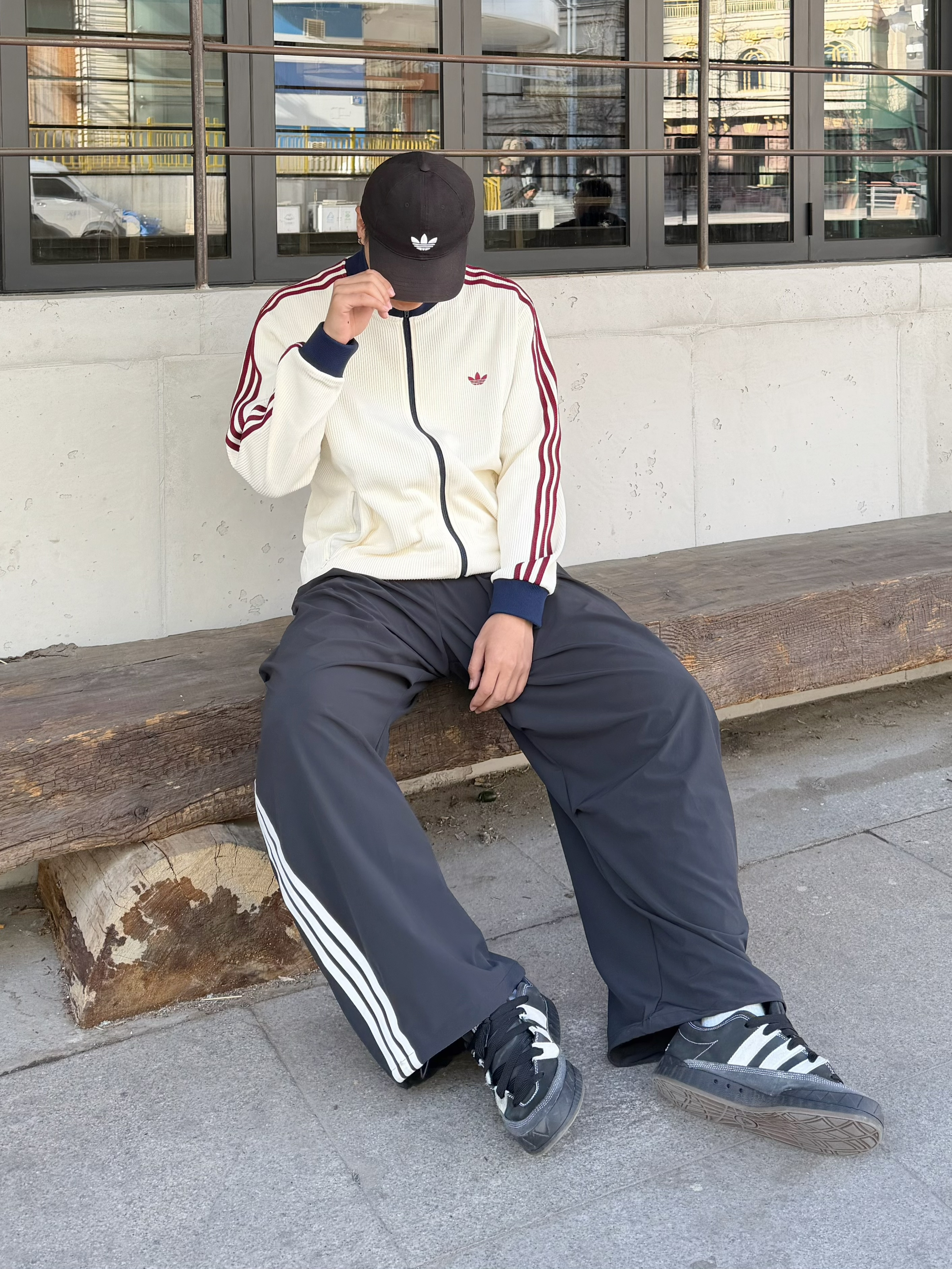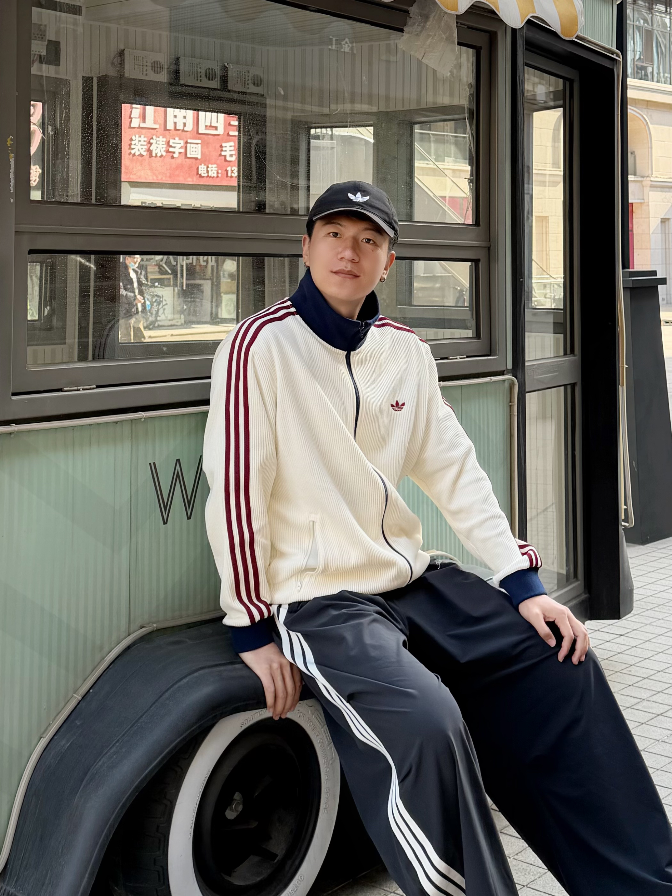 潮人的春天真的来了🍃 上身这件Adidas乳白色华夫格外套 藏蓝立领撞酒红条纹,三色拼得刚刚好 上身很有活力💯 下身搭条Adidas黑色伞兵裤,宽松阔腿随性舒服 踩双阿迪黑板鞋,一套下来松弛感很不错😎 好看又百搭,复古运动感拿捏了 👦🏻:188 | 85 🧥:XXL 👖:XL