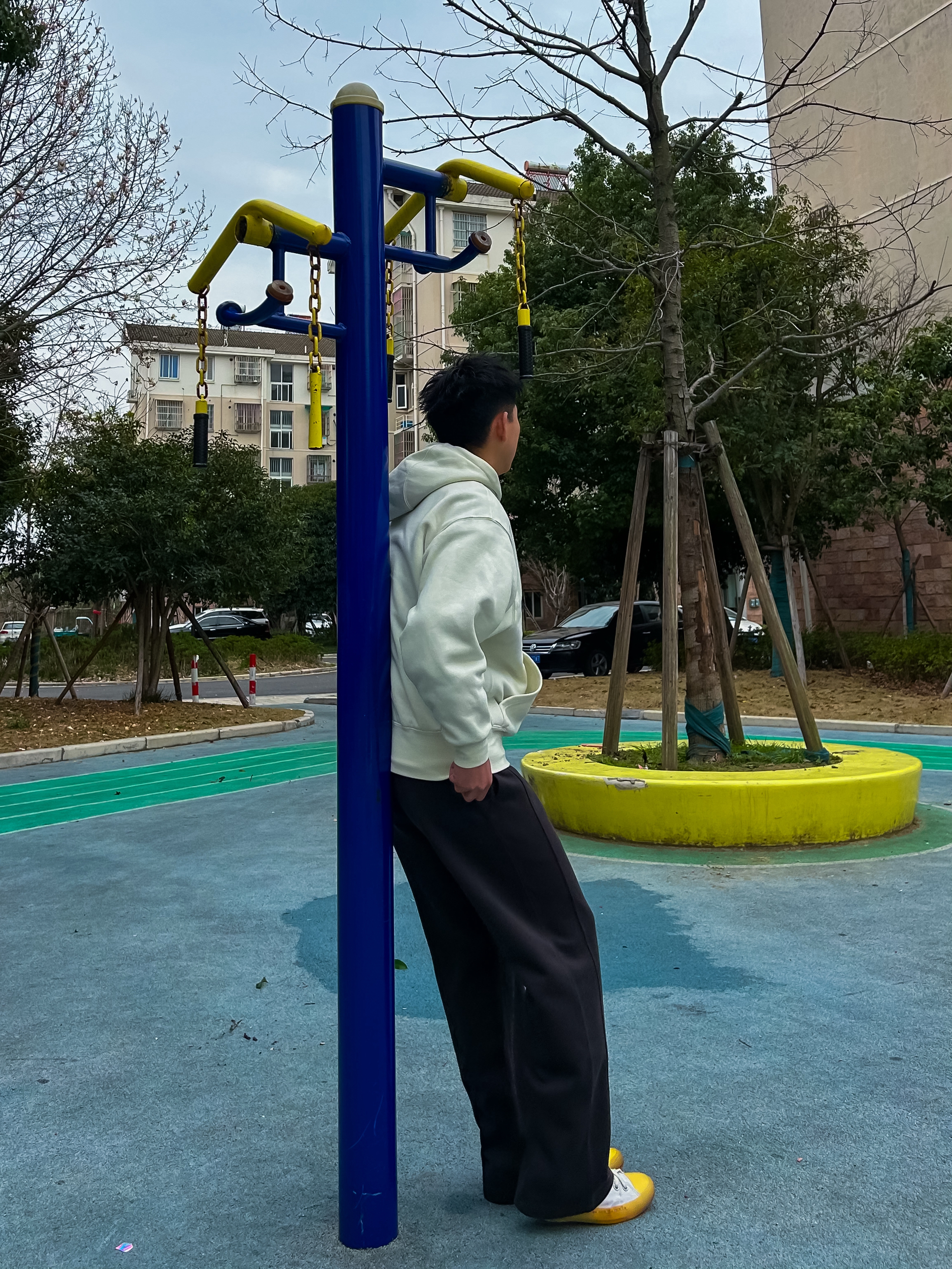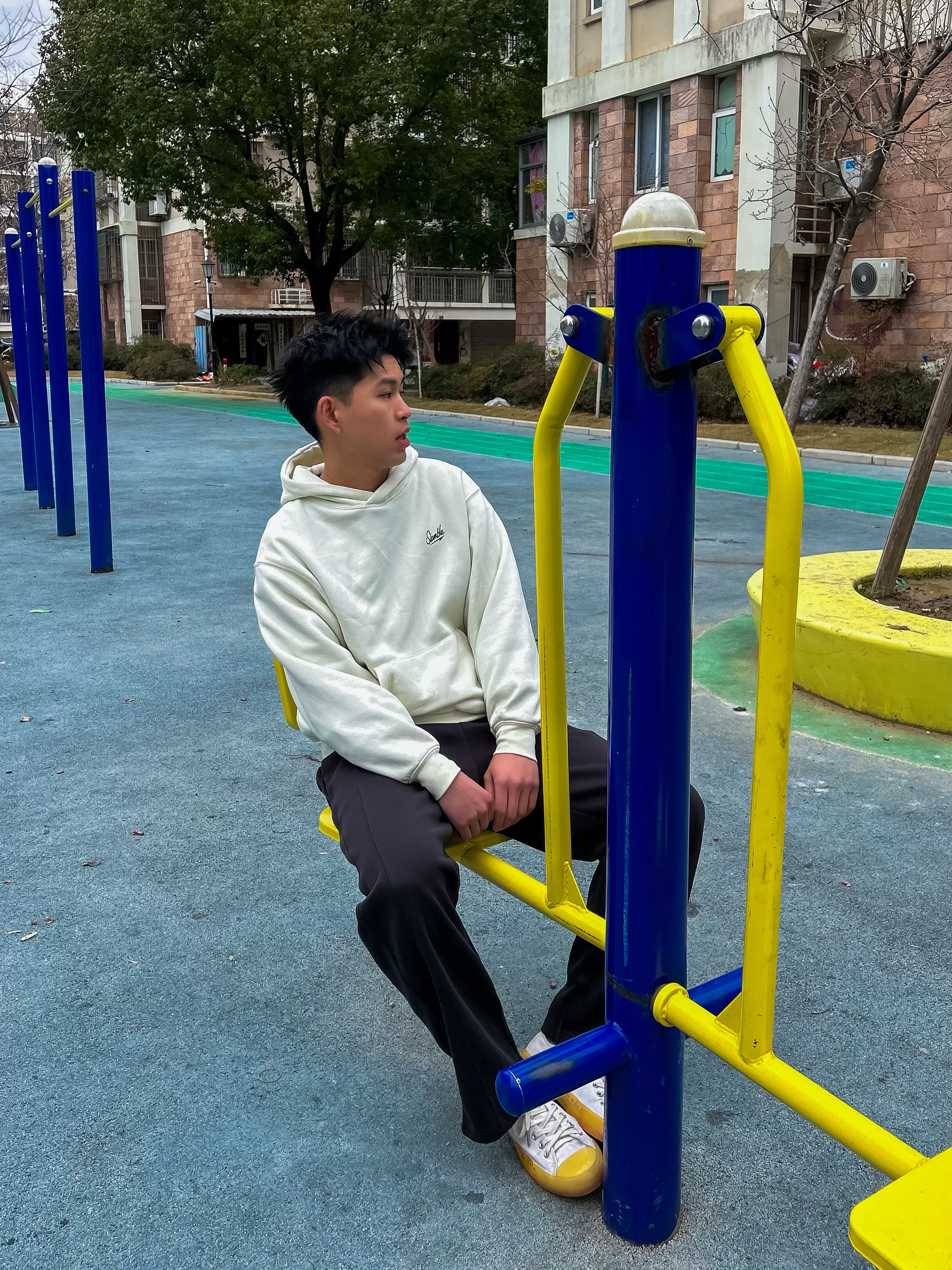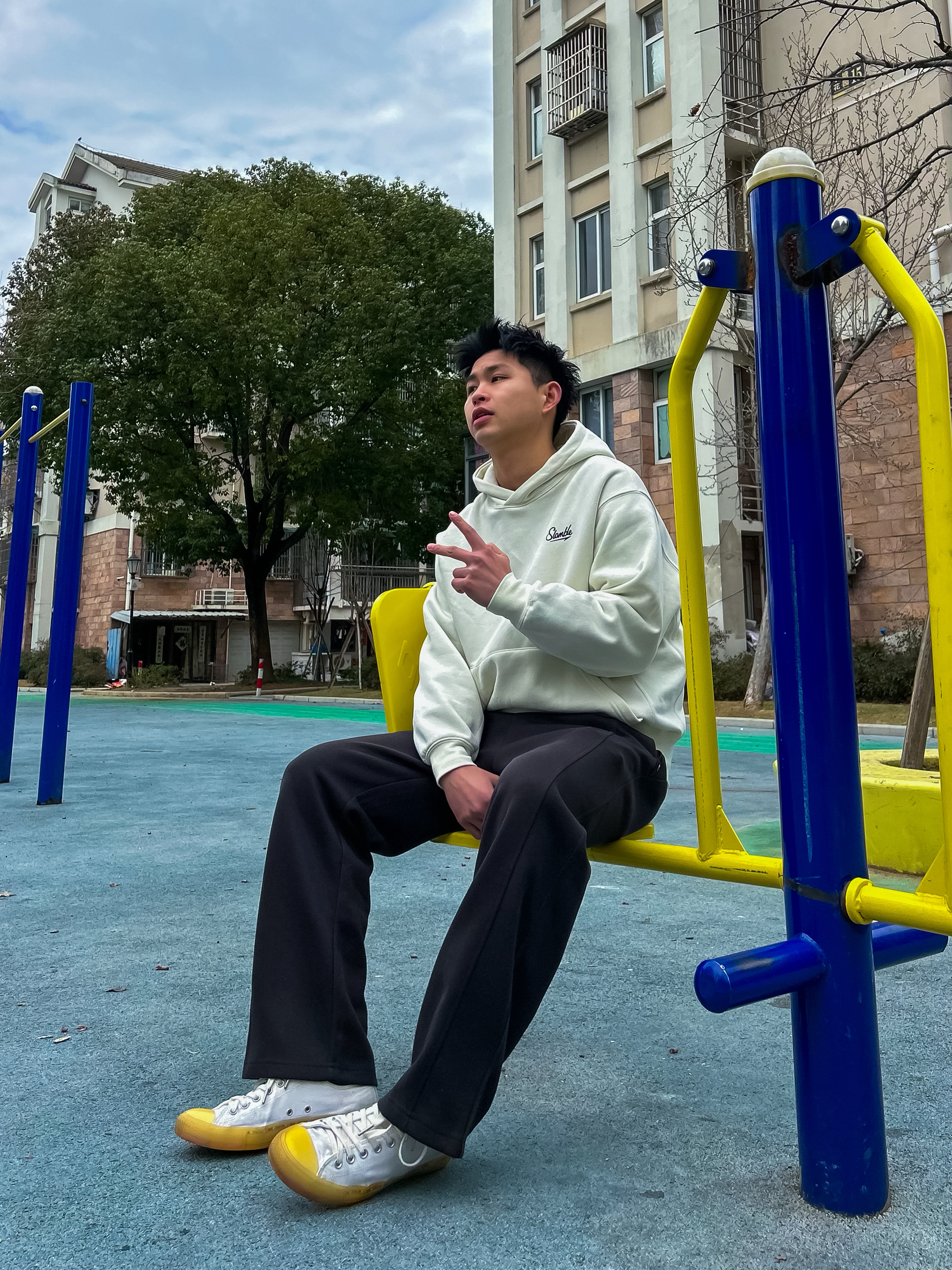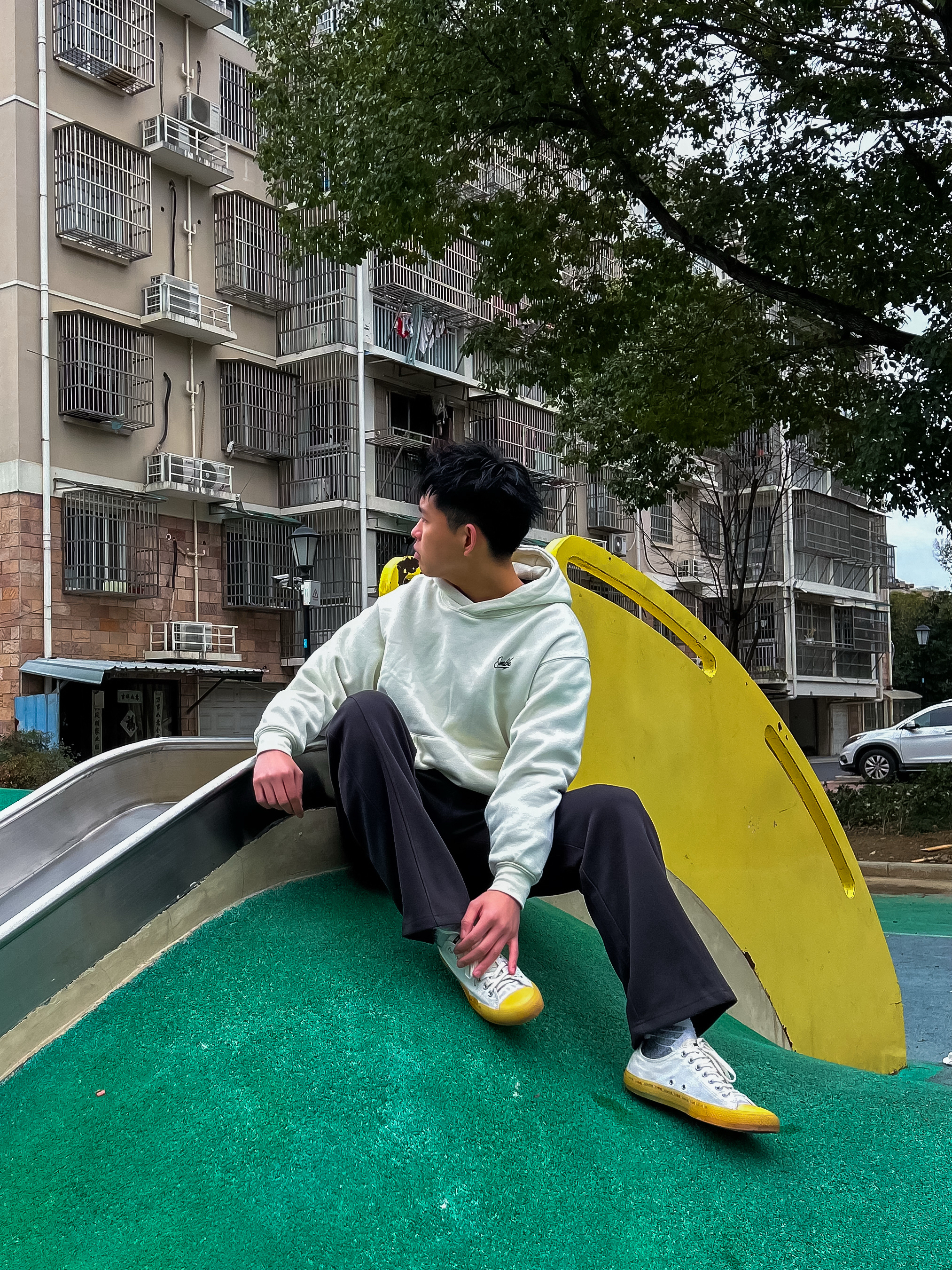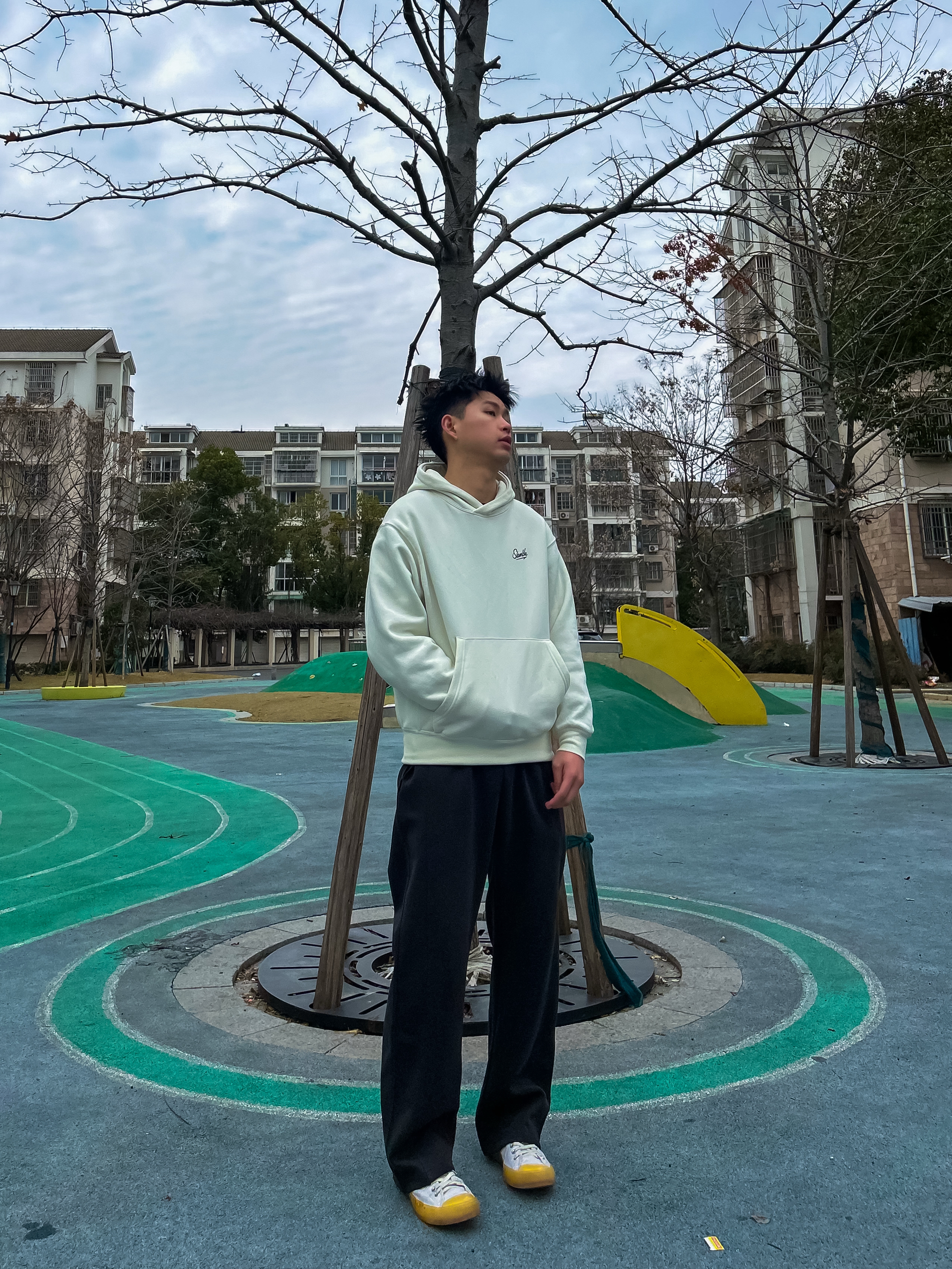 哈咯,这里是卢_SG 穿上这套走在小区楼下 风吹过感觉整个人都松弛下来啦 简约松弛感,主打一个随性自在 奶白色连帽卫衣,干净柔和 胸前小标低调不张扬 搭配垂感黑色直筒裤,利落显瘦 鞋头一抹亮黄,点亮整体,简约中带点小个性。 不费力的少年感穿搭,日常出街无压力。