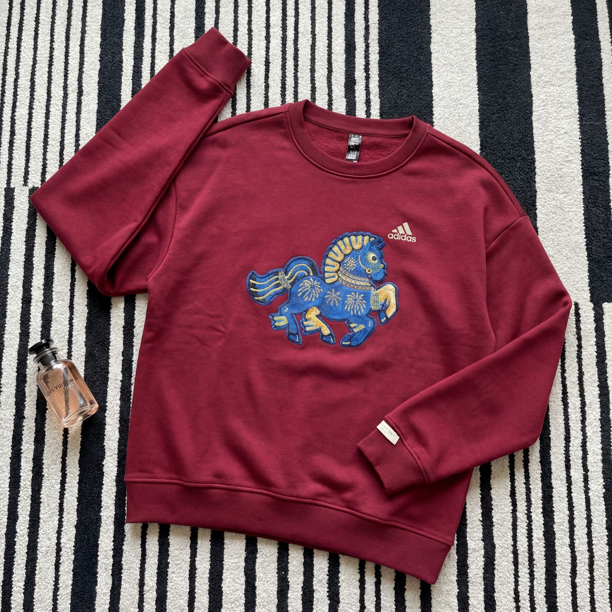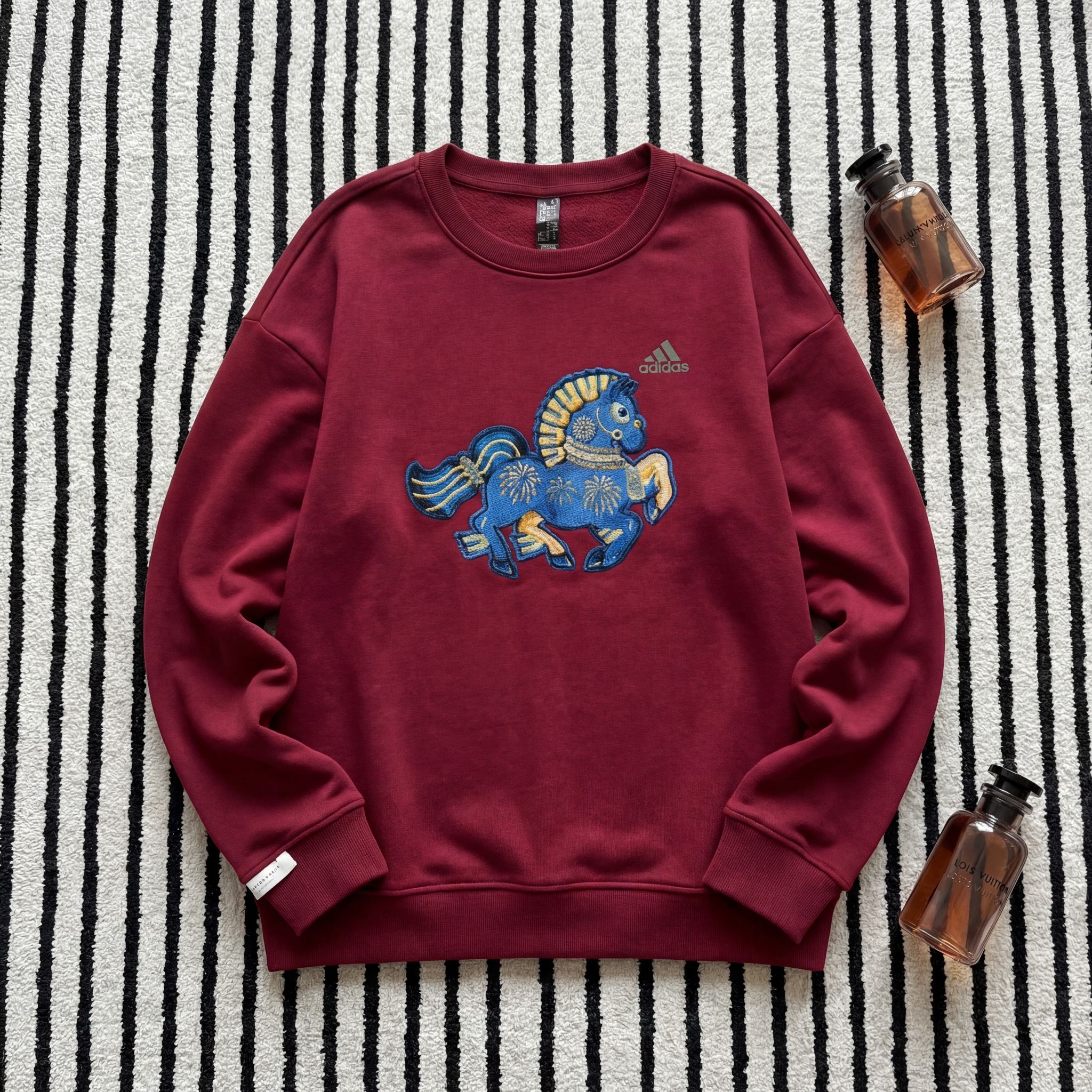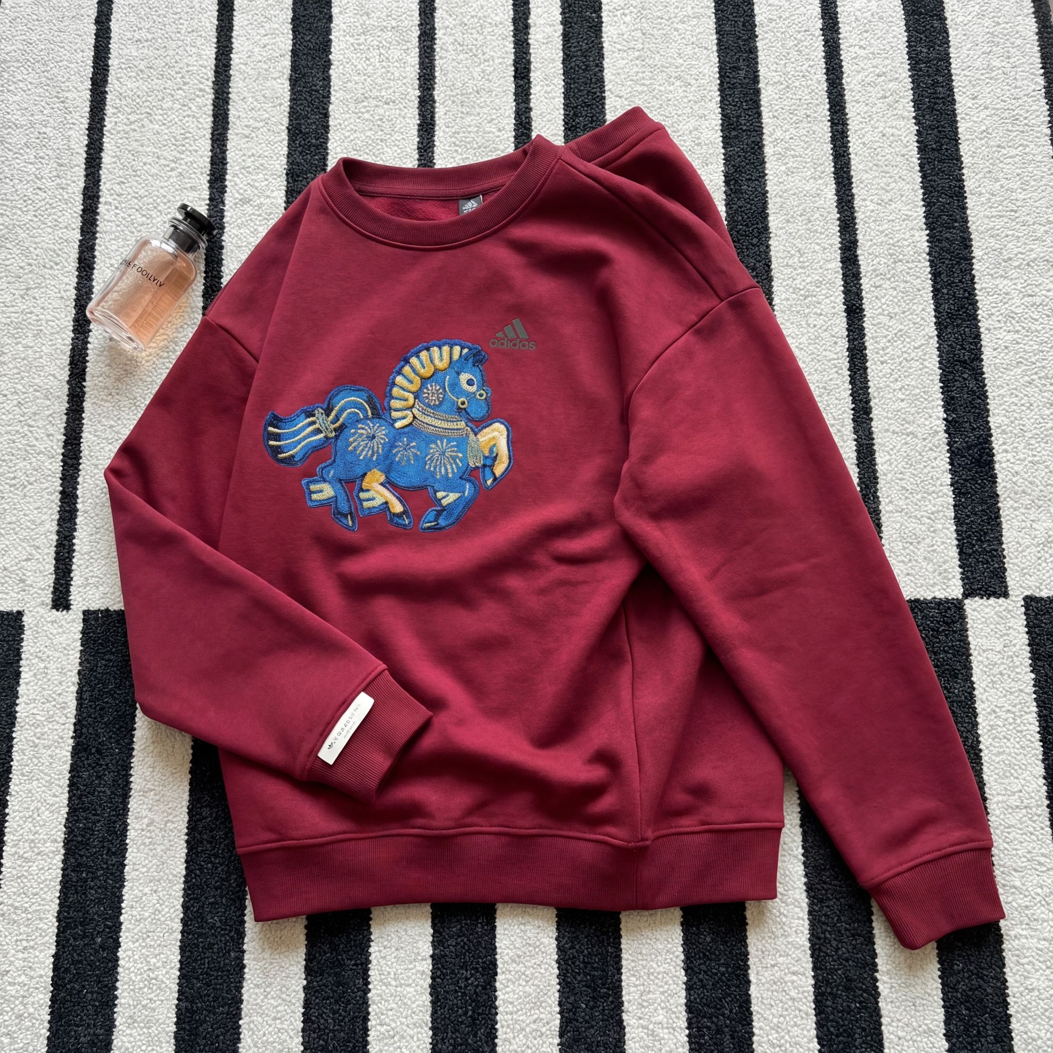 不喜欢太花哨但又想有点设计感?这件卫衣真的踩在我的审美点上。 主体是经典酒红色抓绒,摸起来软糯厚实,贴身穿舒服不闷,版型宽松利落,日常穿很显精神。 胸前的蓝马刺绣是灵魂,蓝金丝线绣出的纹理清晰,立体感十足,在酒红底色上特别亮眼,又不会太跳脱,旁边的小logo低调不抢戏。 配工装裤、休闲裤都好看,越看越有味道,属于能穿很久的耐看款。