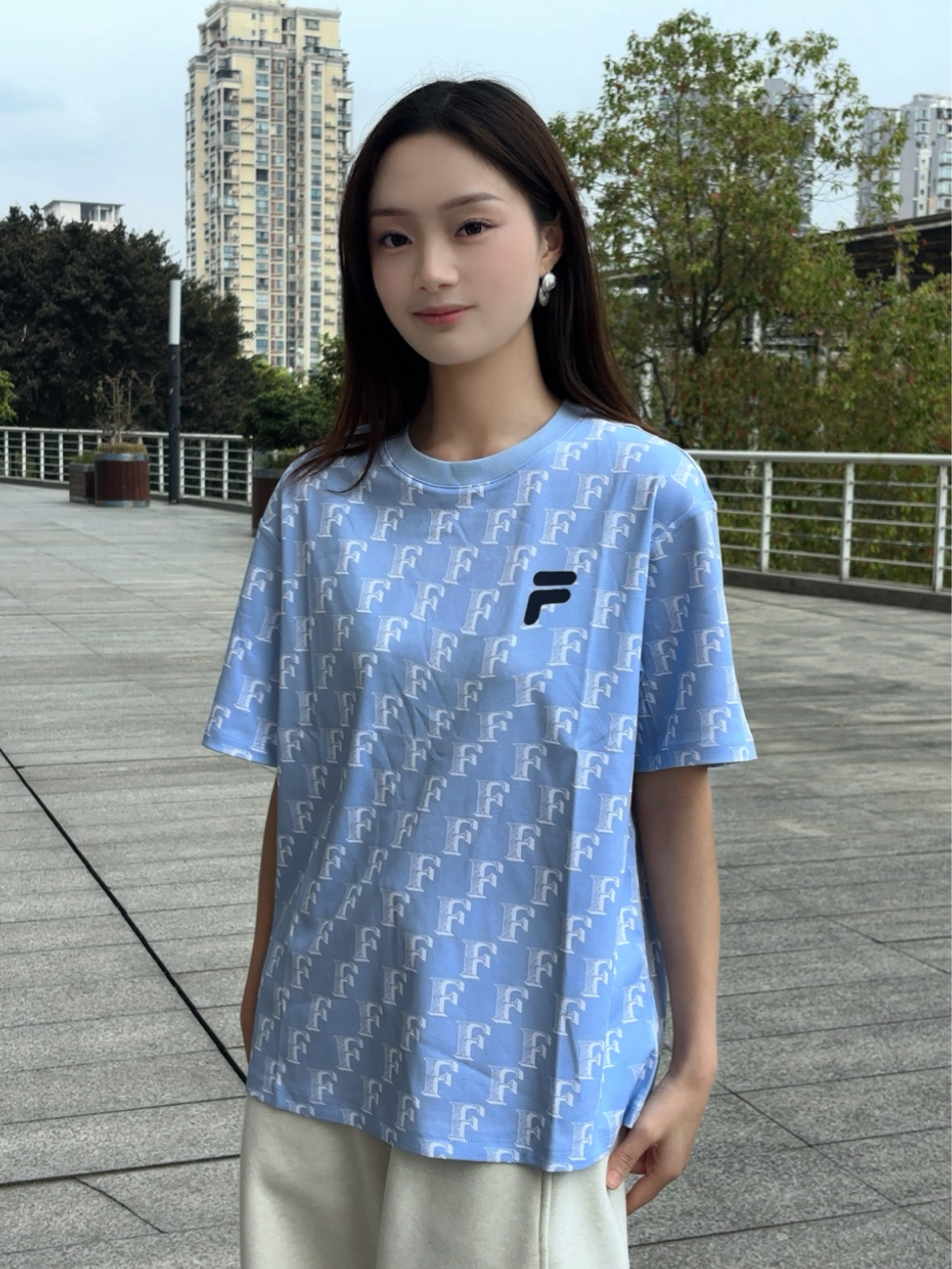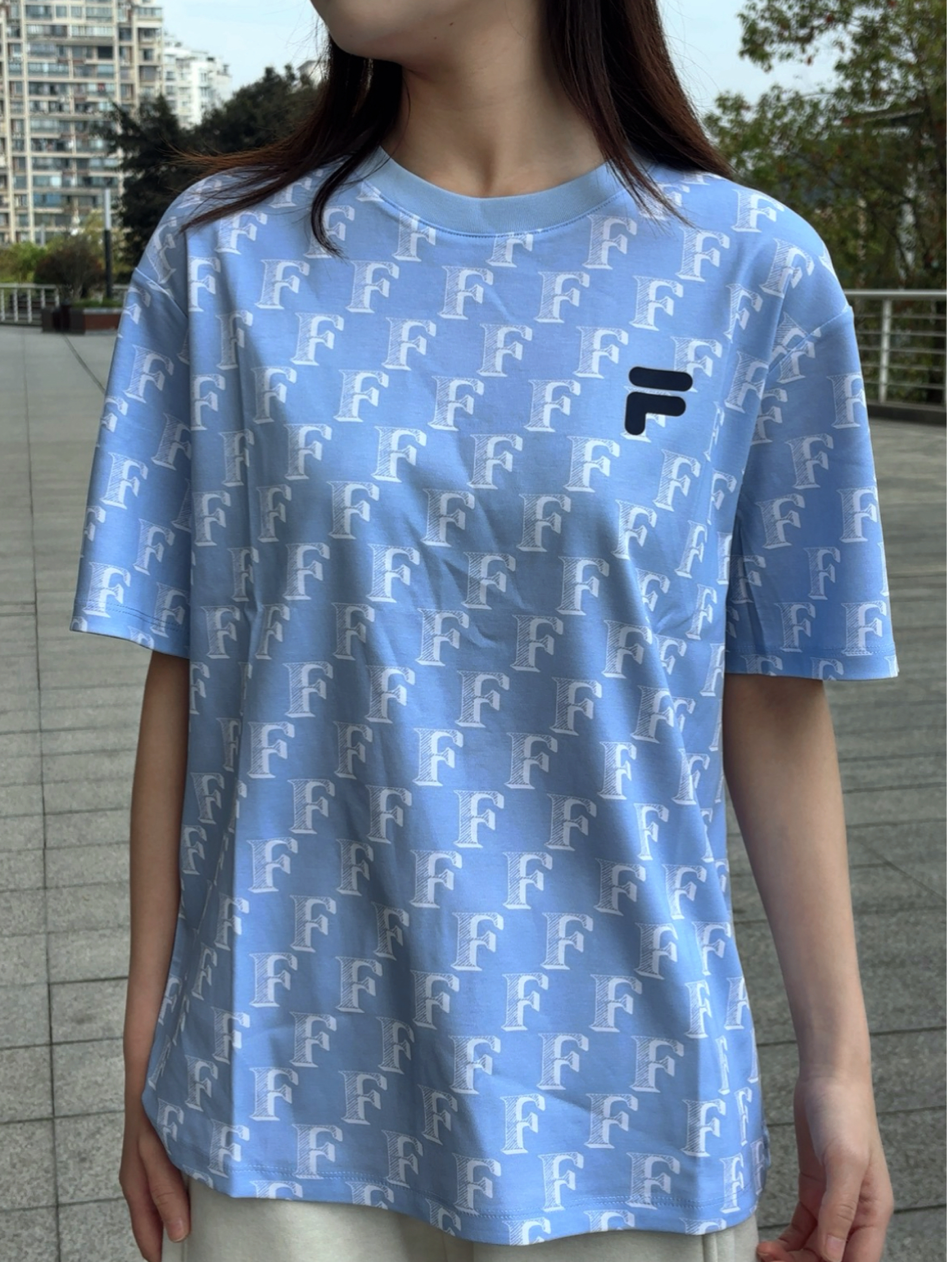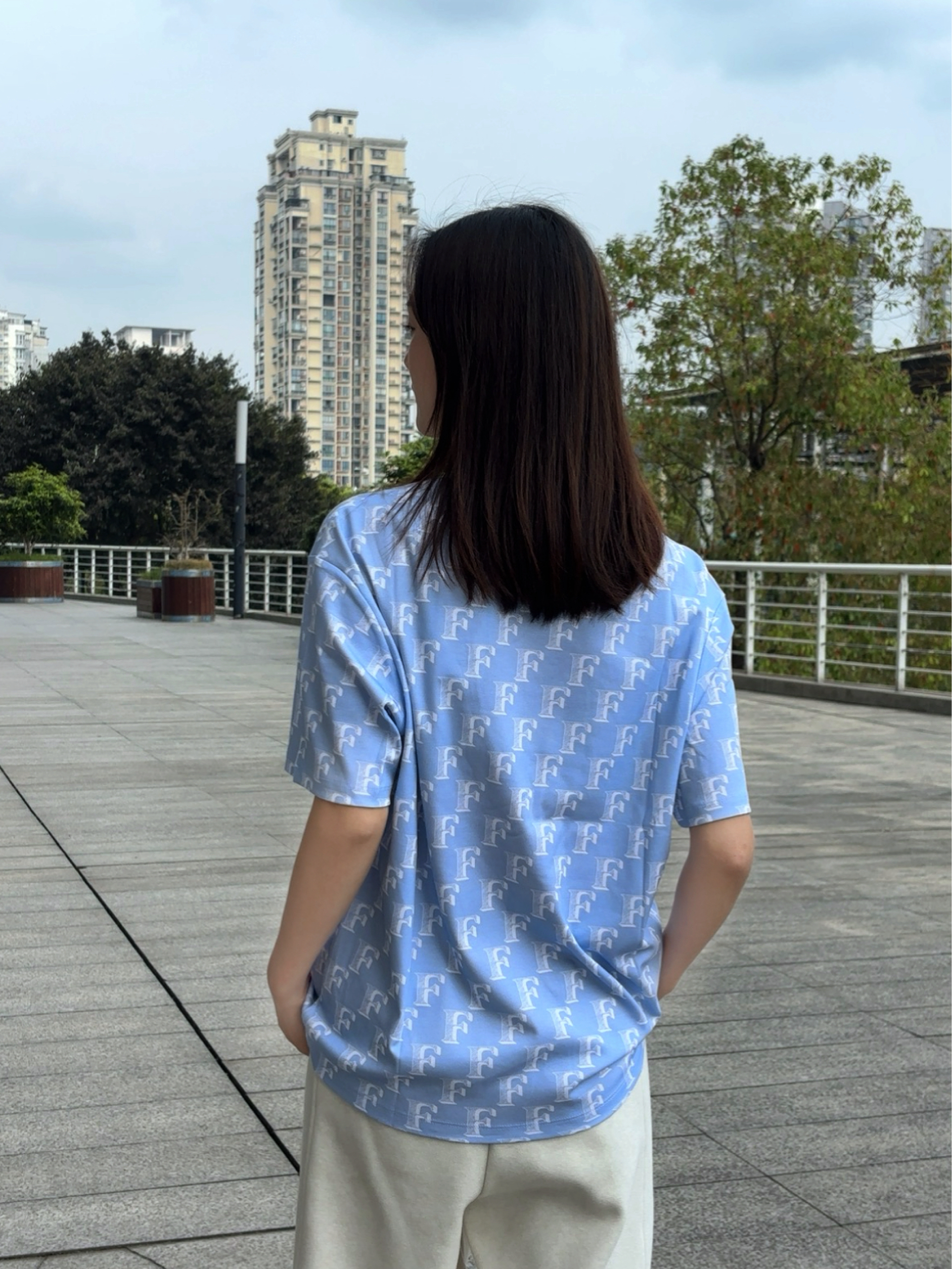 这个奶fufu的浅冰蓝色真的长在我审美上了!看着就清清爽爽的,完全不挑皮,黄皮姐妹也能放心冲,上身好显白,夏天穿自带降温感~ 满印的F字母设计真的太有辨识度了!不是那种密密麻麻的花哨感,反而很有设计感,胸口的小logo简约又精致,细节感拉满,拍照嘎嘎出片!