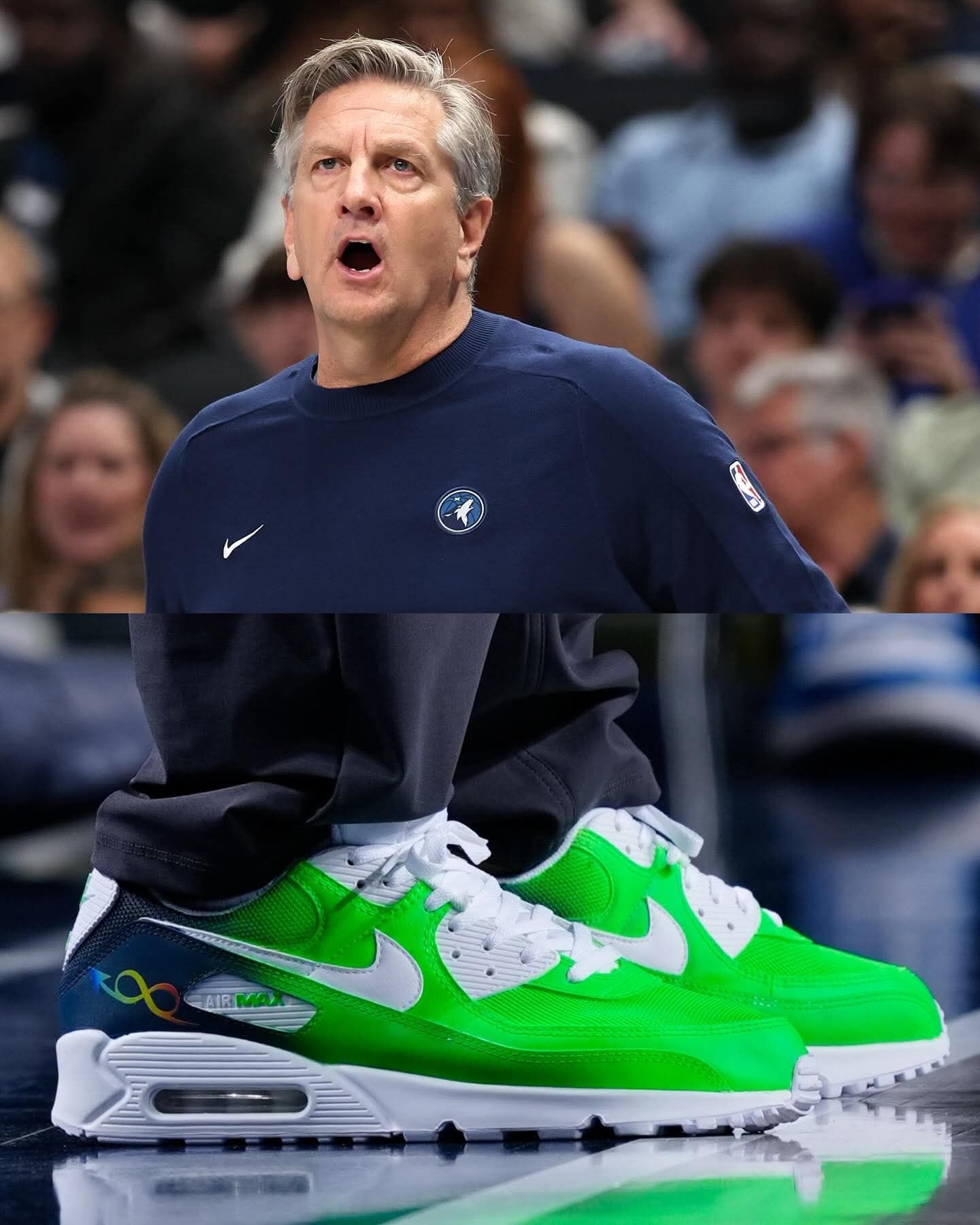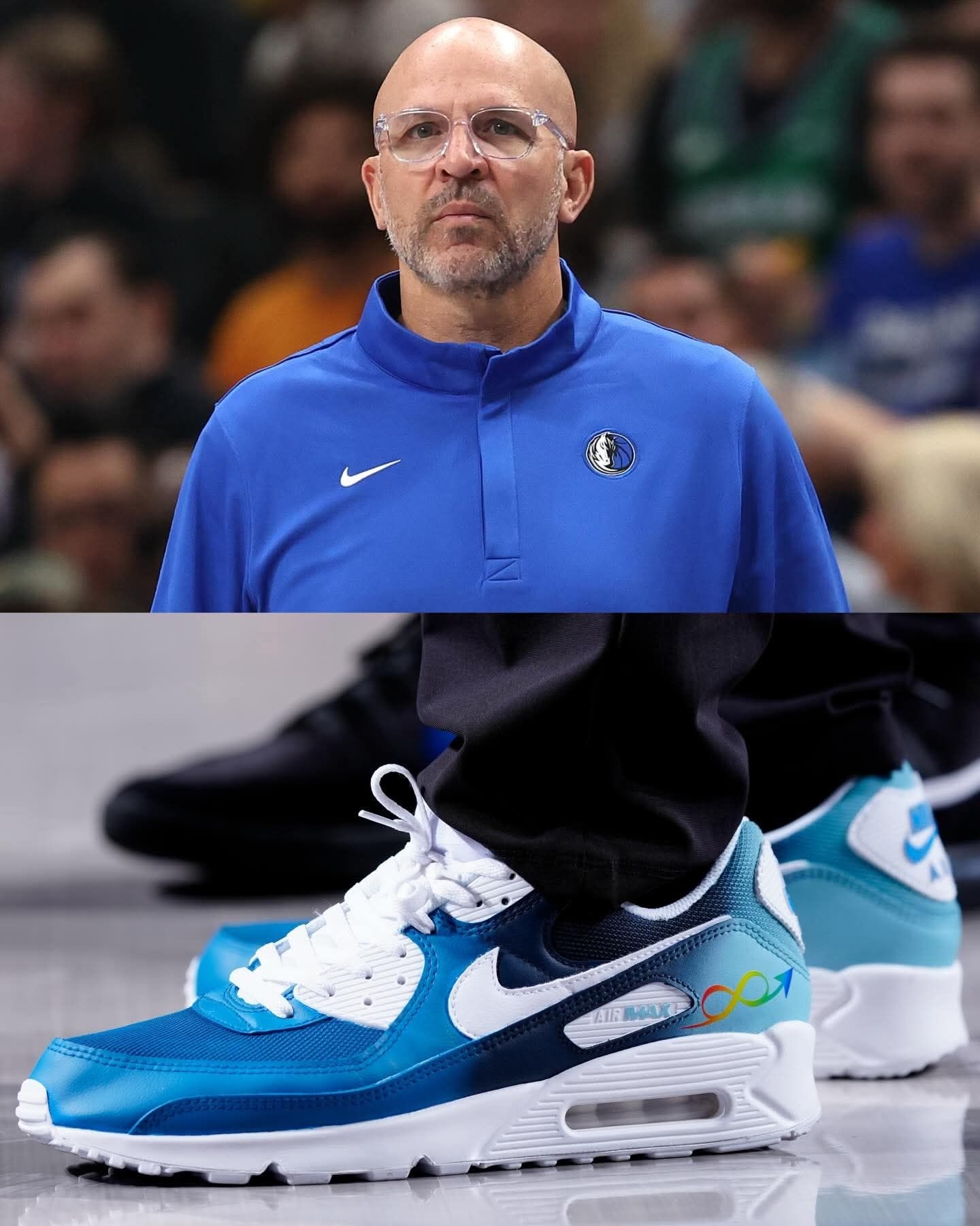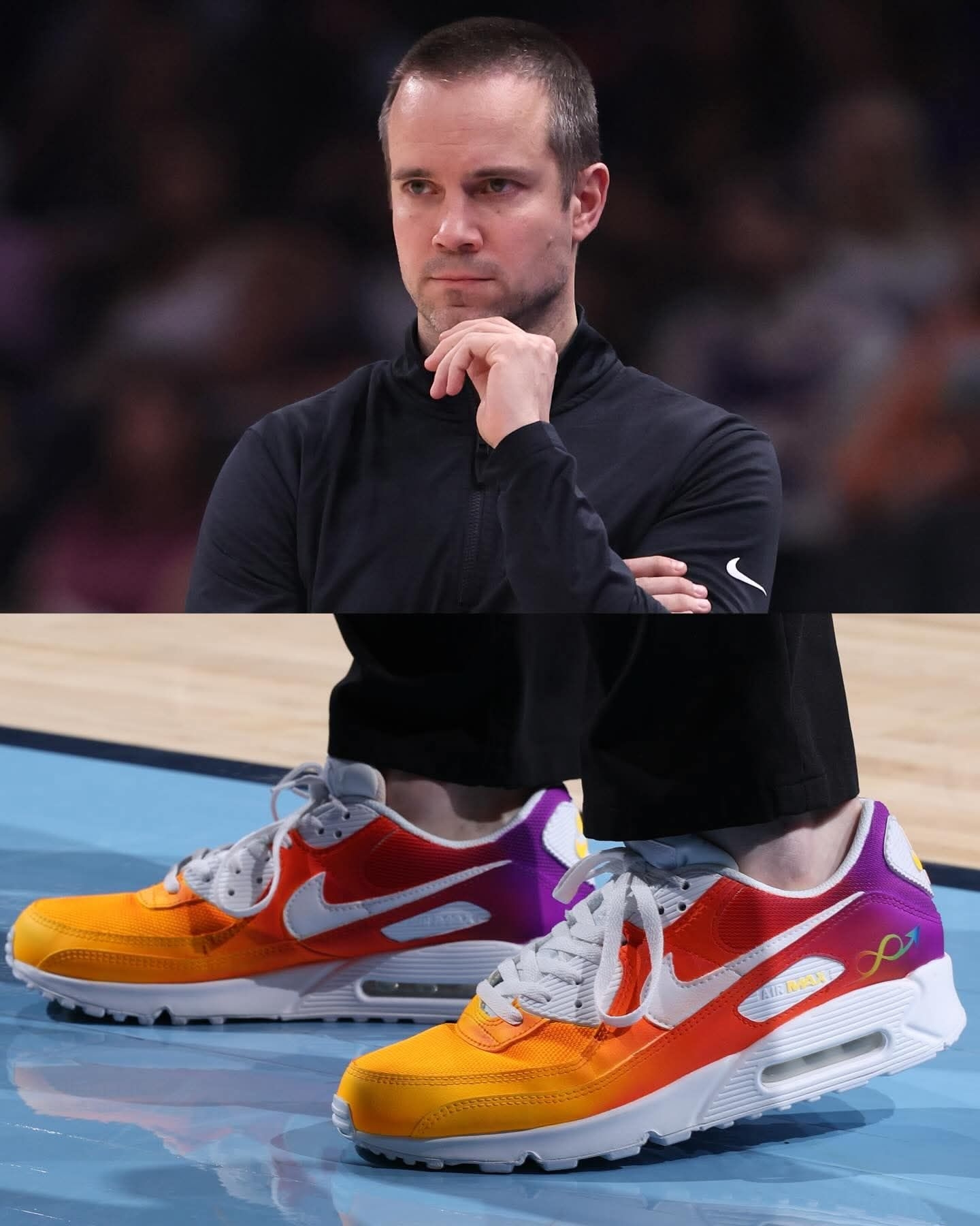 谁懂啊家人们!NBA教练们集体上脚的这双定制Nike Air Max 90,直接把球鞋的意义拉满了✨ 为了「自闭症接纳日」,每一双都用了标志性的彩虹渐变配色,鞋身的无限符号、MAX标识,每一处细节都在为自闭症群体发声。 从紫黄渐变到橙蓝撞色,从亮绿到红橙渐变,不同的色彩却承载着同一个信念:接纳、理解与爱❤️ 球鞋从来不止是穿搭工具,更是传递善意的载体。当教练们穿着这双鞋站在球场,体育的温度...