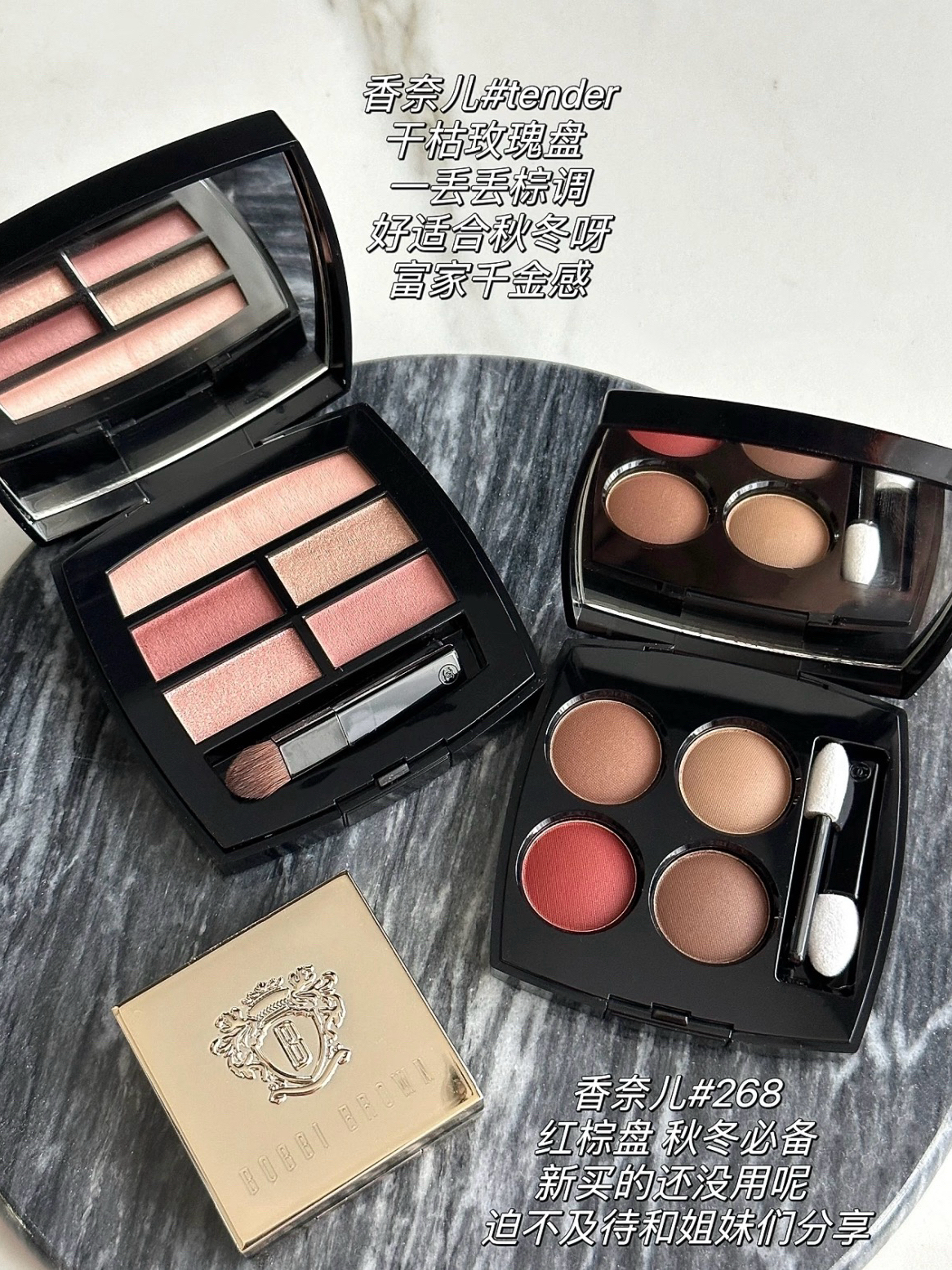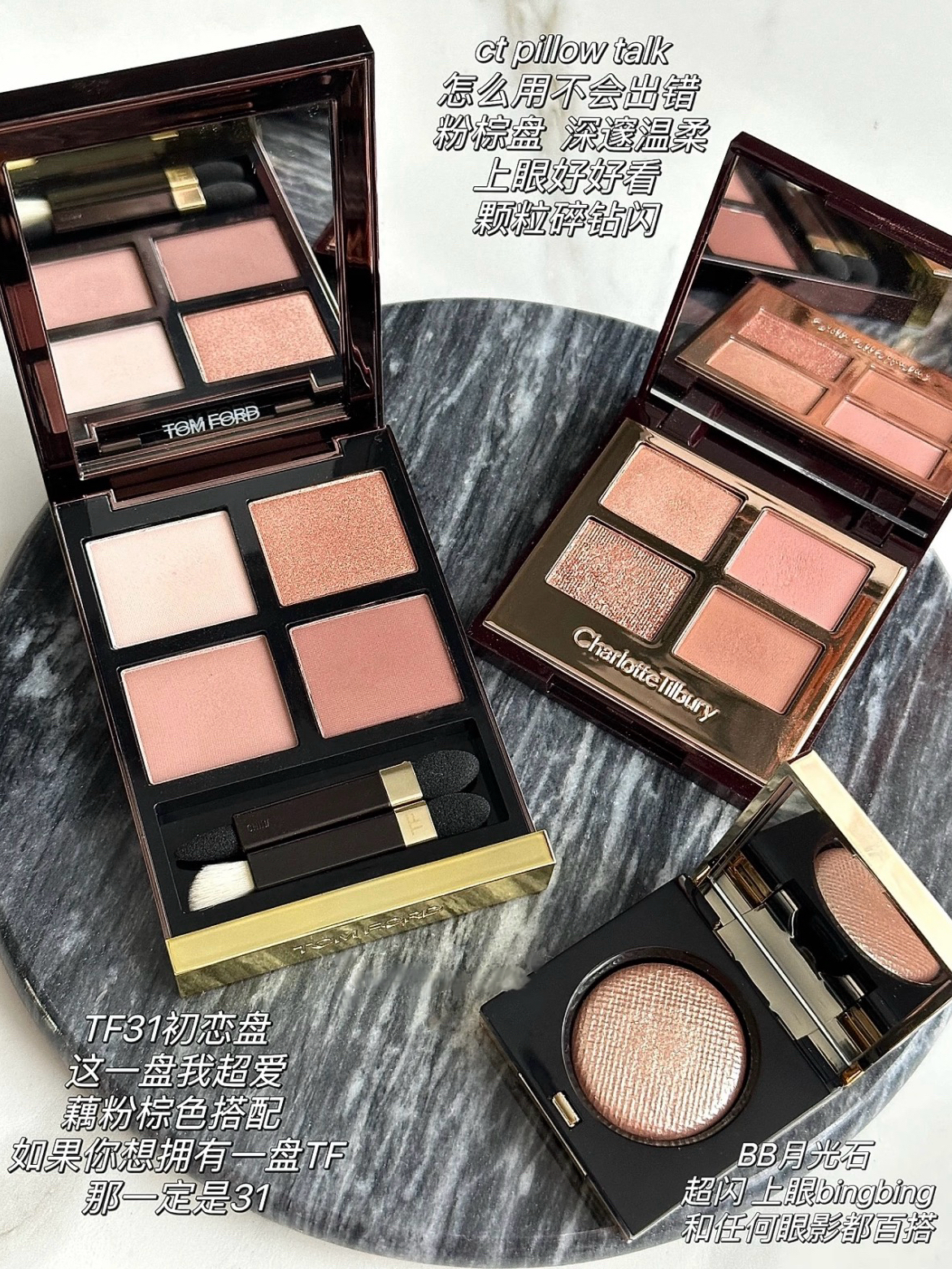 全盘无废色~ 不管是配色、粉质还是上眼的貌美程度都很绝~持久度还是粉质细腻度,真的没有平替! 压粉都很瓷实,提亮和细闪色上眼都很清透,温柔千金,眼睛水汪汪的感觉 打底色和加深色都很好晕染开,日常通勤和精致全妆轻松拿捏 最深色可以直接用做眼线,调和妆容的整体性! Chanel warm 香奈儿288 CT枕边话 迪奥后台眼影002 TF 31沙漠之下 芭比布朗月光石