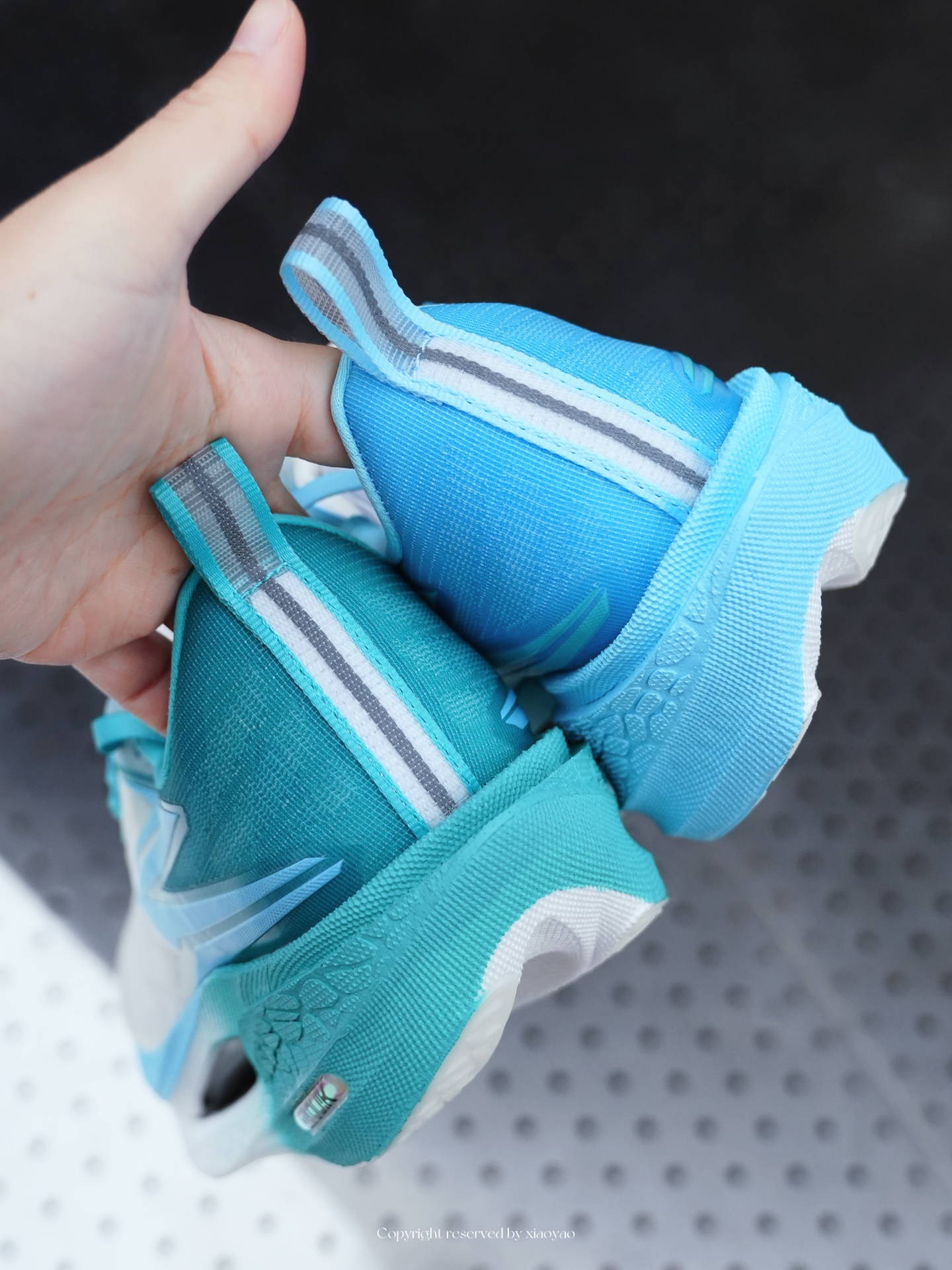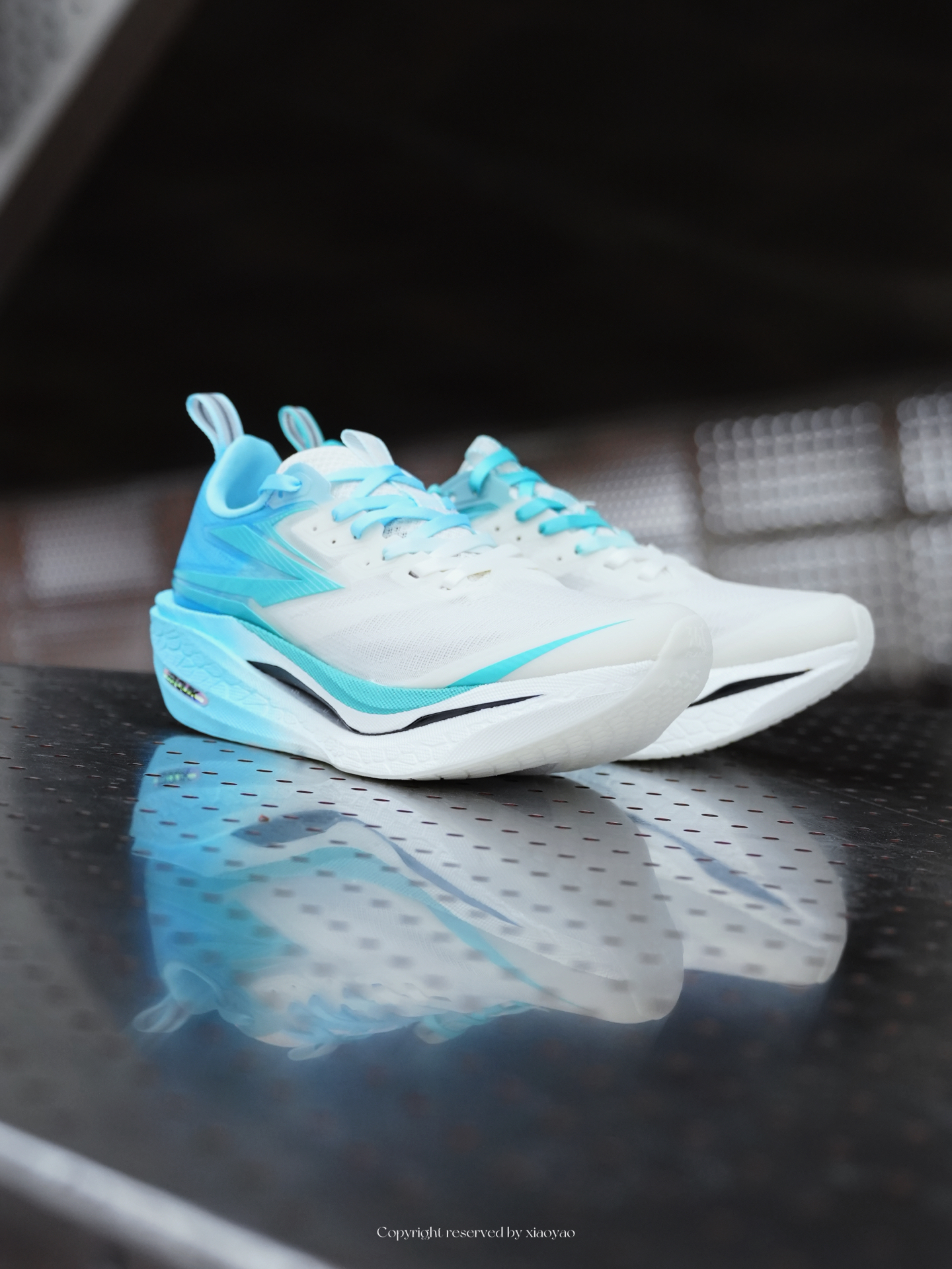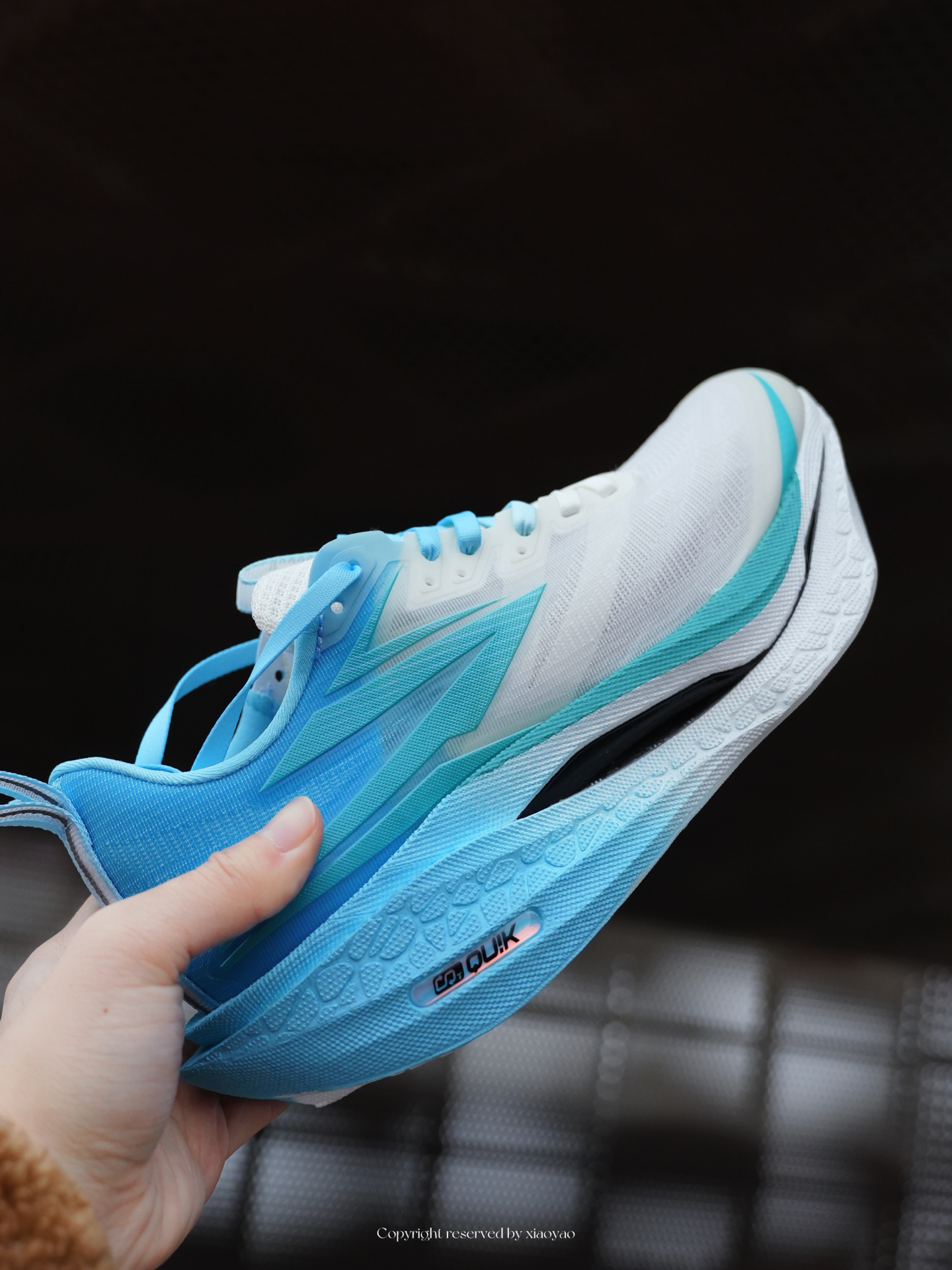 等过完这个梅雨季,就是能穿上这双「海岸线」飞燃4ET的时候啦。 很清新的配色,后跟淡蓝色和孔雀蓝(也有人叫绿色)像极了海水的颜色,太适合夏天了!仔细看,左右脚色块还是岔开的,颜色虽然相近但也是个鸳鸯呢。哦对了,这个配色是专供哦👀 对比正代,ET是更适合日常训练的版本。 调整了泡棉密度,对比正代更加软弹,同时把正代挖空的前掌给填平了,不然泡面变软还真容易踩出泄力的感觉。 把碳板换成一块异形玻...