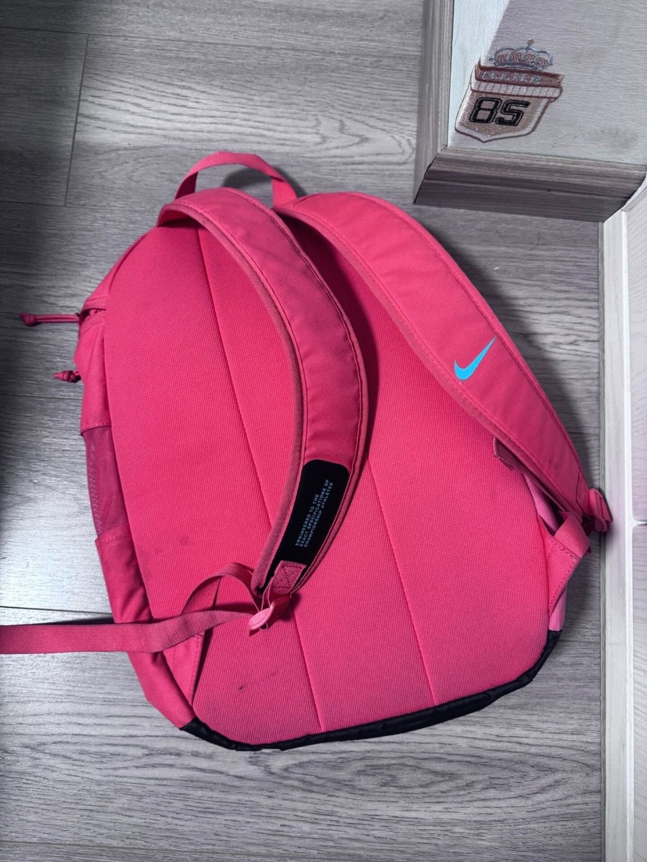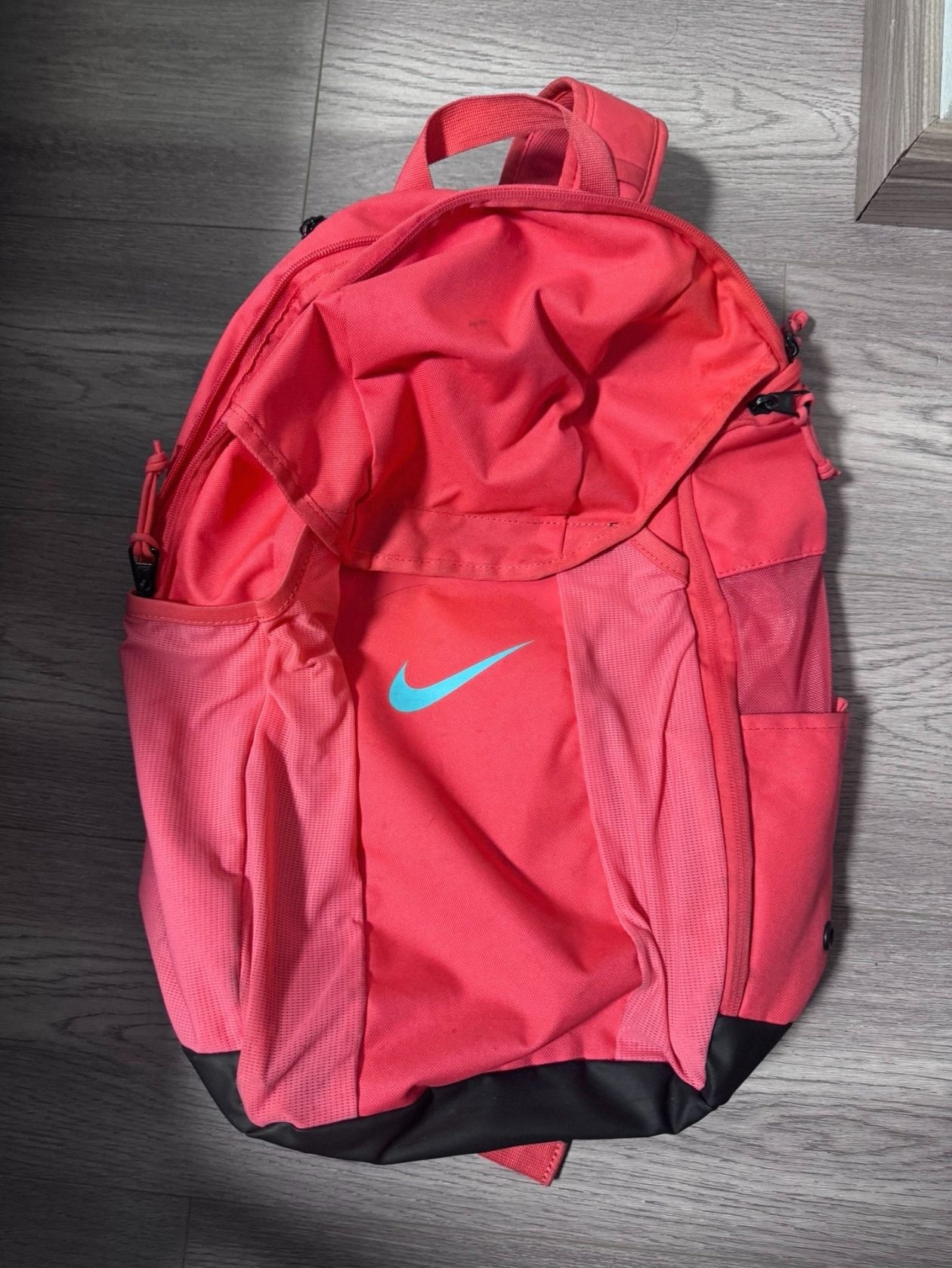🎒Nike红色双肩背包,轻质聚酯纤维材质,耐用又防水,日常通勤或运动都超适合!正面绿色Swoosh标志超有辨识度,简约又活力满满✨。多隔层设计,收纳超方便,顶部提手+双肩背带,携带无压力。