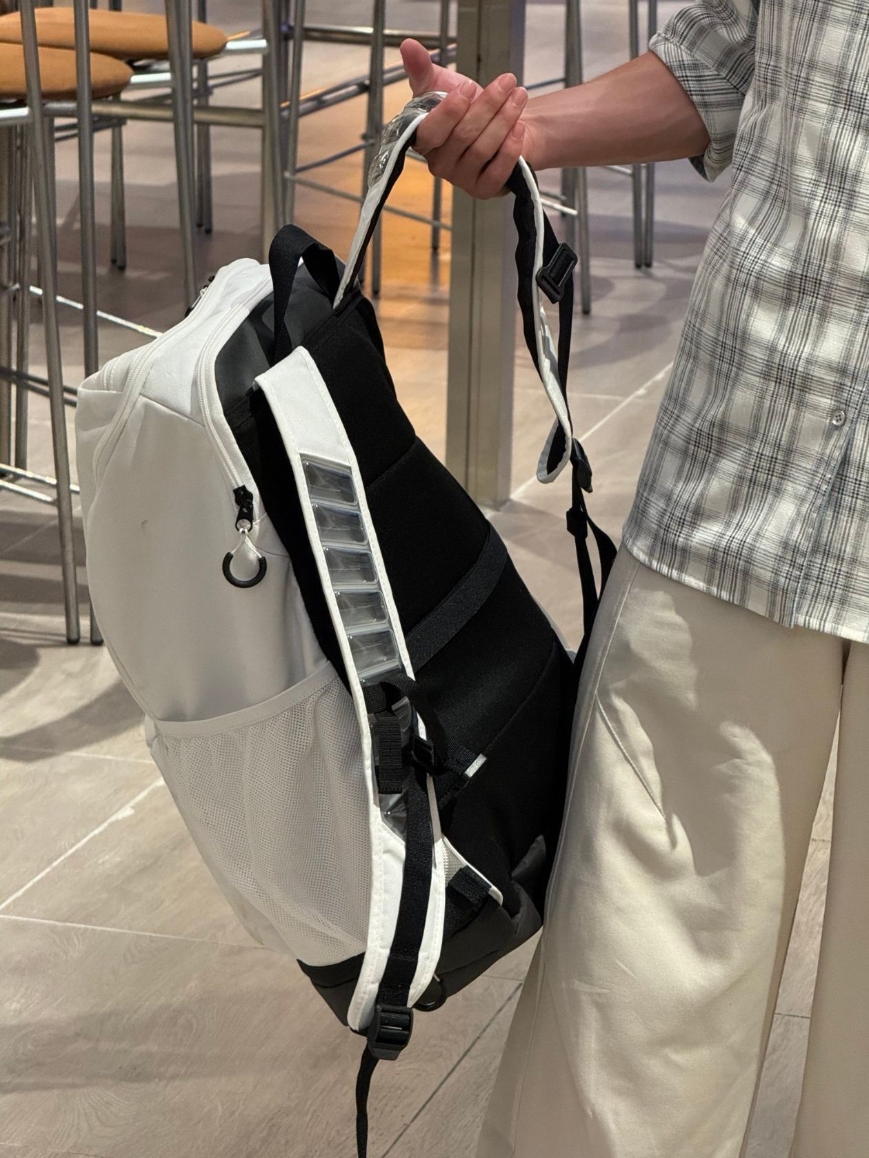 背上心爱的背包出门被夸啦❗️ 说我很有少年感🤦 都是这款白色金标耐克背包的功劳 个性拉环设计 背带还有明晃晃的气垫 背着氛围感拉满📷 关键出街背着也不累 收纳了一整个逛超市淘到的好物 完全没有重重的感觉👍 太宝藏啦! 今天搭配了衬衫和浅卡其色长裤 不知道以后还能搭配什么款式🤔 感觉怎么穿配包都好看😎