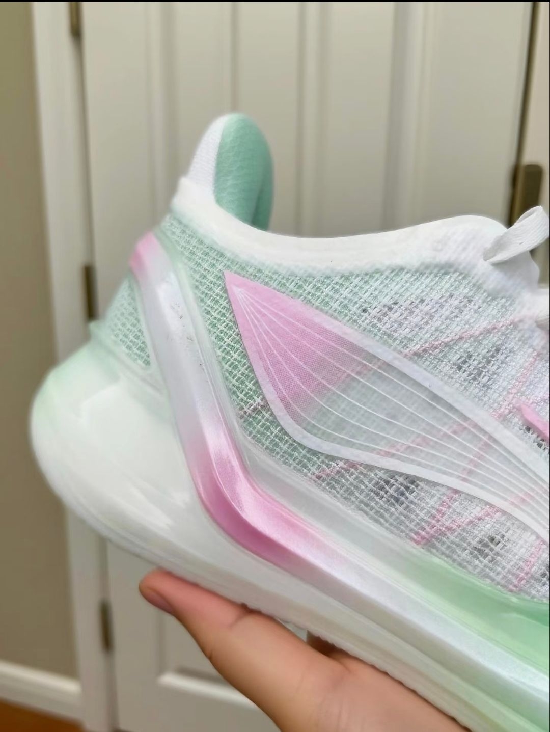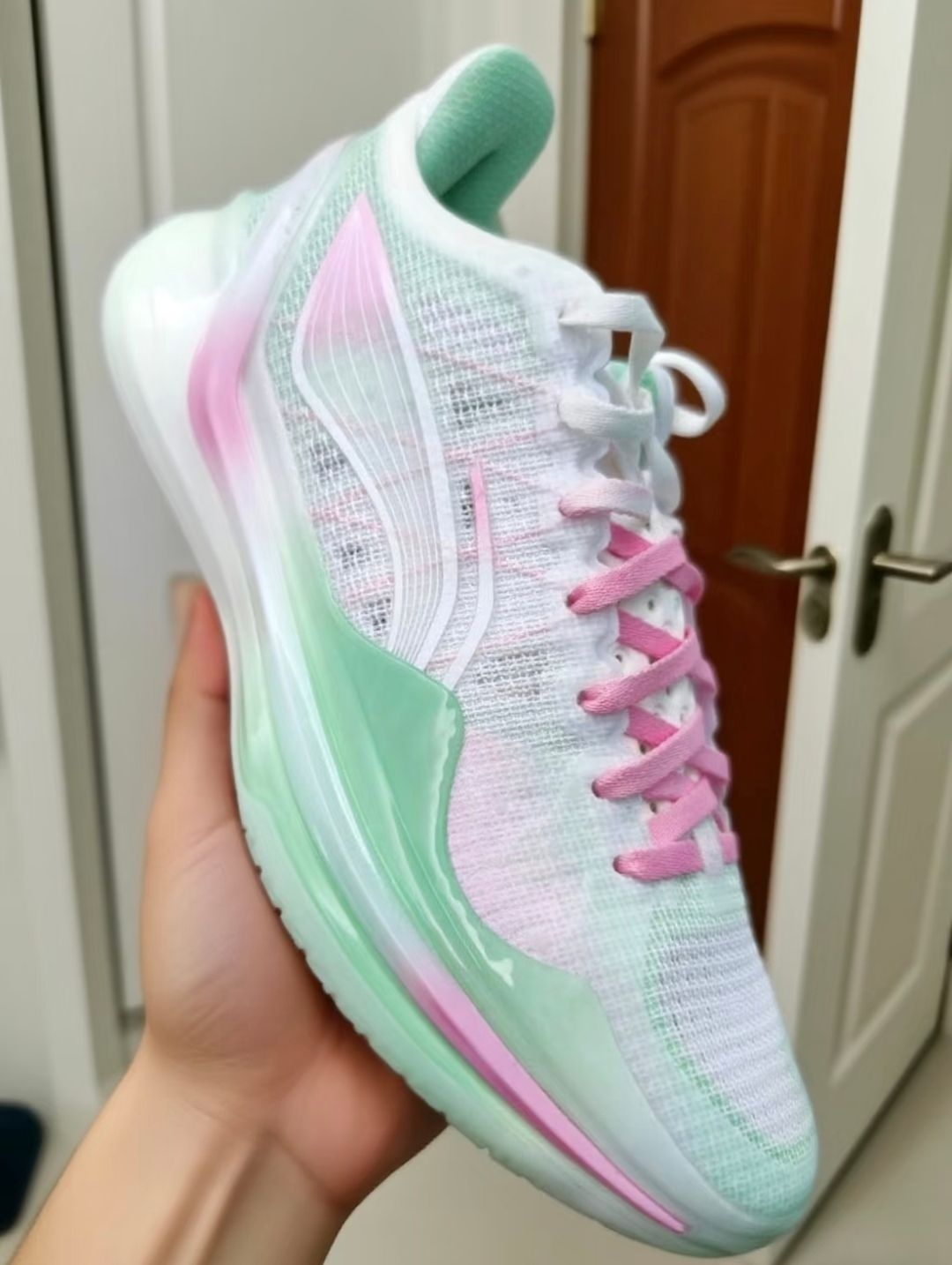1. 颜值真的无对手!这个初荷配色真的太绝了,清透的粉绿渐变,完全不浮夸,温柔又有质感,上脚在球场上巨吸睛,完全不会撞款。重点是它不止能打球穿,我平时搭牛仔裤、休闲裤出街,回头率比很多休闲鞋都高,一双鞋直接搞定打球和日常,性价比直接翻倍。