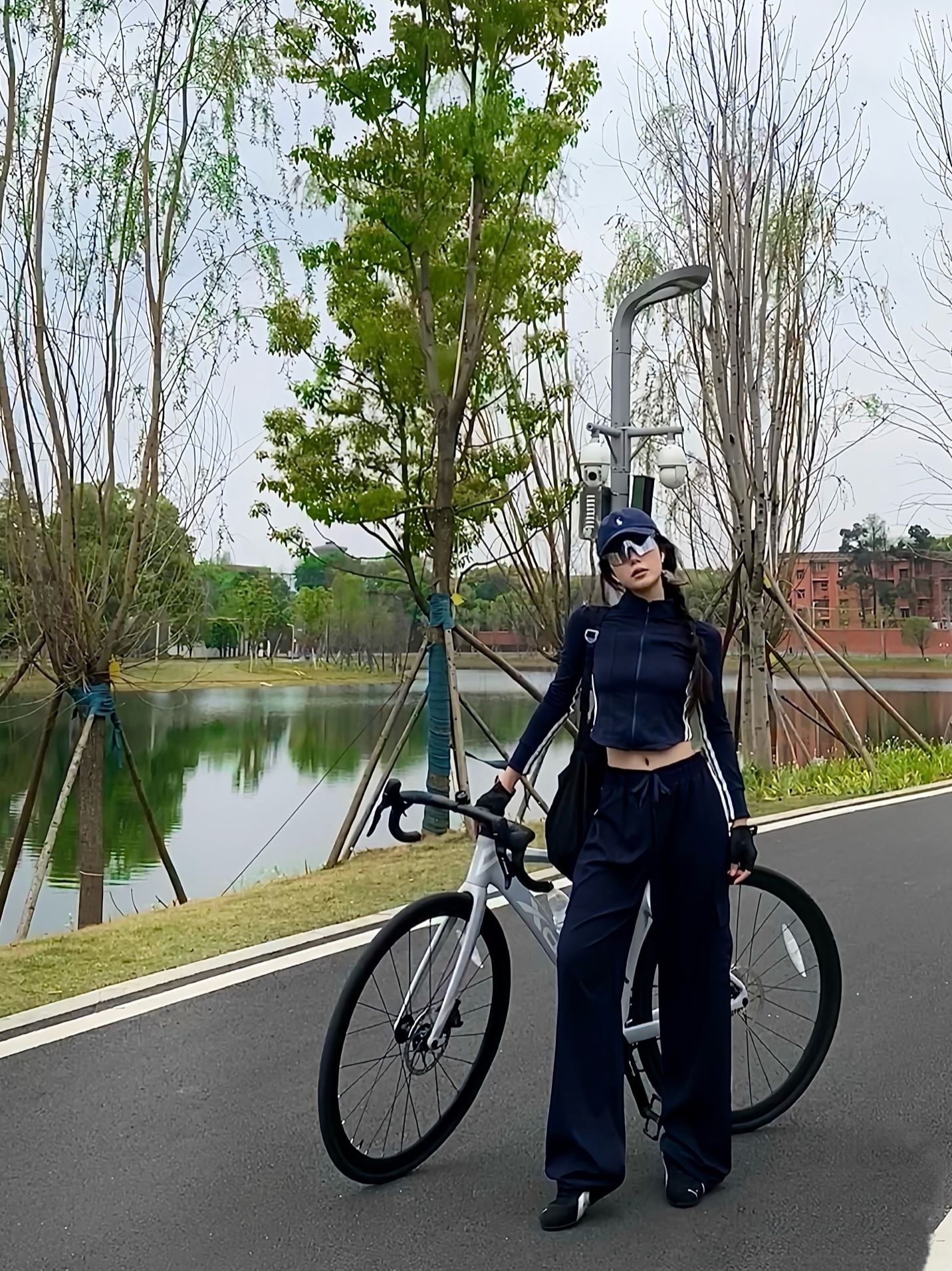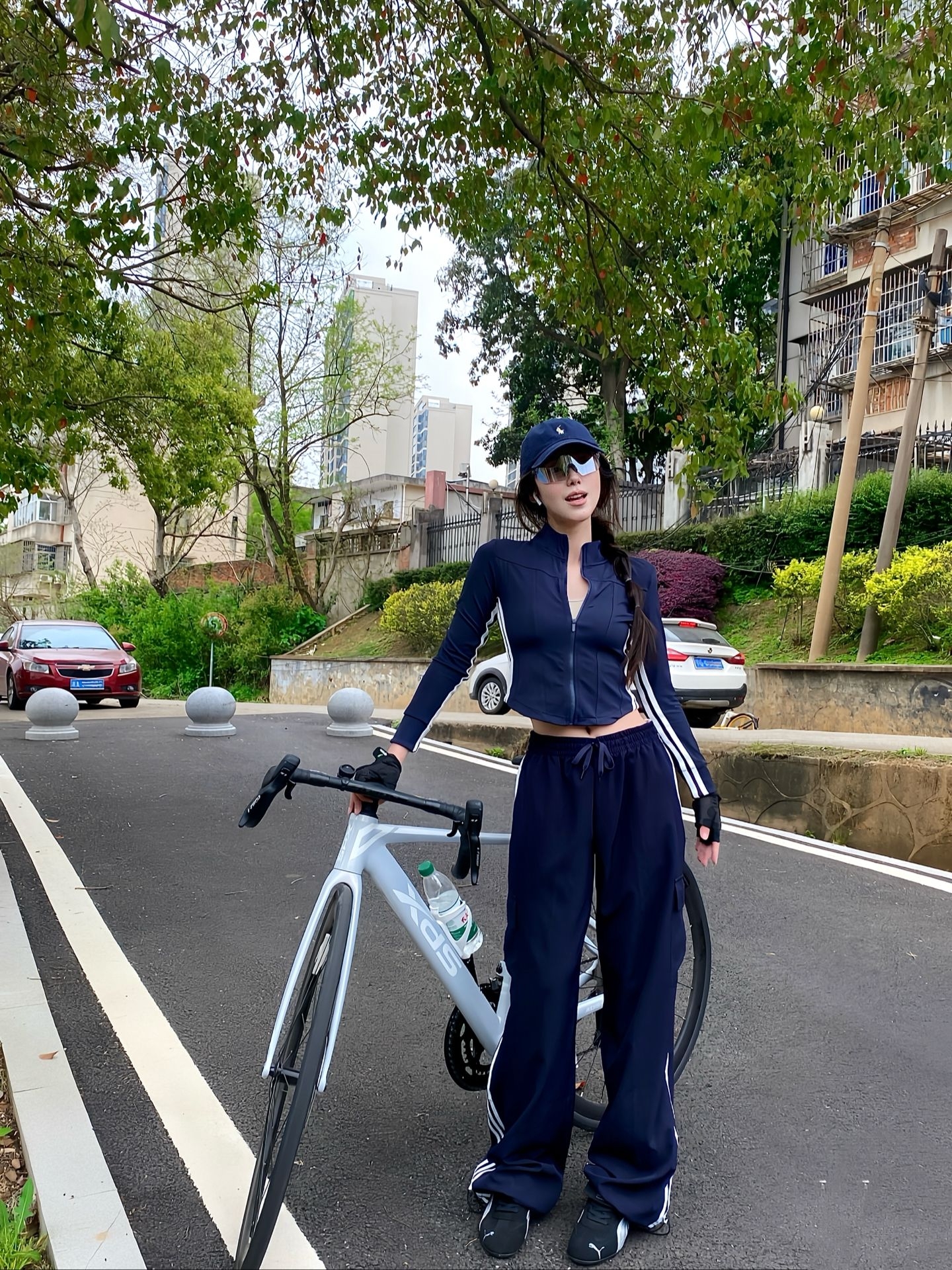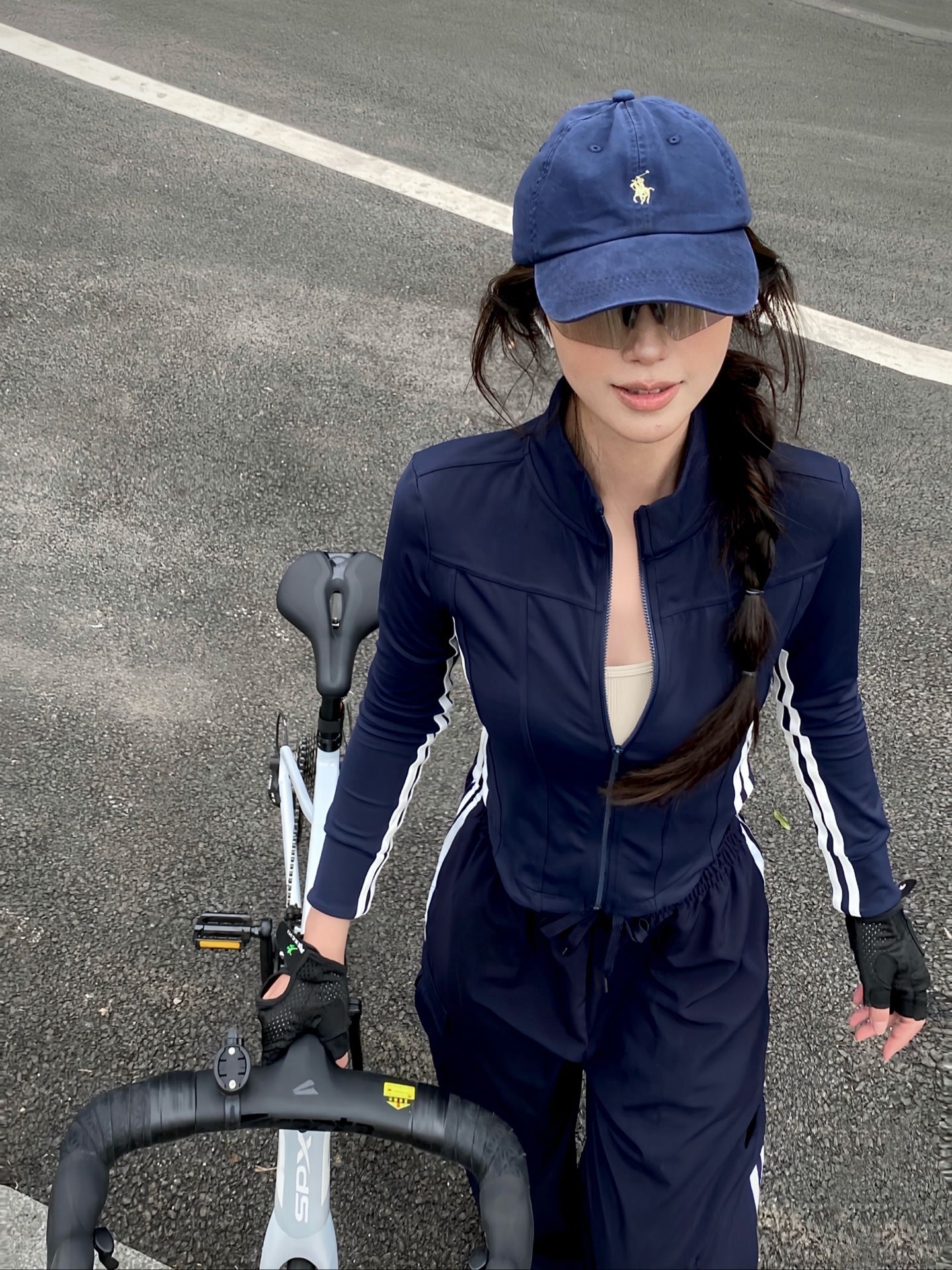 上身这件藏青色立领骑行服,面料轻薄透气,贴身剪裁完全不束缚骑行动作,拉链设计方便调节开合度,日常穿也很利落。袖子两侧的白条纹设计,给简约的款式添了几分运动活力,内搭的浅色打底,让整体造型更有层次感。