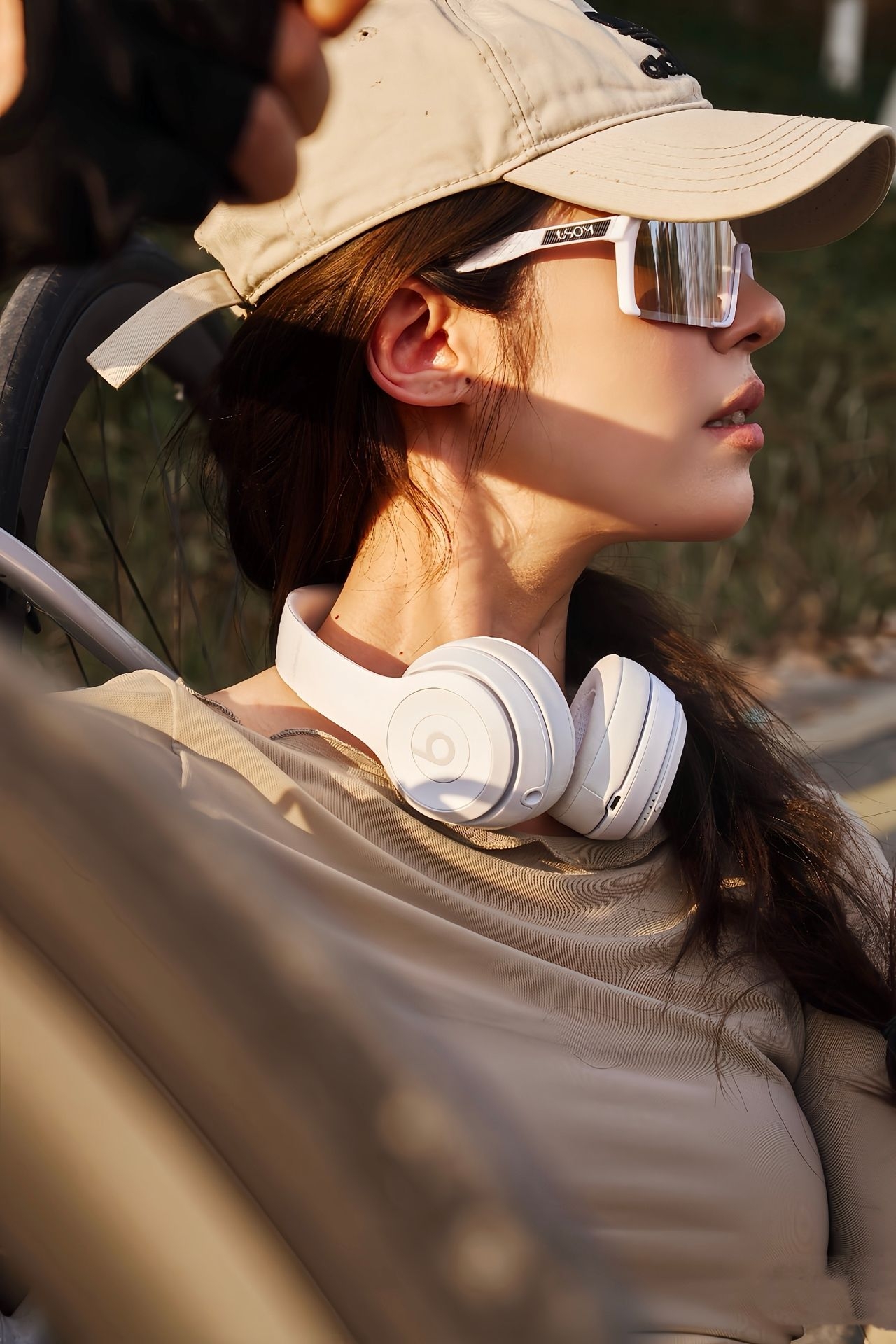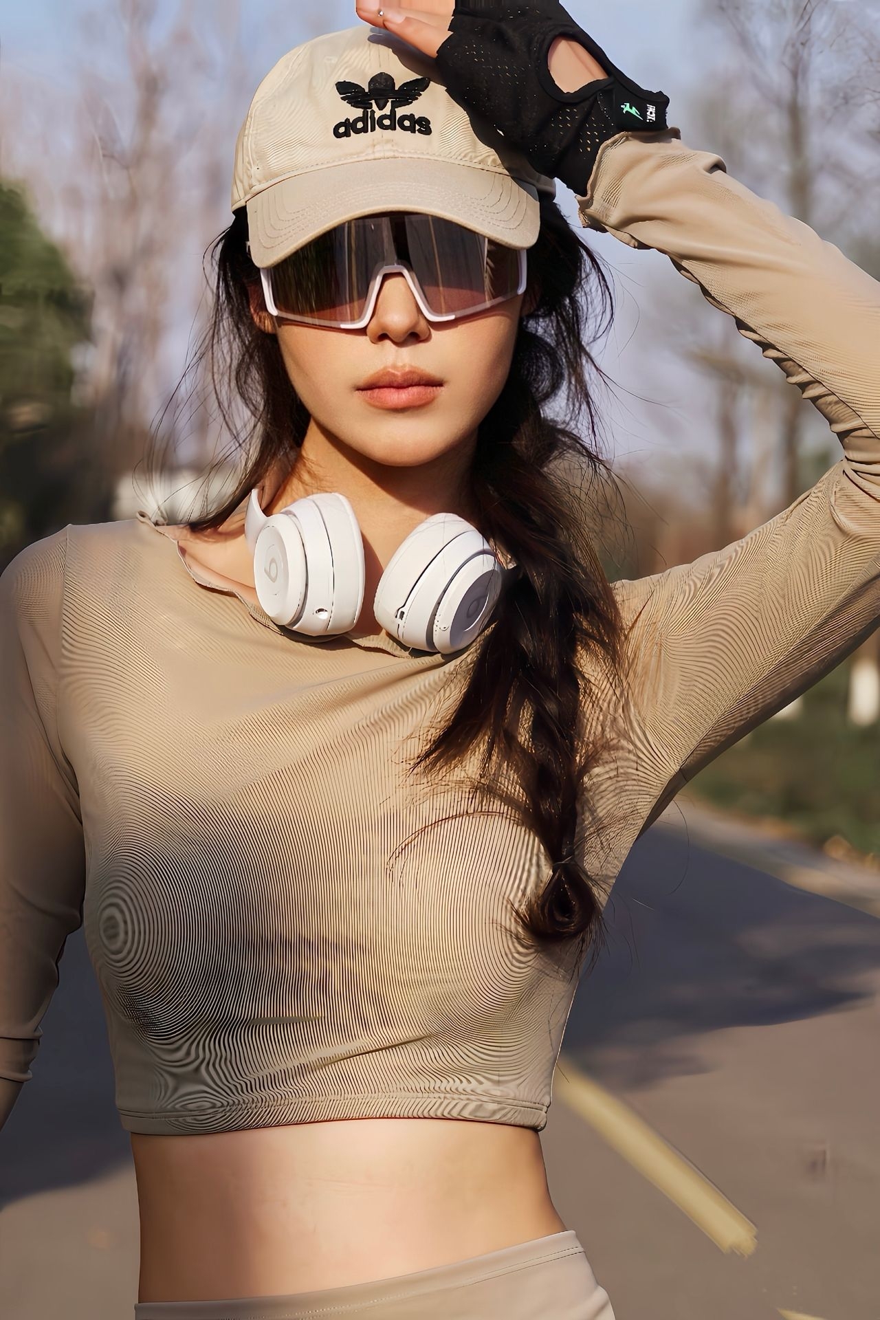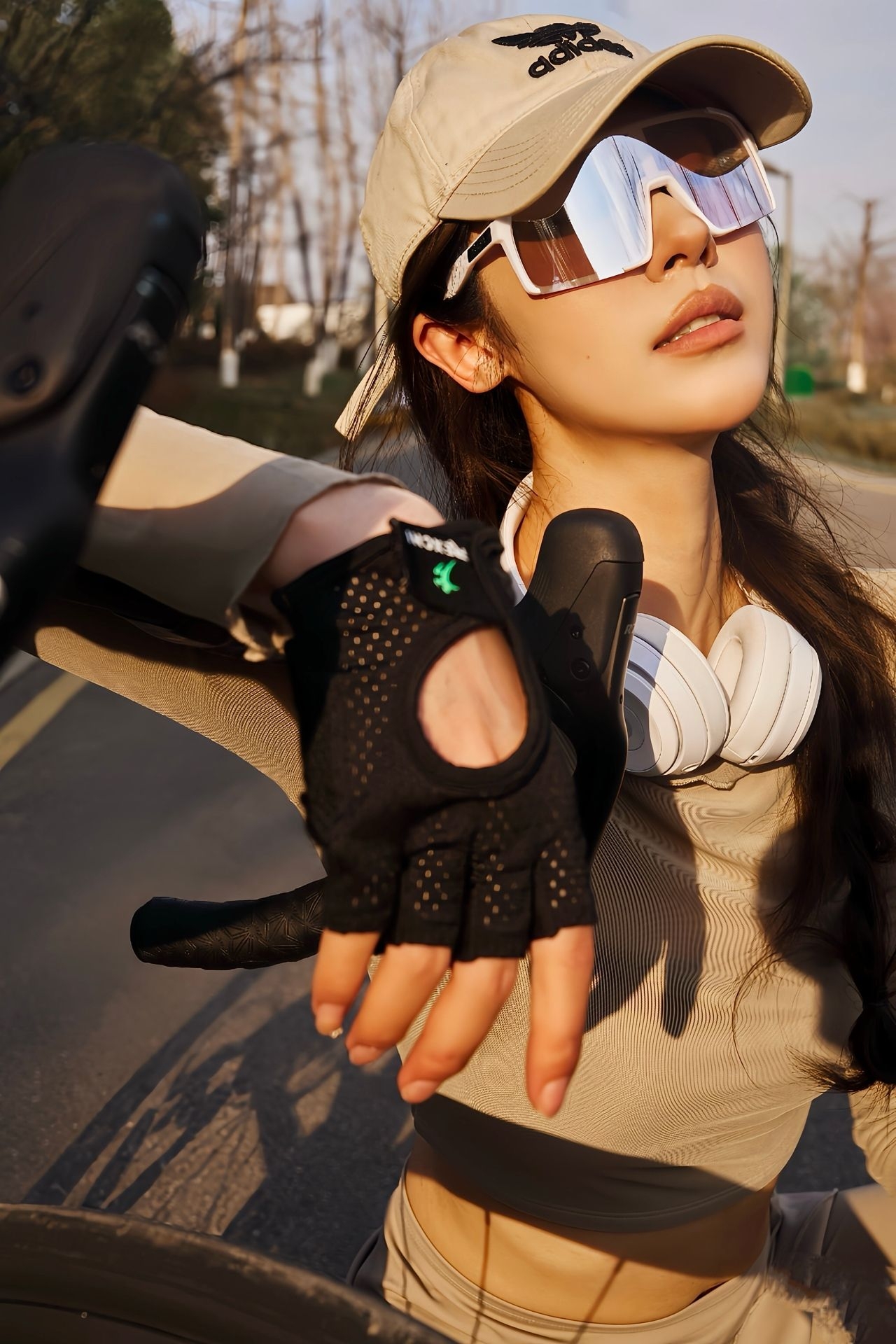 上身这件卡其色紧身长袖上衣,面料轻薄又有弹性,贴身剪裁把线条衬得很流畅,短款露腰的设计,刚好凸显出腰线,利落又显比例。长袖的设计还能兼顾防晒,骑行时完全没有束缚感。