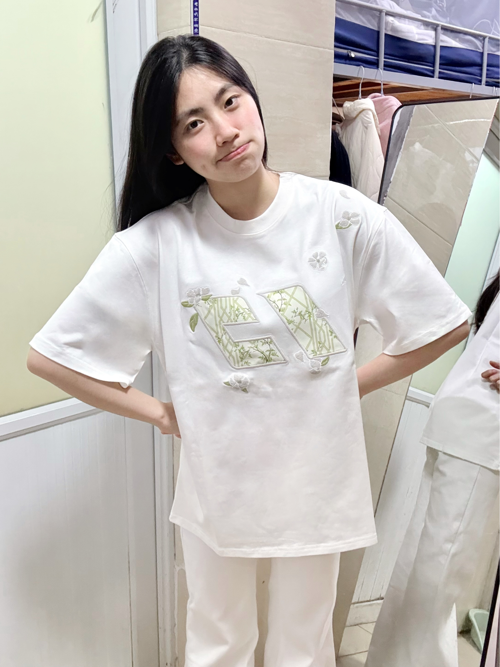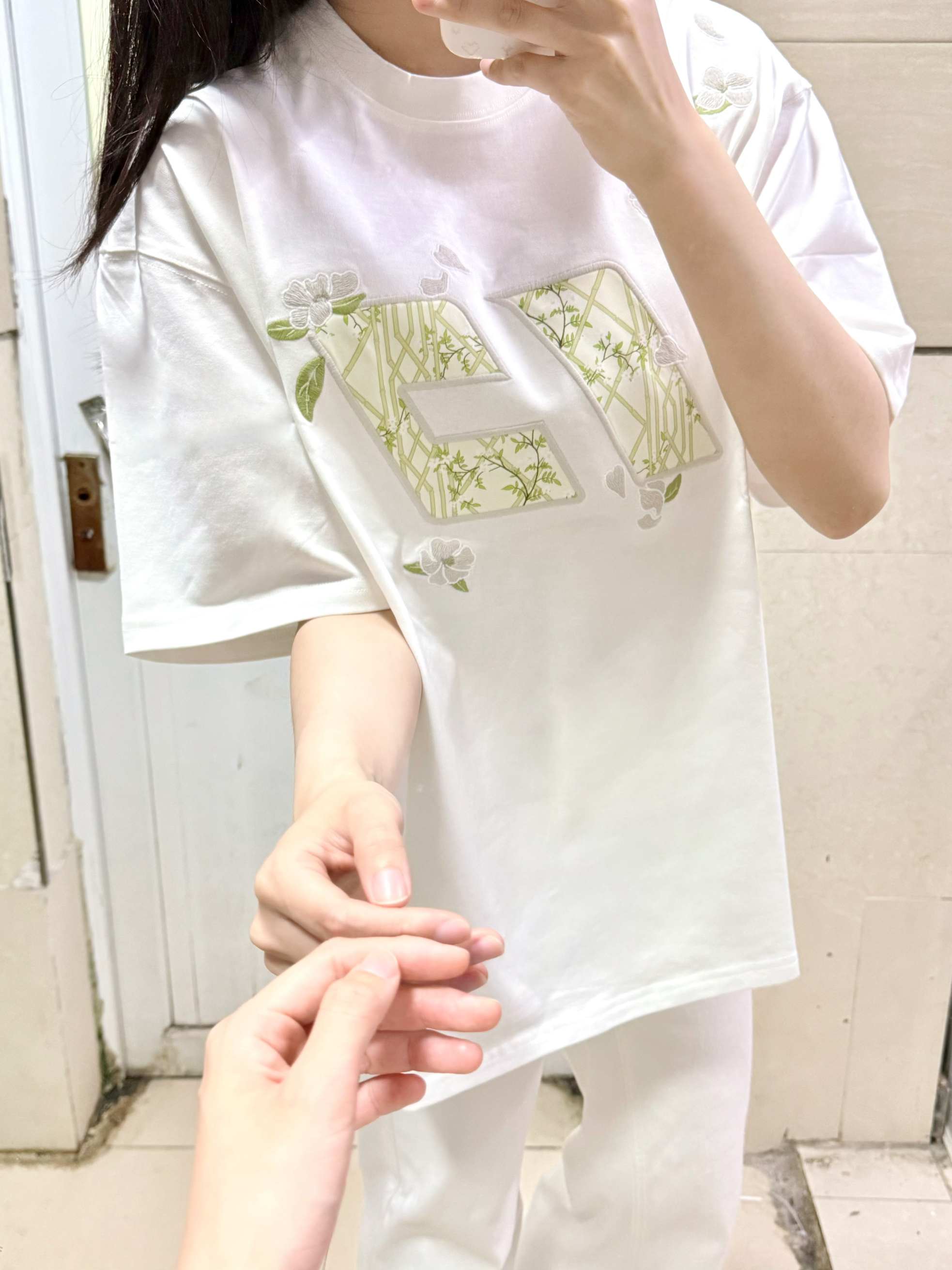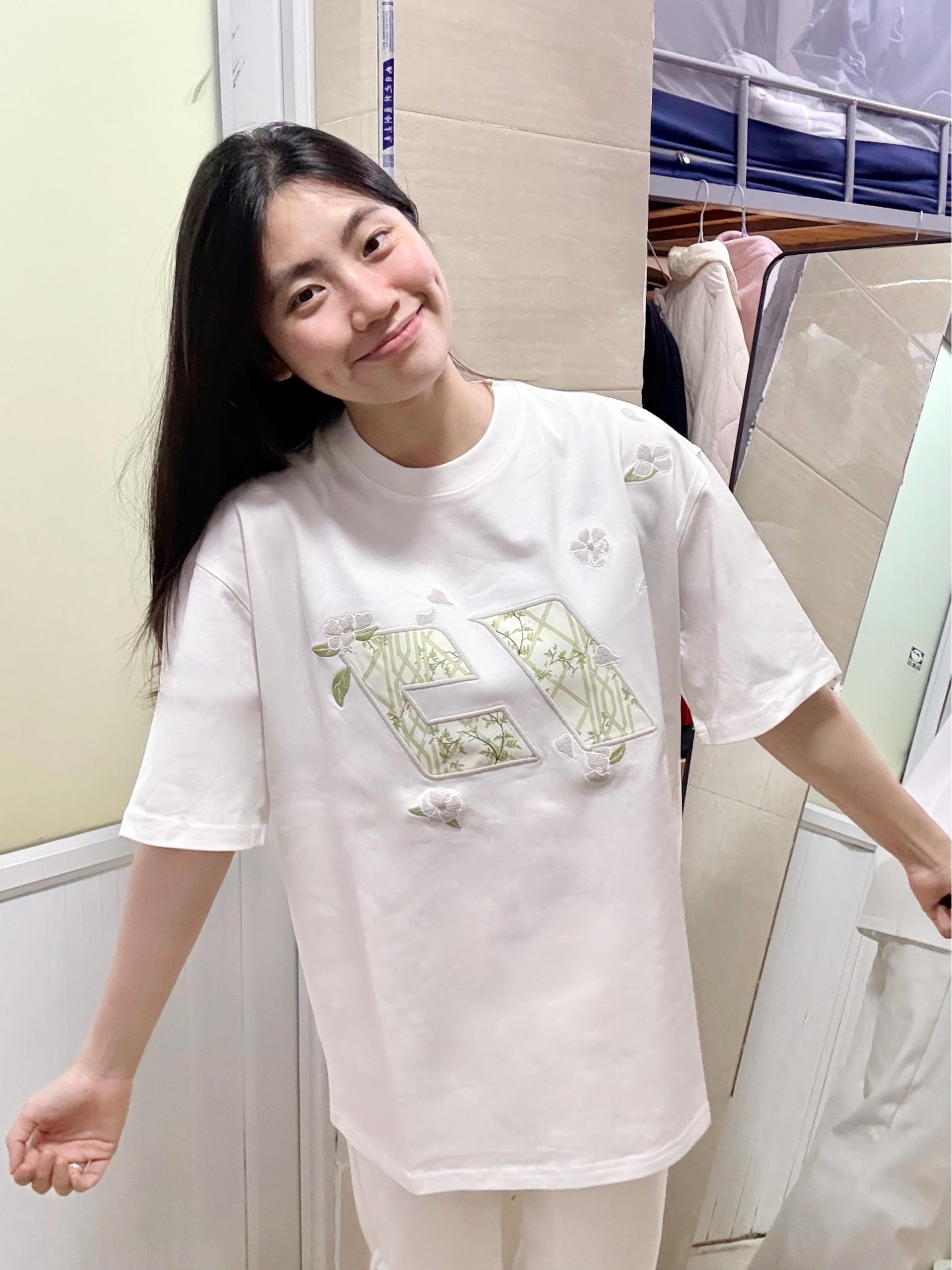 166 102穿的是M码 面料是纯棉的 胸前做的竹子和花的刺绣很有春天的氛围感呢 穿上还自带凉感呢 版型是正肩的 喜欢的宝可以参考一下哦