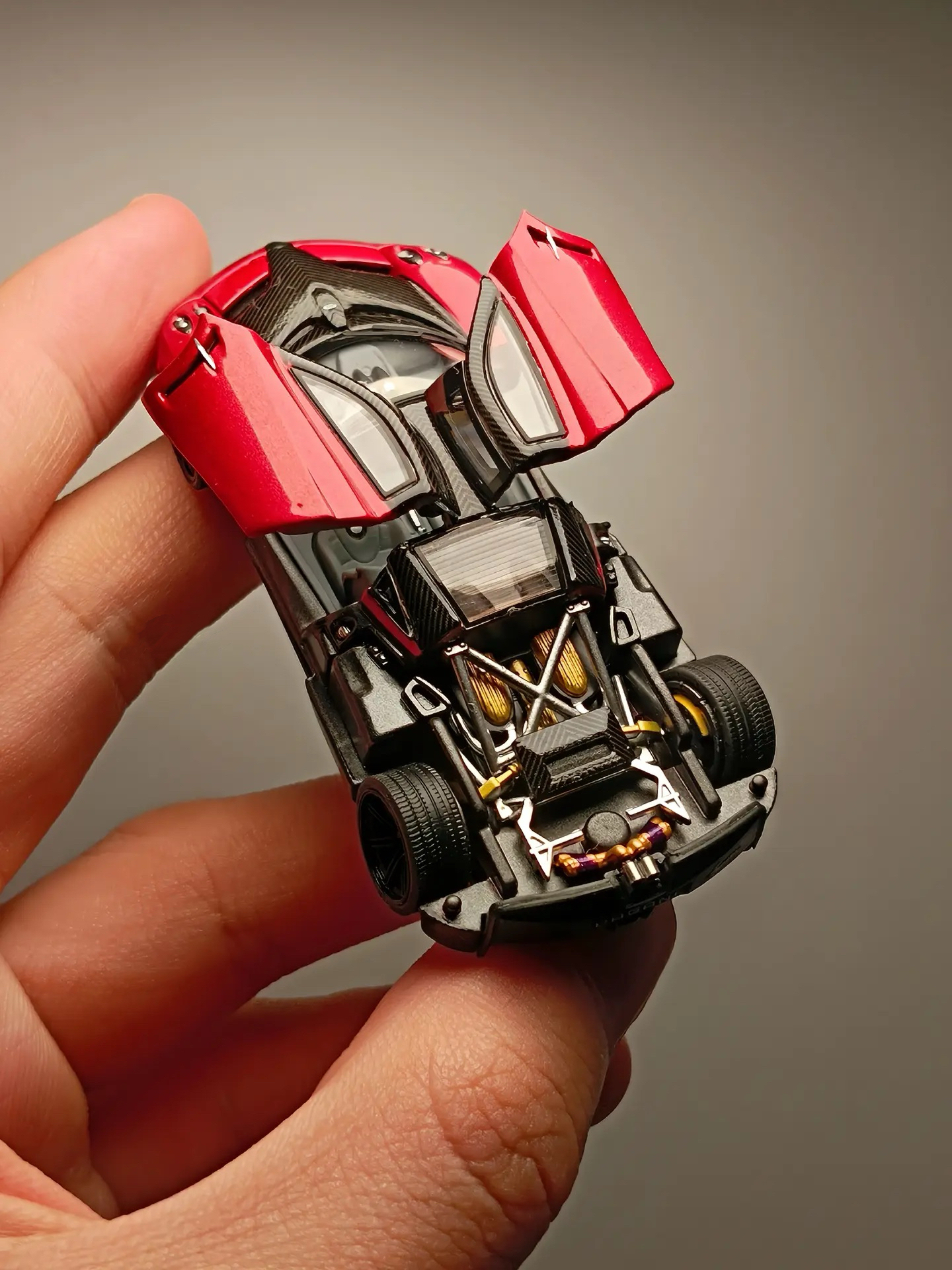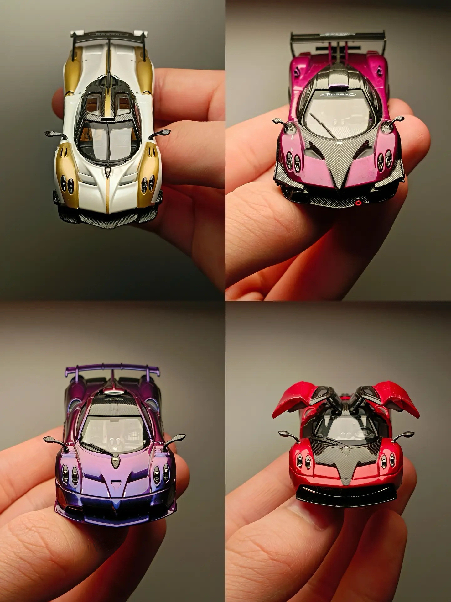 这些合金小车拿在手里分量很足,漆面光滑细腻,尤其是变色龙紫那款,光线一转就呈现粉紫渐变,金属光泽感直接拉满。车身的碳纤维纹路清晰又不突兀,和实车的质感无限接近,最绝的是开盖设计!掀开引擎盖,里面的发动机管线、避震结构都精致到离谱,每次打开引擎盖看到精细结构,都会忍不住赞叹工艺之精妙,完全是把真车的机械美学按比例缩小了。如果你也喜欢这种把“梦想座驾”握在手心的感觉,这些帕加尼模型绝对值得收藏!你最喜...