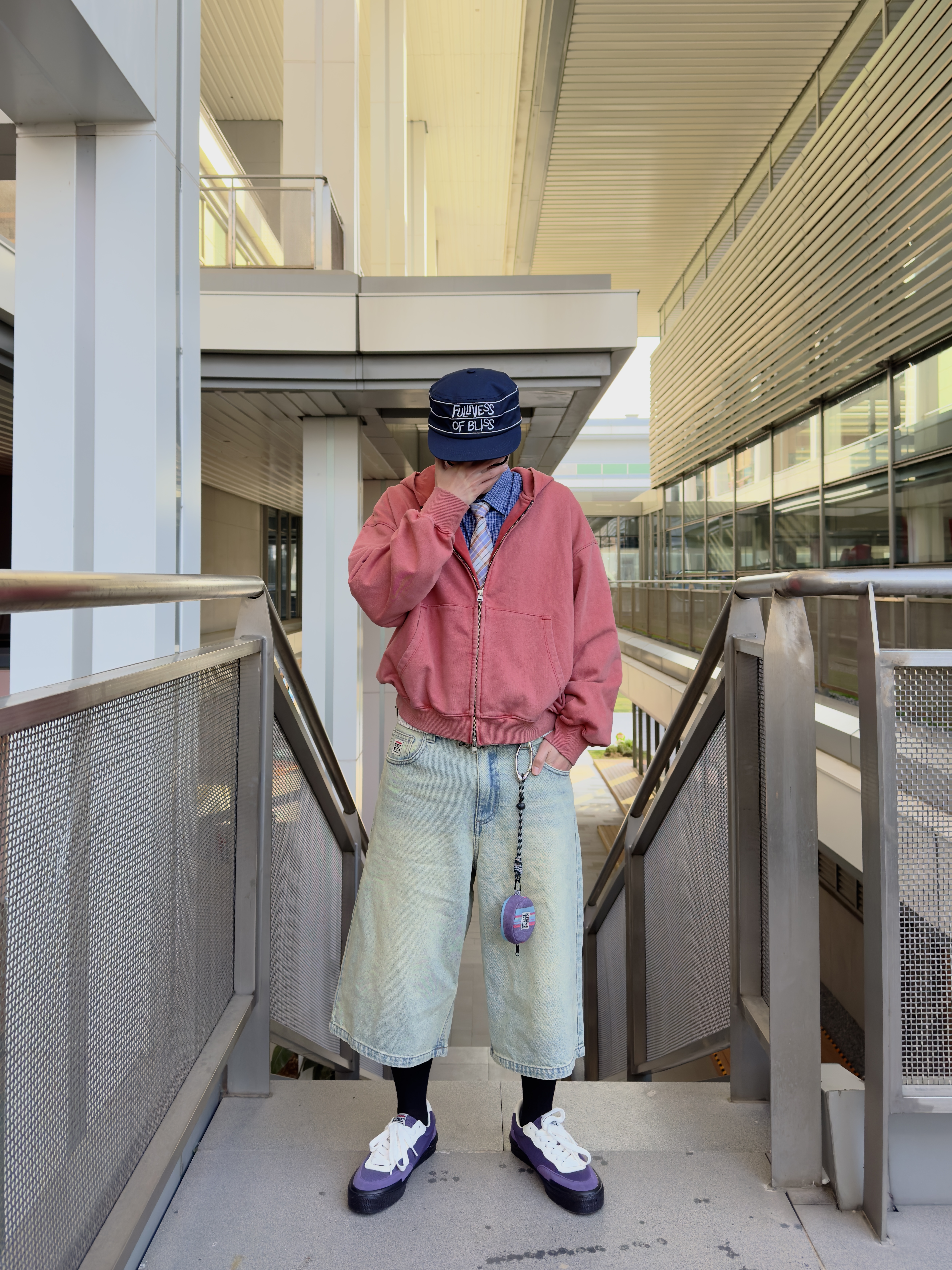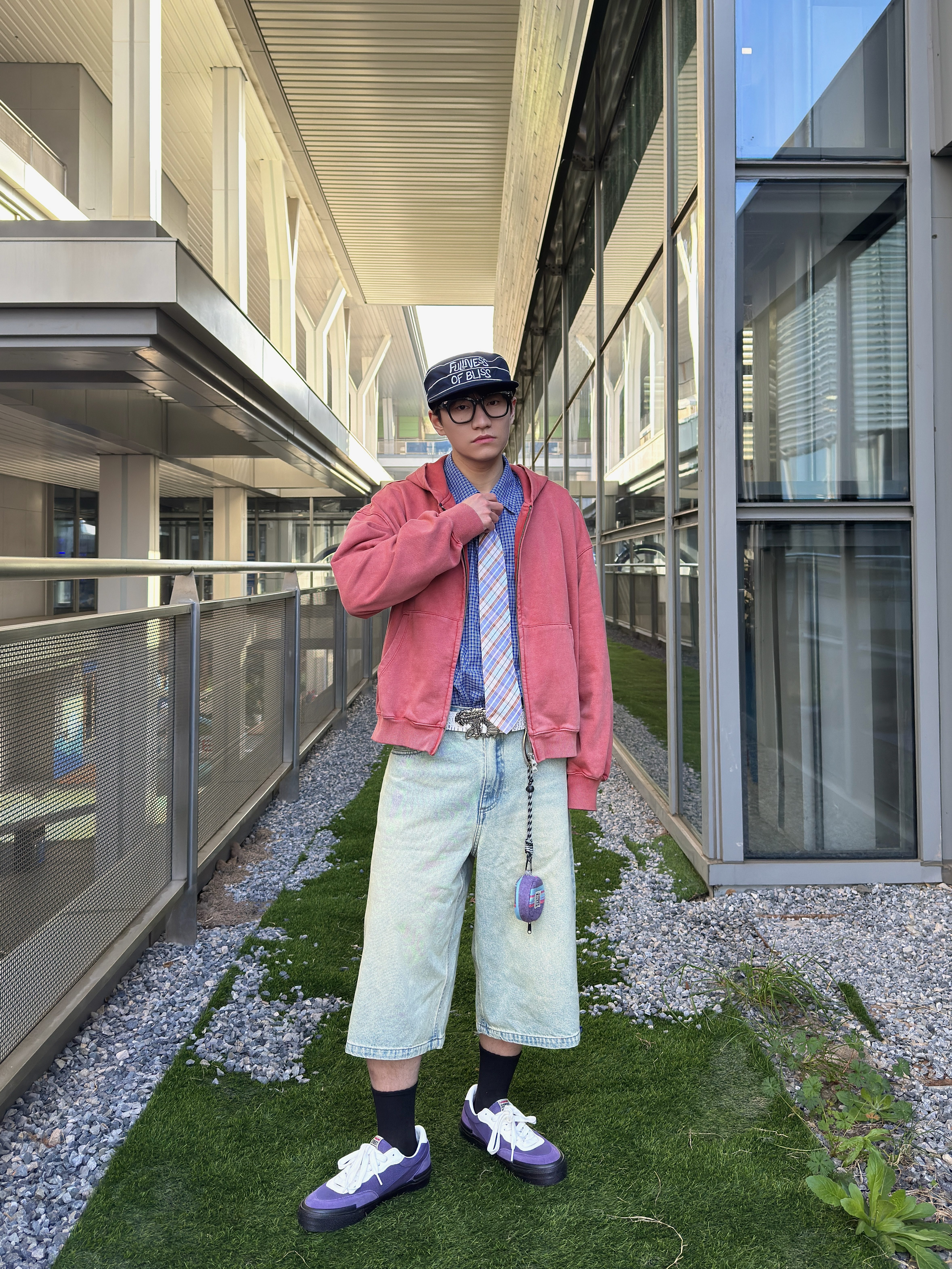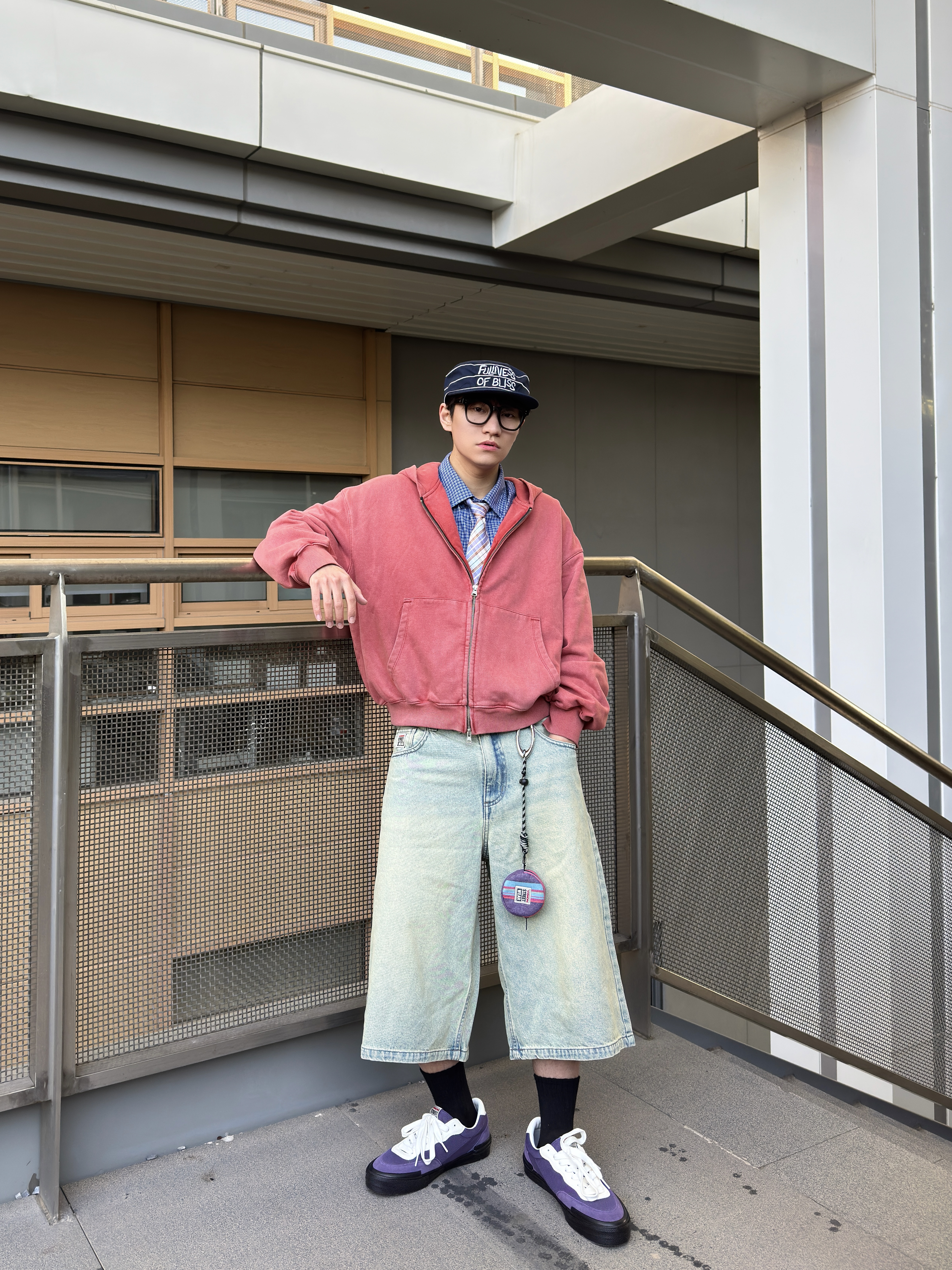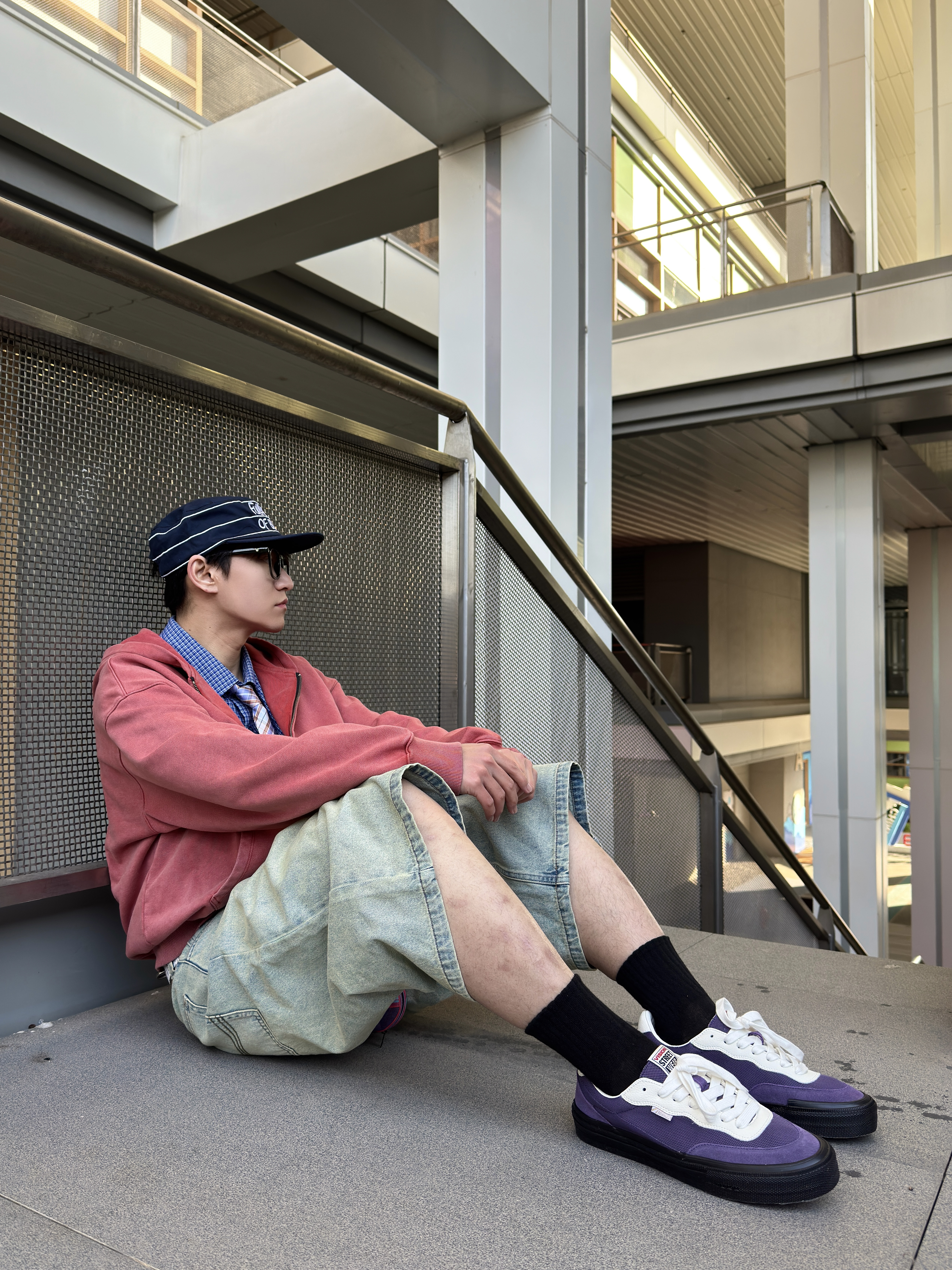 今日份搭配主打一个春日休闲搭配 上身用拉链卫衣+衬衫+领带👔做一个基础叠穿 裤子选择这条来自Vision Street Wear的七分裤🩳 做旧蓝配色质感很不错 版型偏宽松 上身腰间配一个紫色钱包👛很不错 鞋子也是来自这家品牌 紫色出片很容易 上脚有型且舒适 在呼应配饰💍的同时 还兼具了通勤穿着~