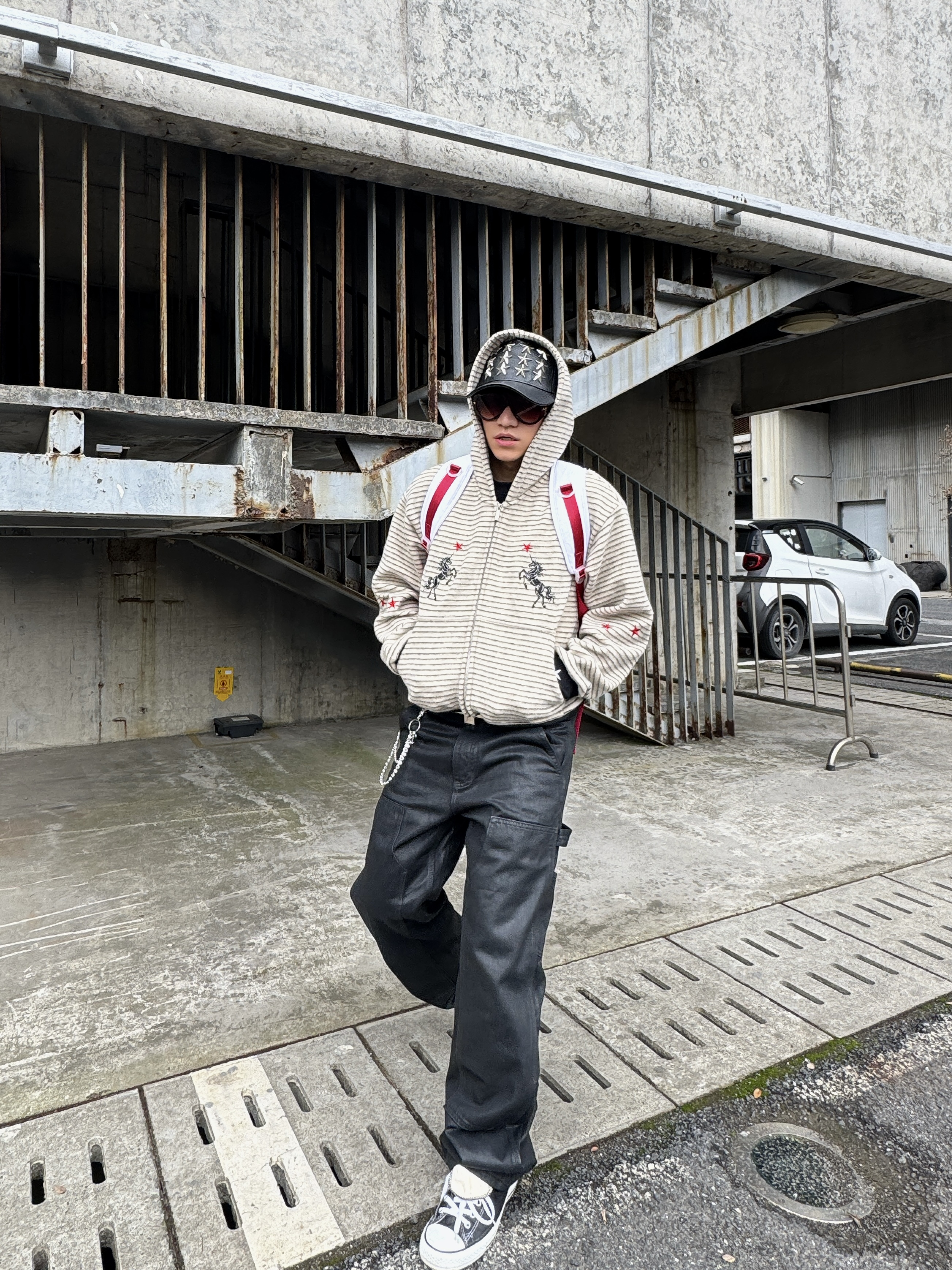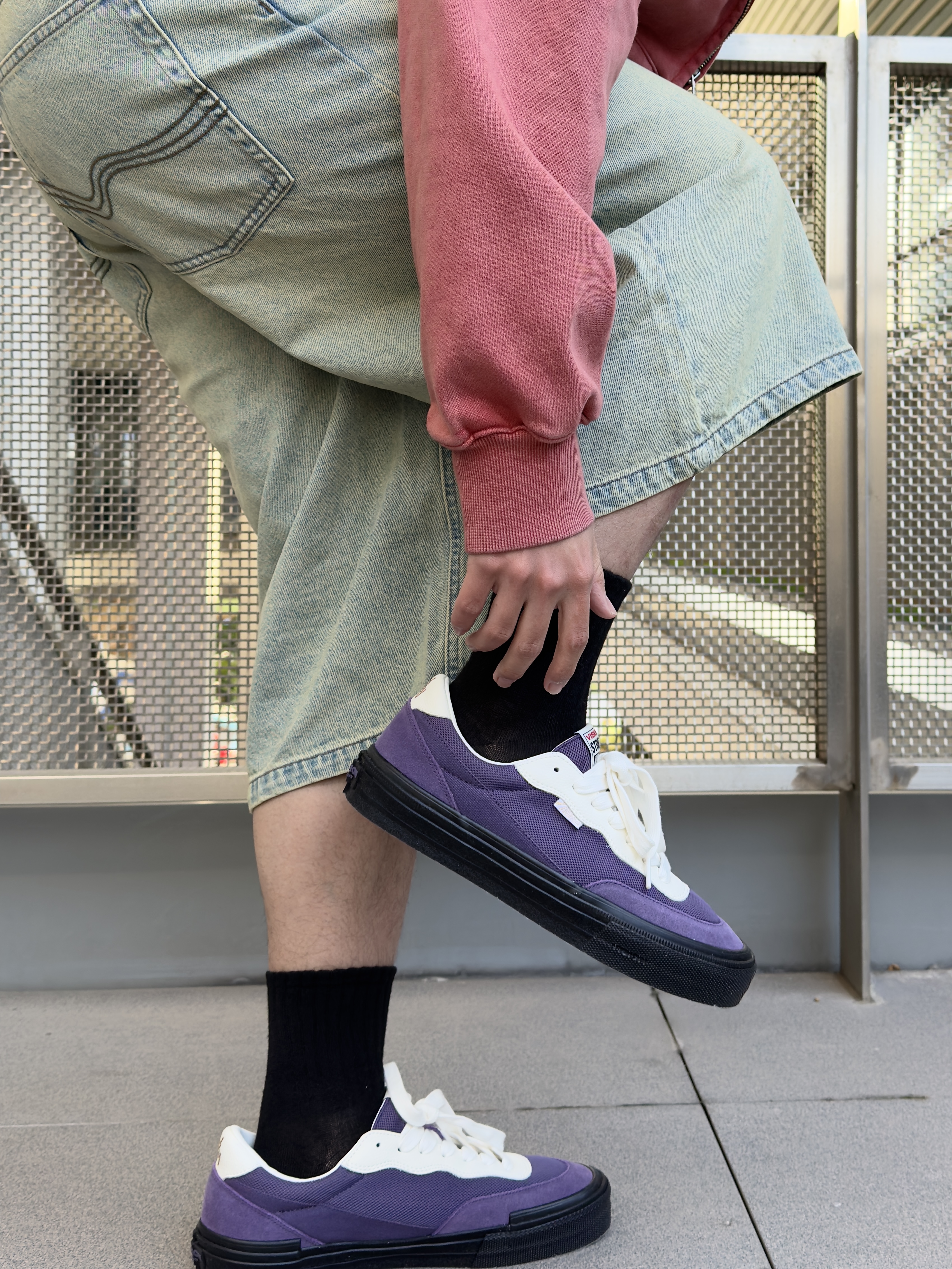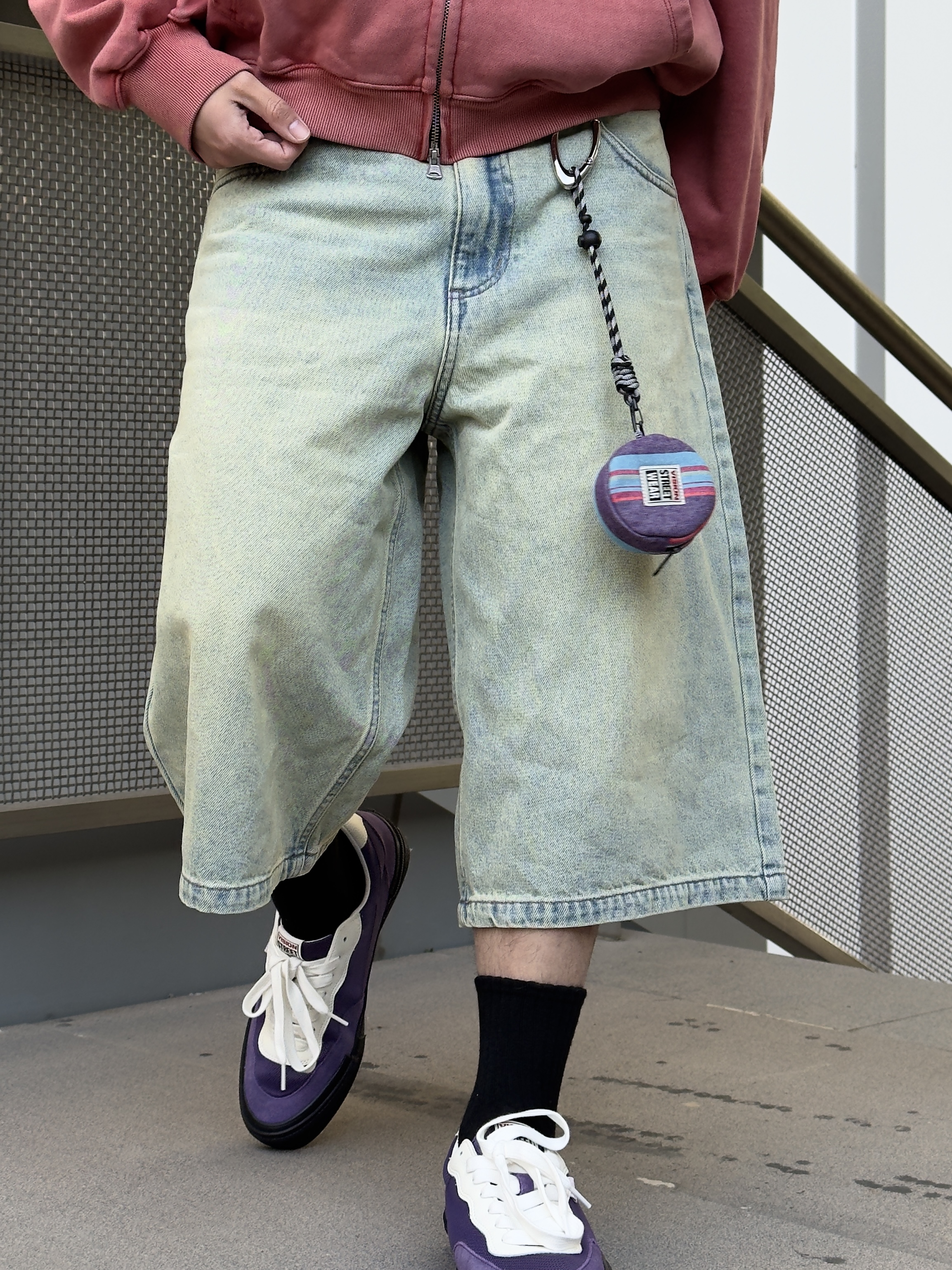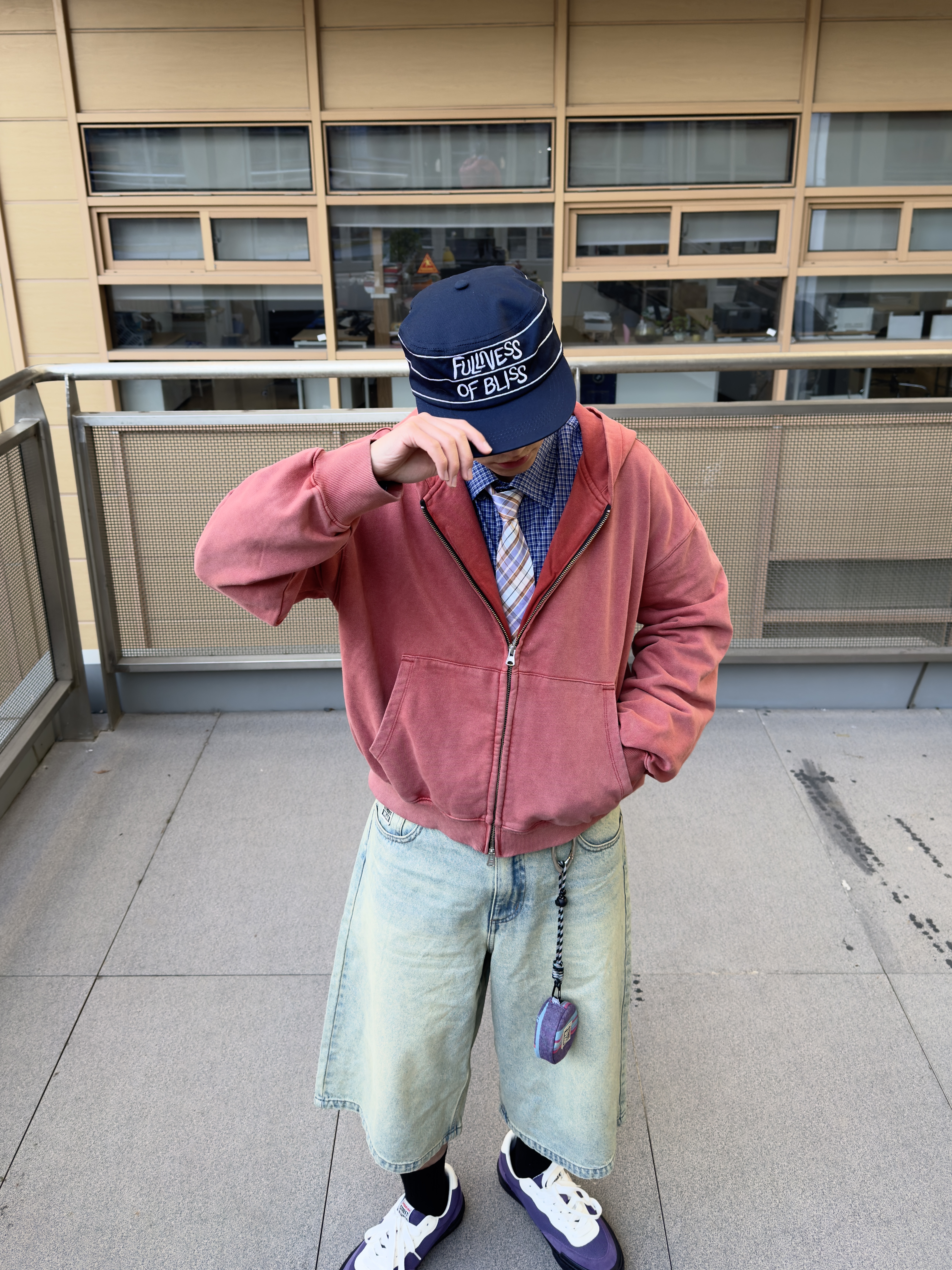 今日份搭配主打一个春日休闲搭配 上身用拉链卫衣+衬衫+领带👔做一个基础叠穿 裤子选择这条来自Vision Street Wear的七分裤🩳 做旧蓝配色质感很不错 版型偏宽松 上身腰间配一个紫色钱包👛很不错 鞋子也是来自这家品牌 紫色出片很容易 上脚有型且舒适 在呼应配饰💍的同时 还兼具了通勤穿着~