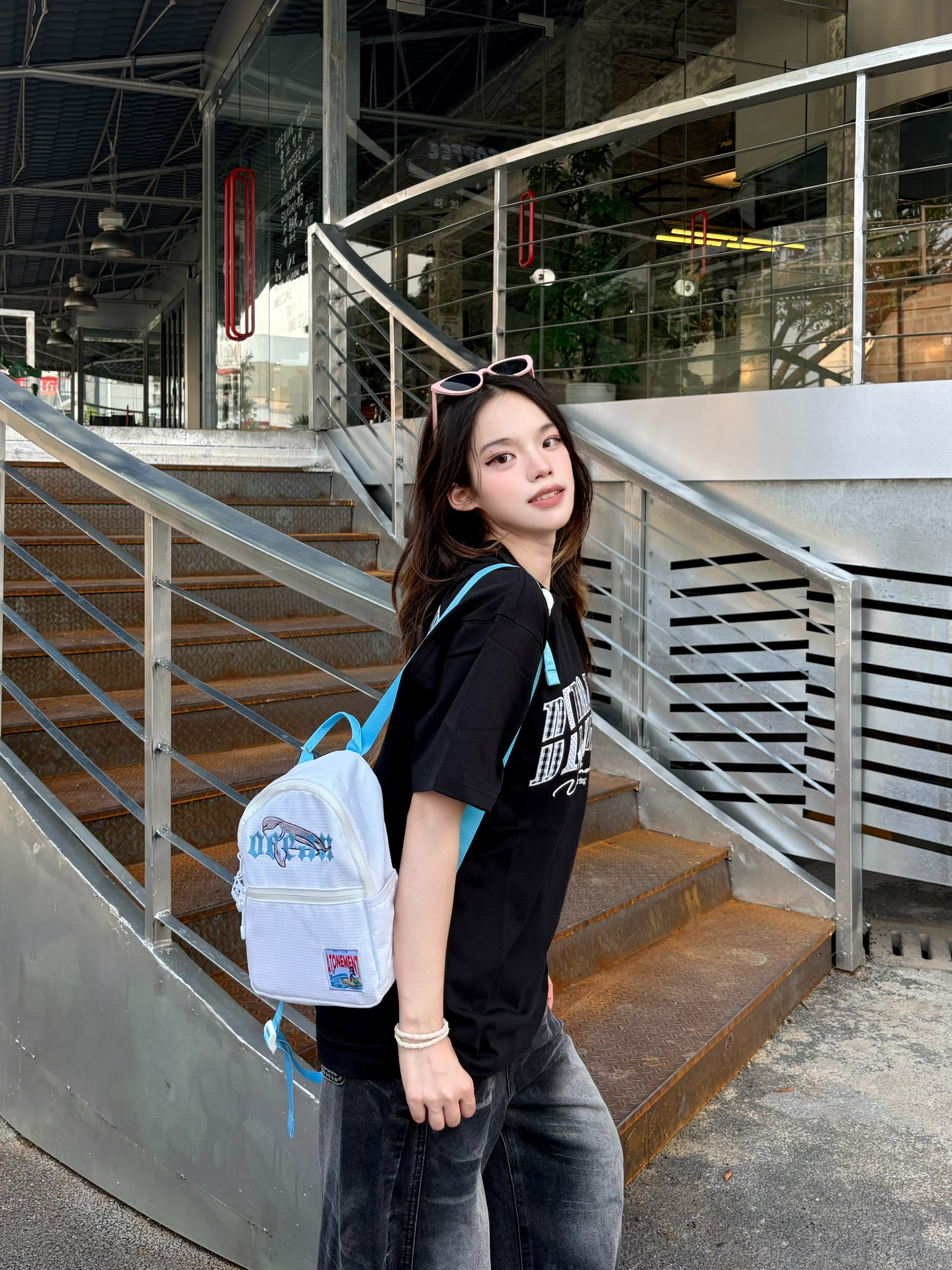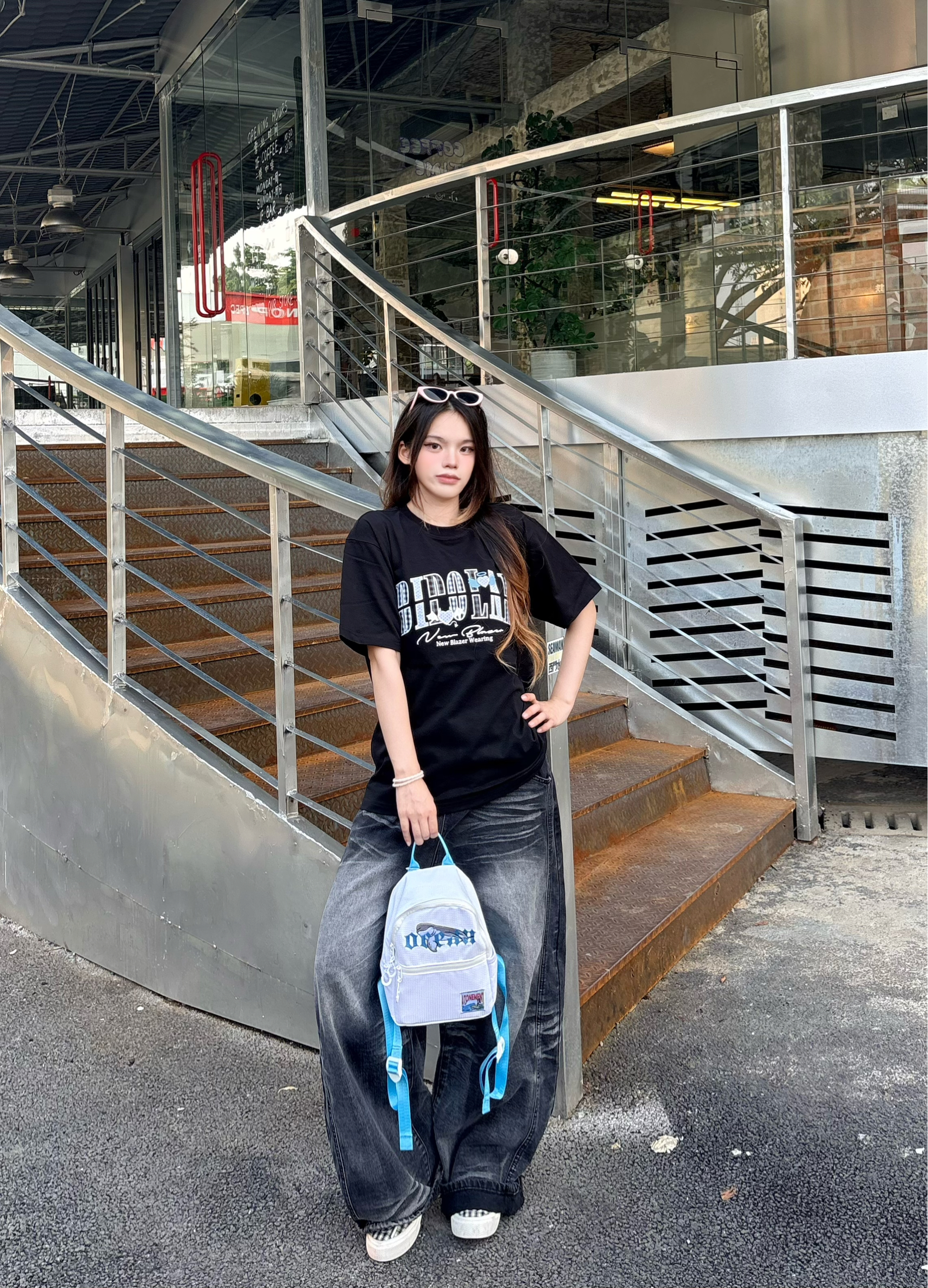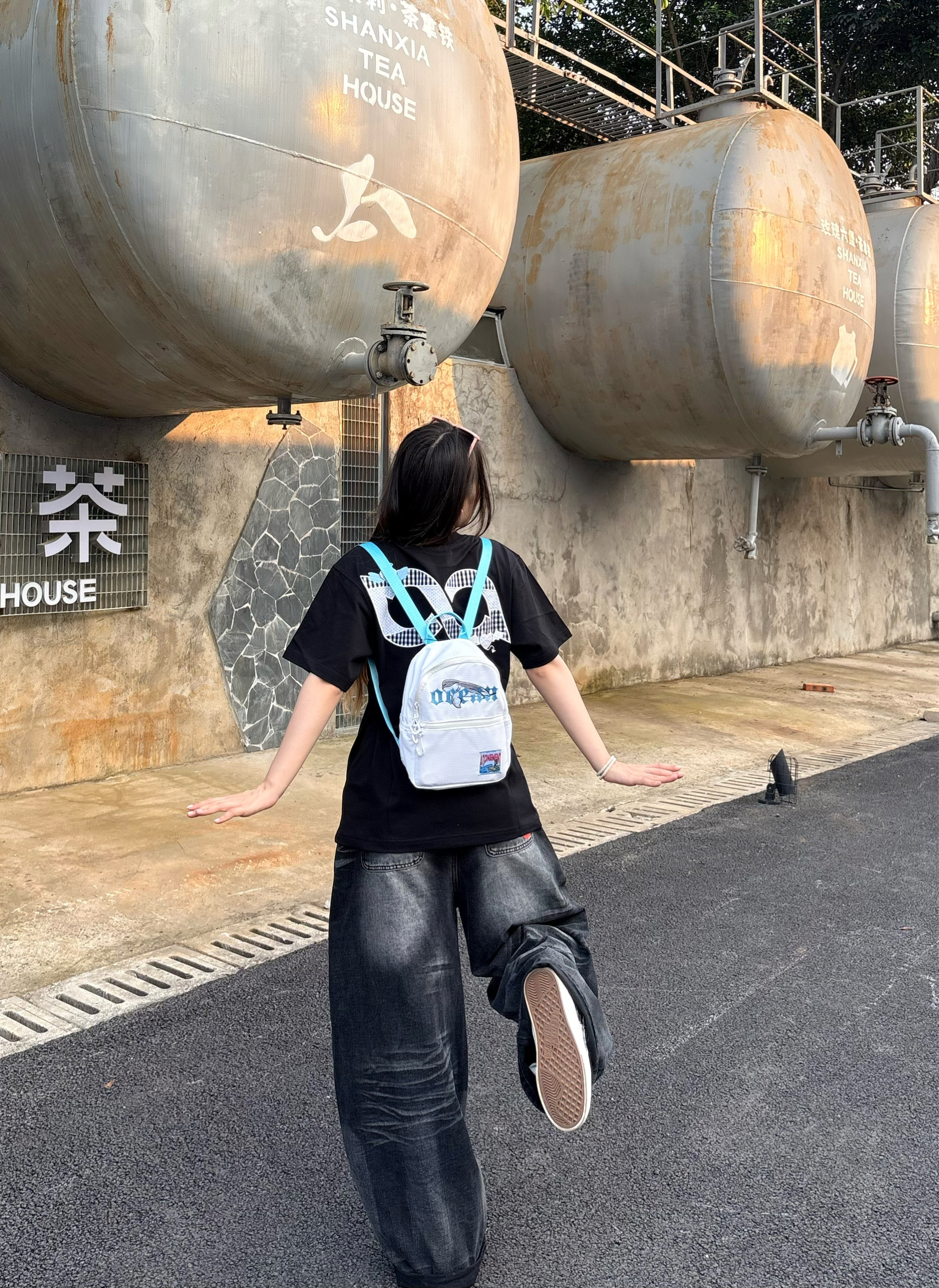 我今天这套穿搭的核心思路就是用「基础款+亮色配饰」打造美式街头甜酷感✨ • 基底选了经典黑灰系:oversize字母黑T+做旧阔腿牛仔裤,遮肉显瘦,自带松弛慵懒的街头感,不挑身材 • 用奶白撞蓝书包做点睛:给沉闷的黑灰穿搭注入活力,瞬间拉高精致度🥰 我日常出游背着装东西完全够用💯