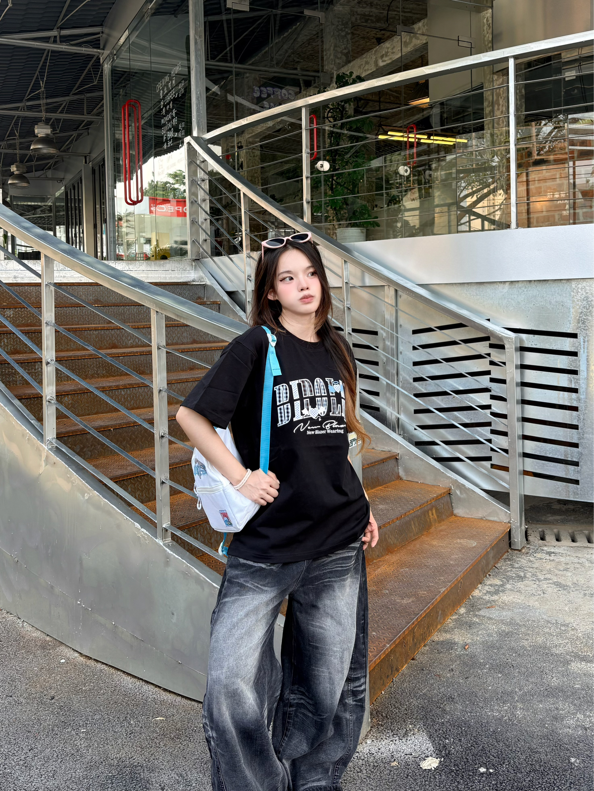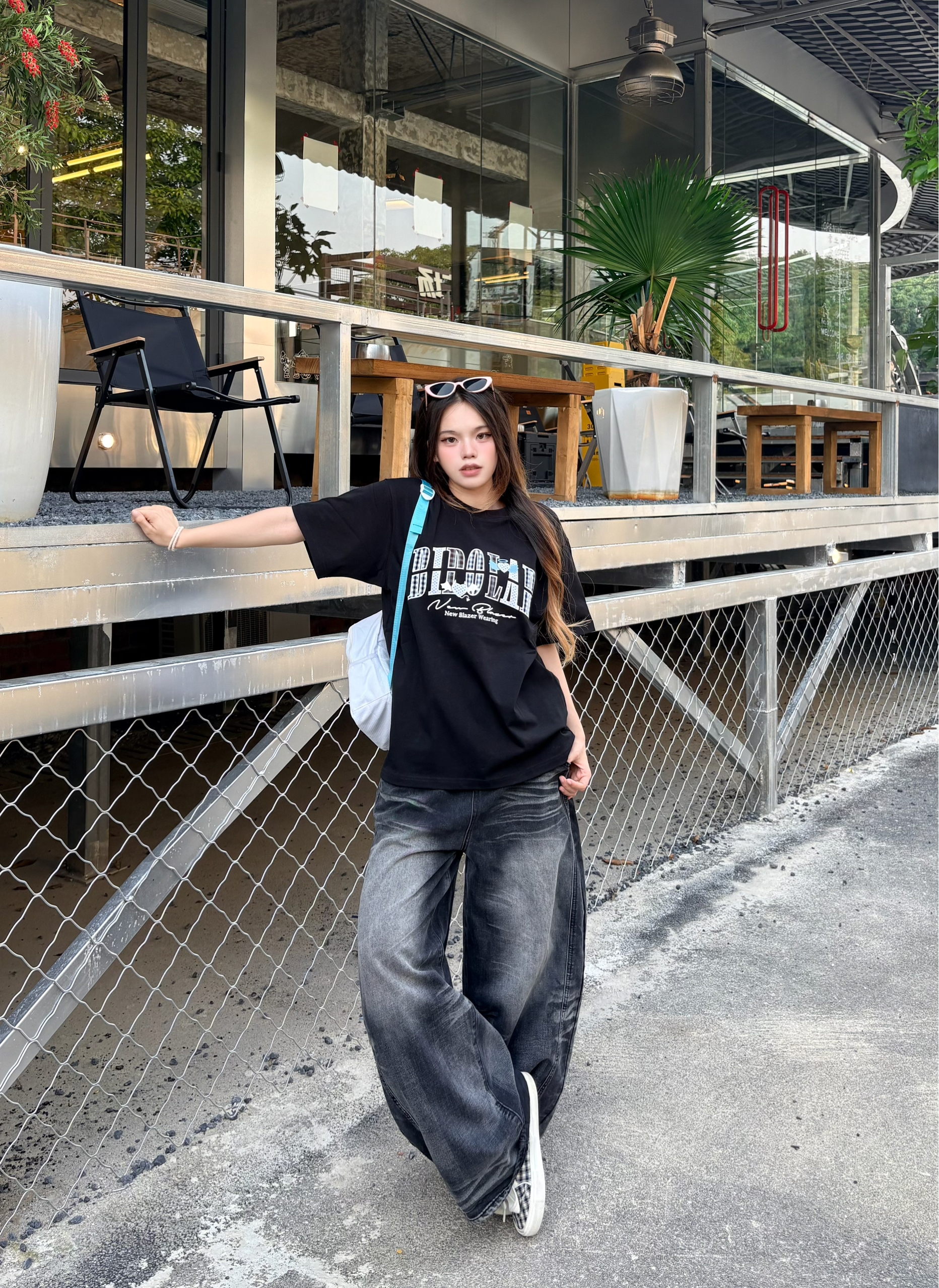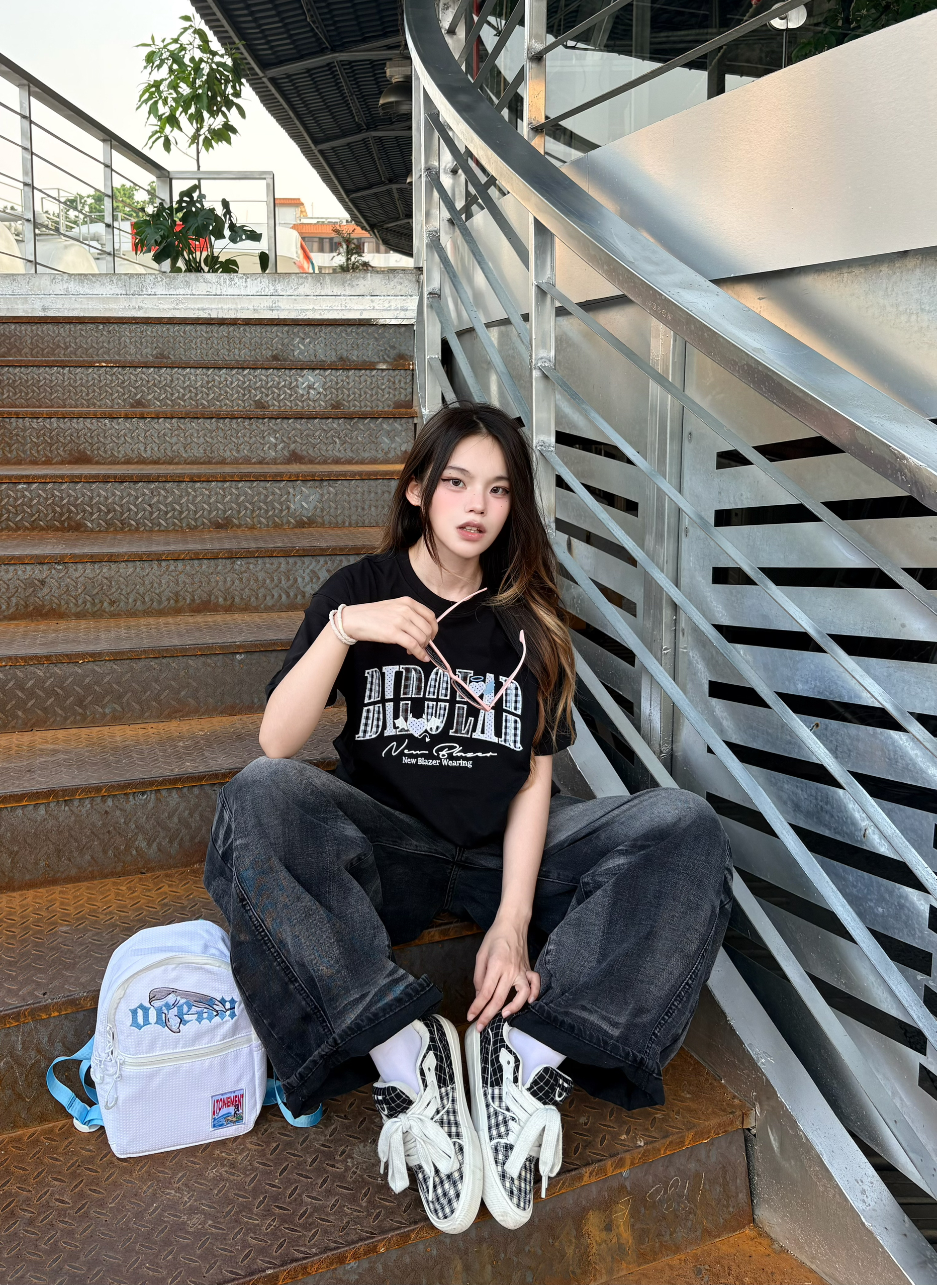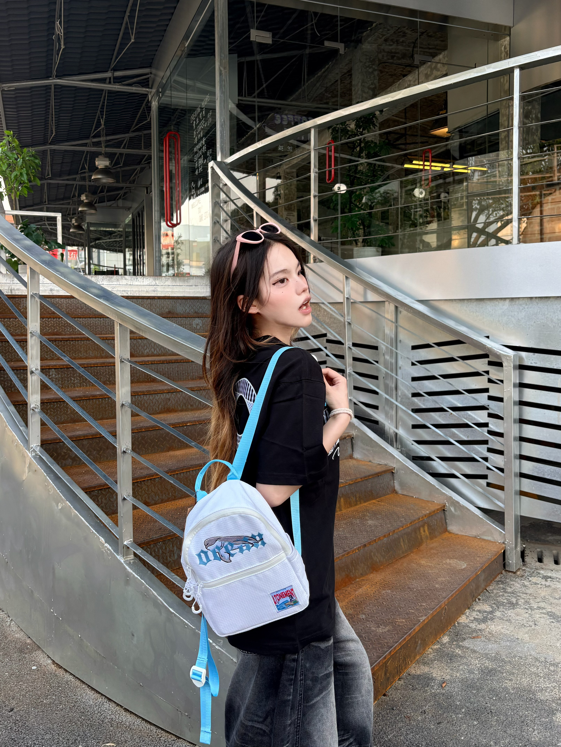 我今天这套穿搭的核心思路就是用「基础款+亮色配饰」打造美式街头甜酷感✨ • 基底选了经典黑灰系:oversize字母黑T+做旧阔腿牛仔裤,遮肉显瘦,自带松弛慵懒的街头感,不挑身材 • 用奶白撞蓝书包做点睛:给沉闷的黑灰穿搭注入活力,瞬间拉高精致度🥰 我日常出游背着装东西完全够用💯