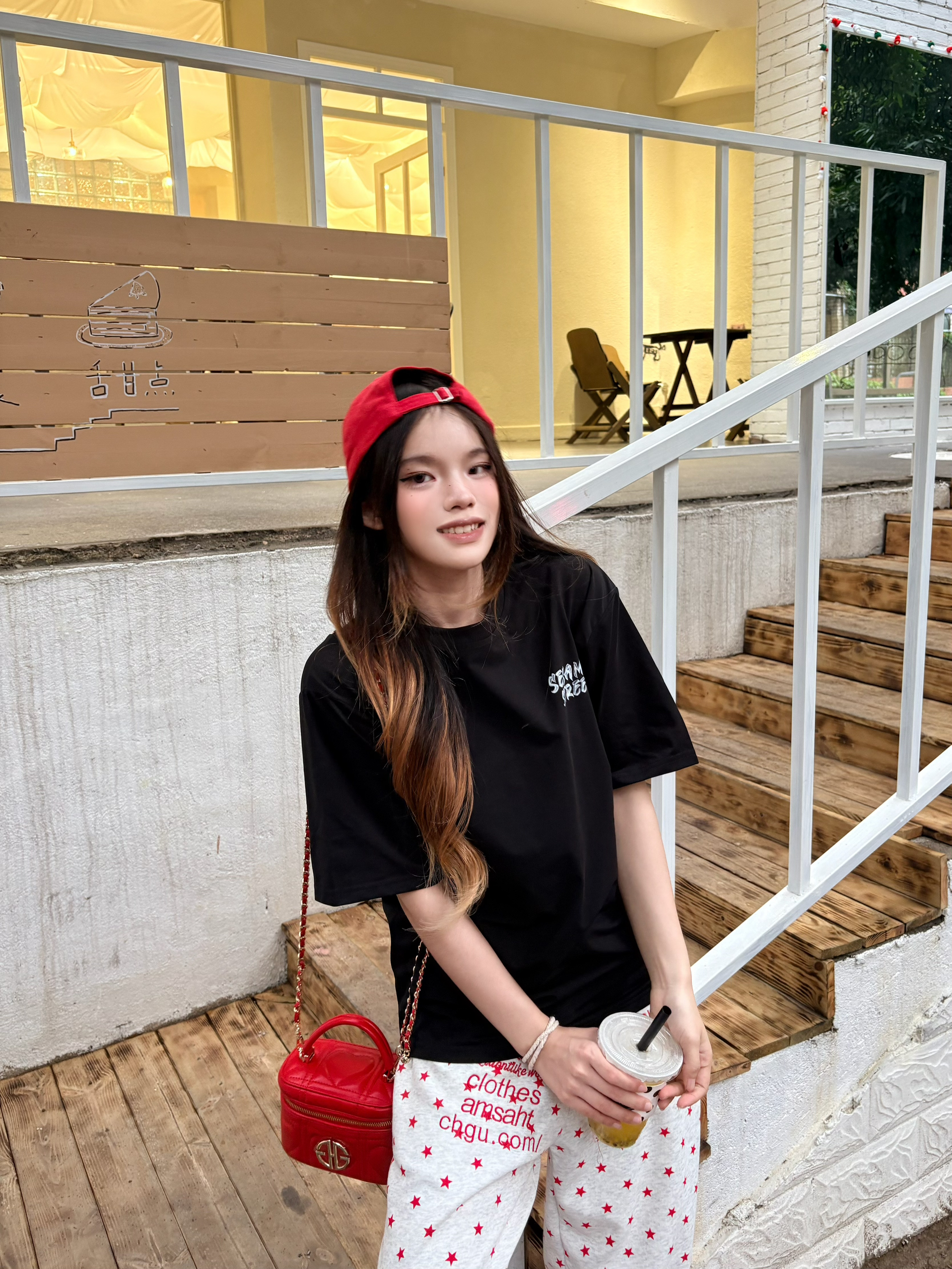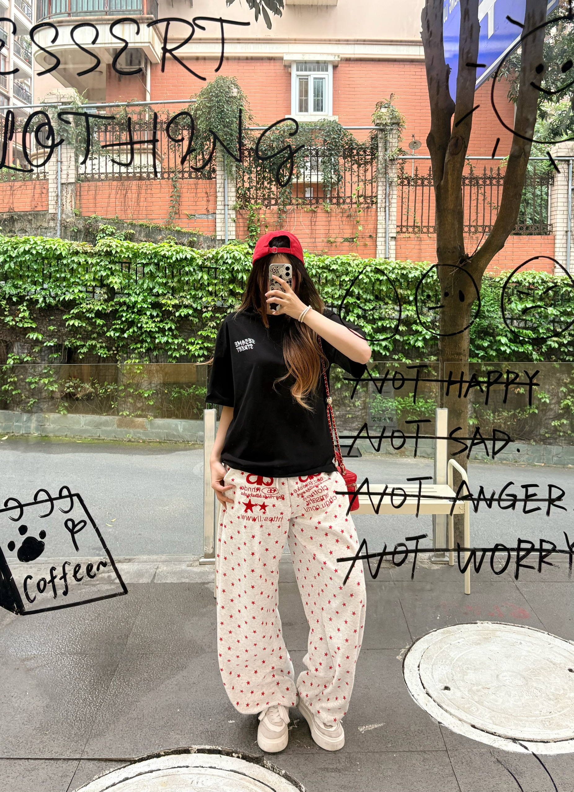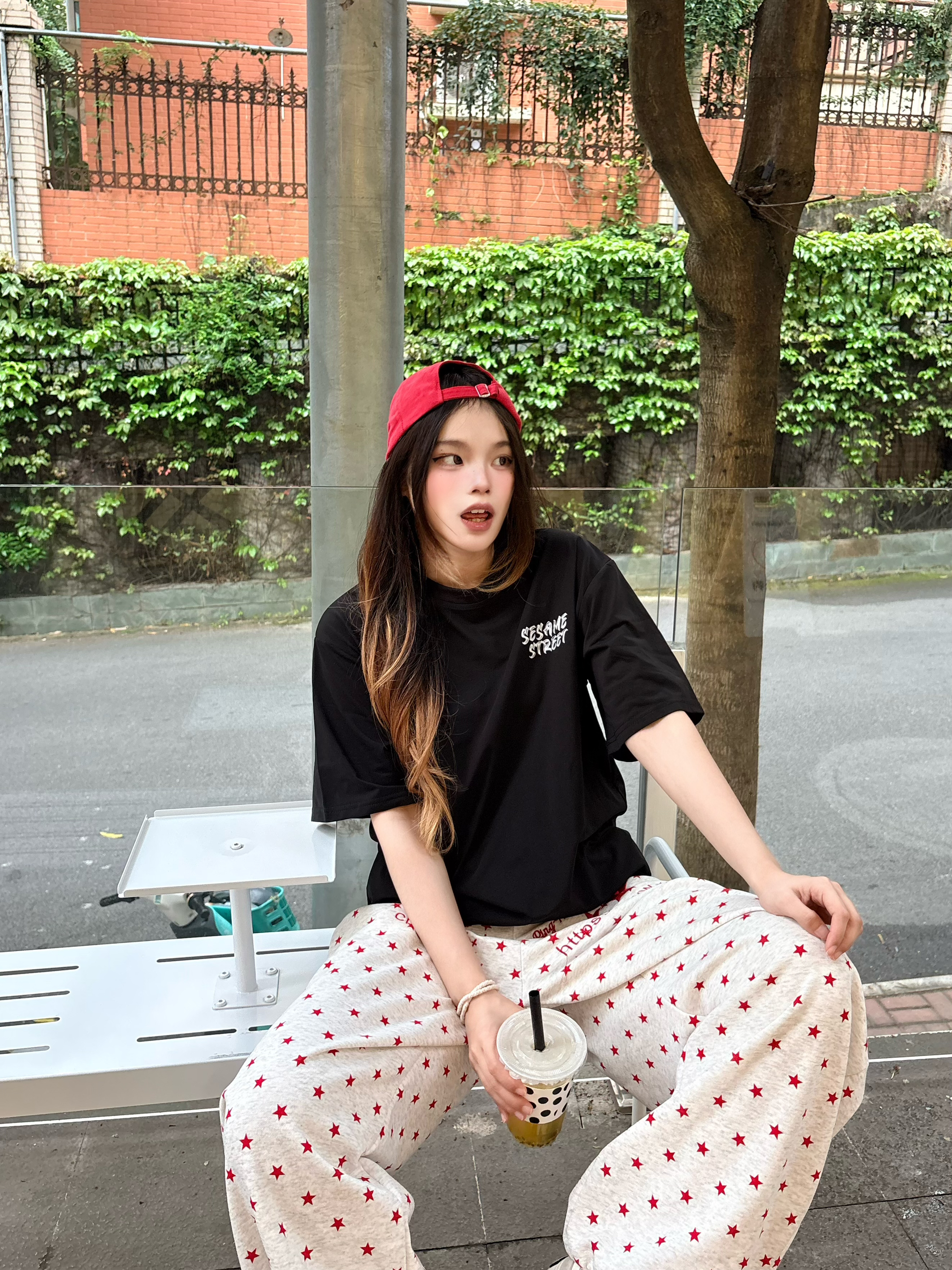 我的今日ootd 穿搭思路💡 oversize字母黑T + 红元素点缀 + 松弛感下装 = 不费力的美式街头风🧢 这套穿搭的核心逻辑,就是用「基础款+撞色+细节」,把简单的单品穿出高级感,同时兼顾舒适度和出片率,完全是懒人友好型穿搭。💯 上衣设计巧思:前后双印花设计太加分了 正面小字母标低调不突兀,日常穿不夸张; 背面大涂鸦印花转身就有亮点,拍照超有层次感,避免了纯黑T的单调。☑️ 我165/9...