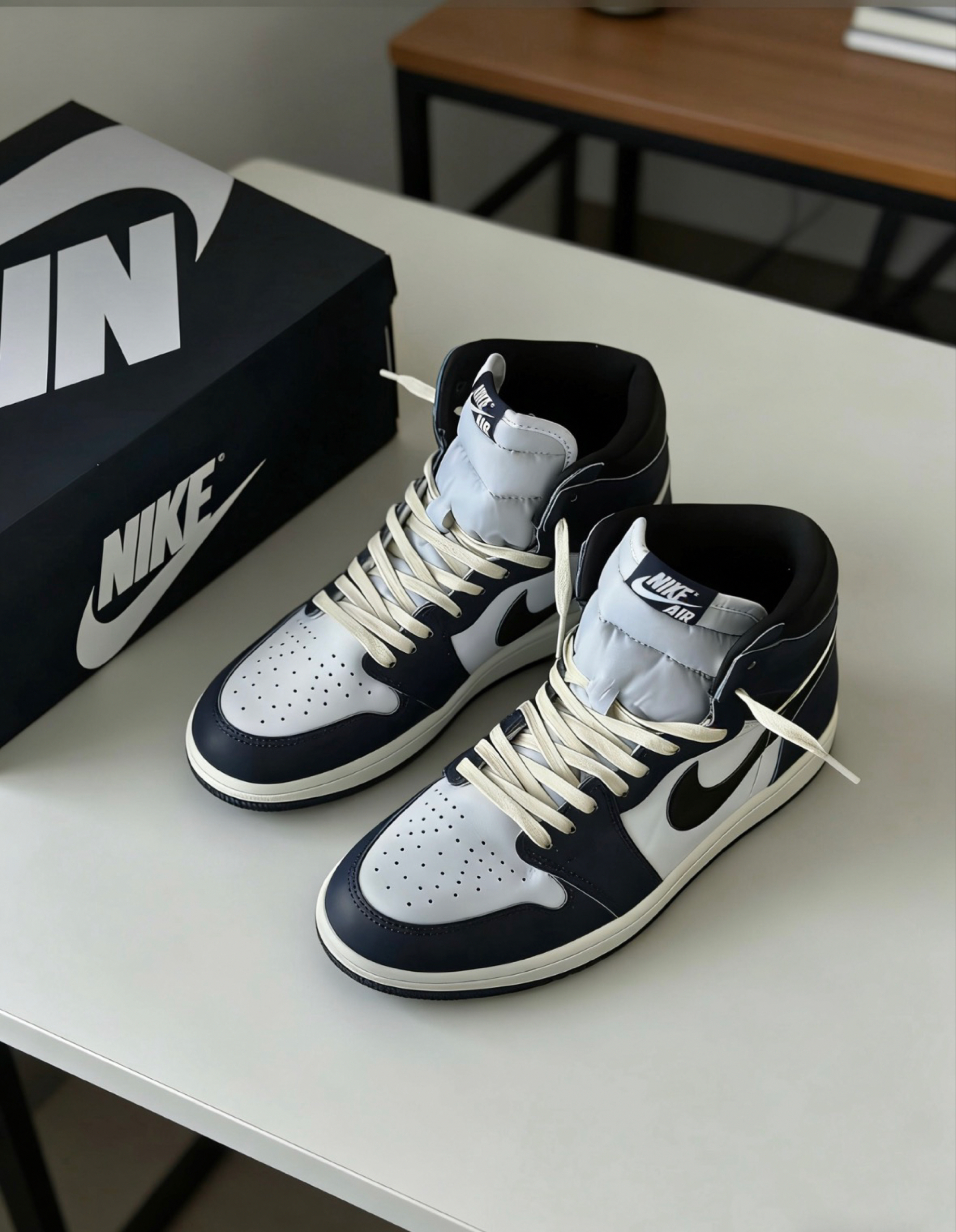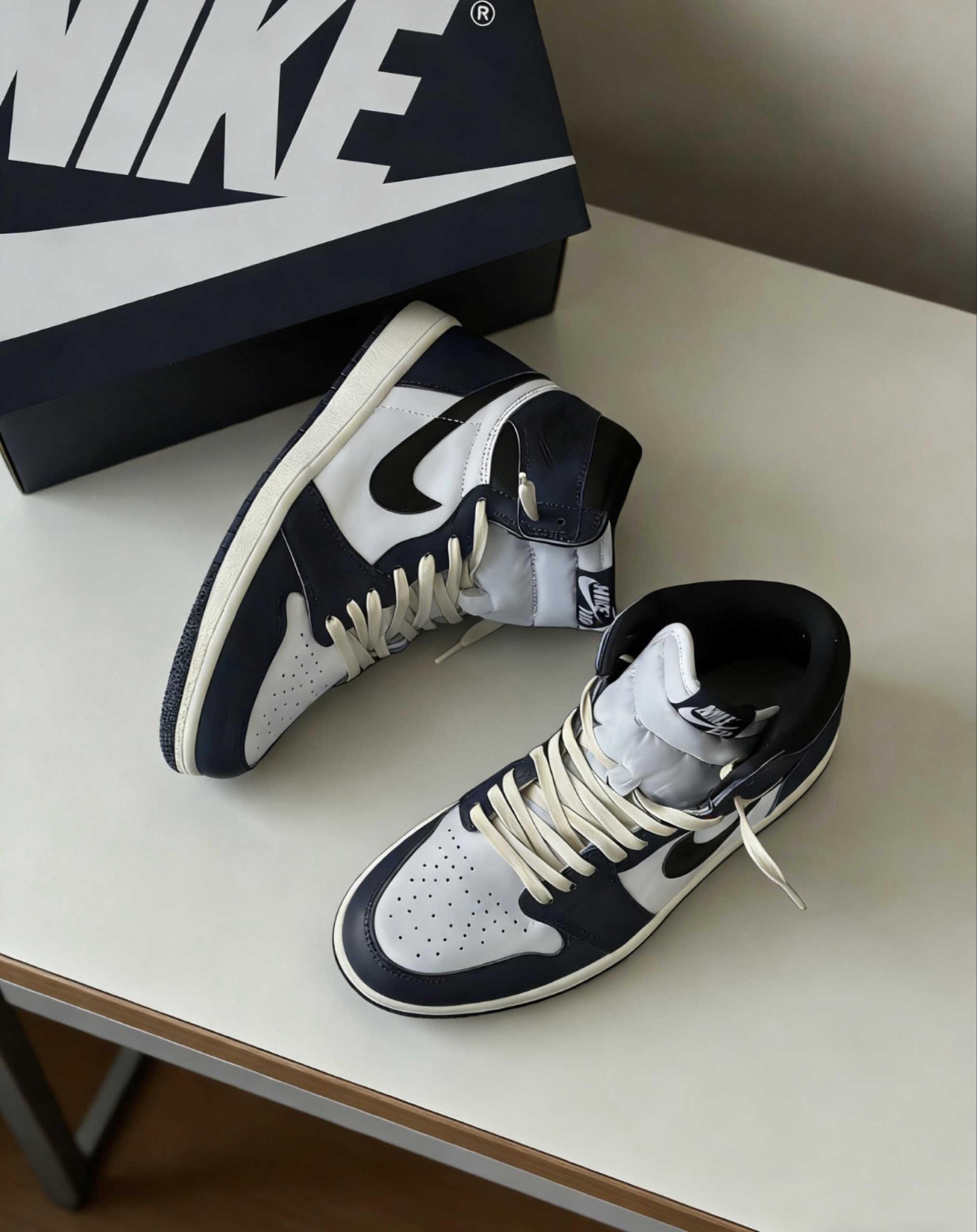 AJ1海军蓝,经典高帮版型,复古白蓝撞色超耐看,做旧中底更有质感,日常通勤或街头穿搭都很适配,百搭又显气质。