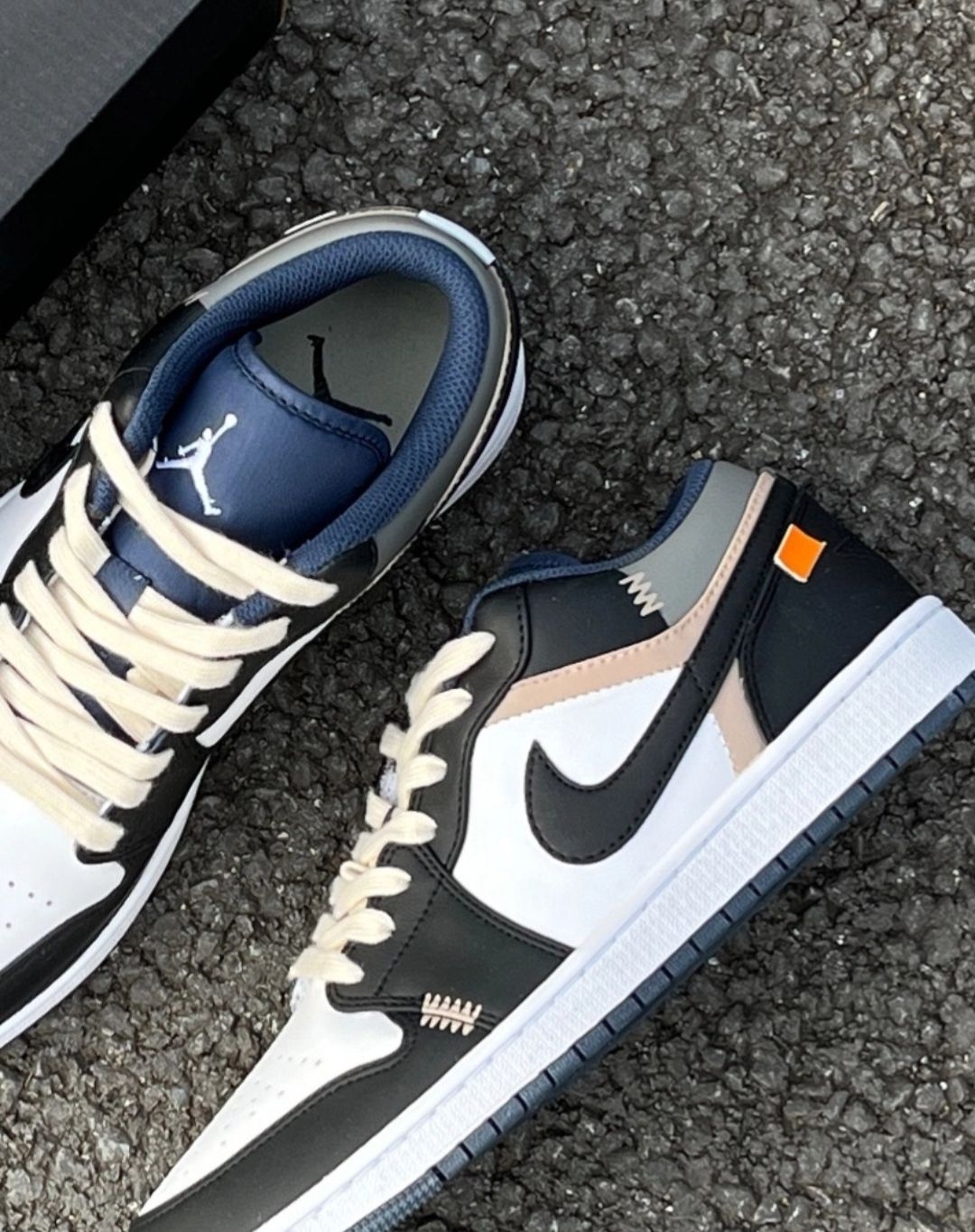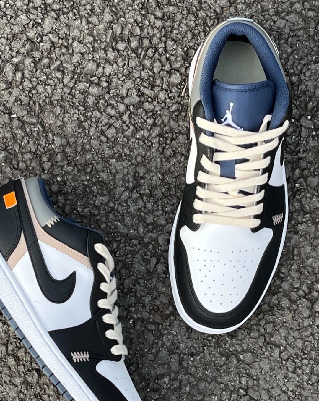 谁懂啊家人们!这双AJ1低帮真的把解构风玩明白了😭 黑白撞色+藏蓝鞋舌+米白做旧鞋带,复古感直接拉满 后跟橙色小标直接致敬OW联名,细节控狂喜✨