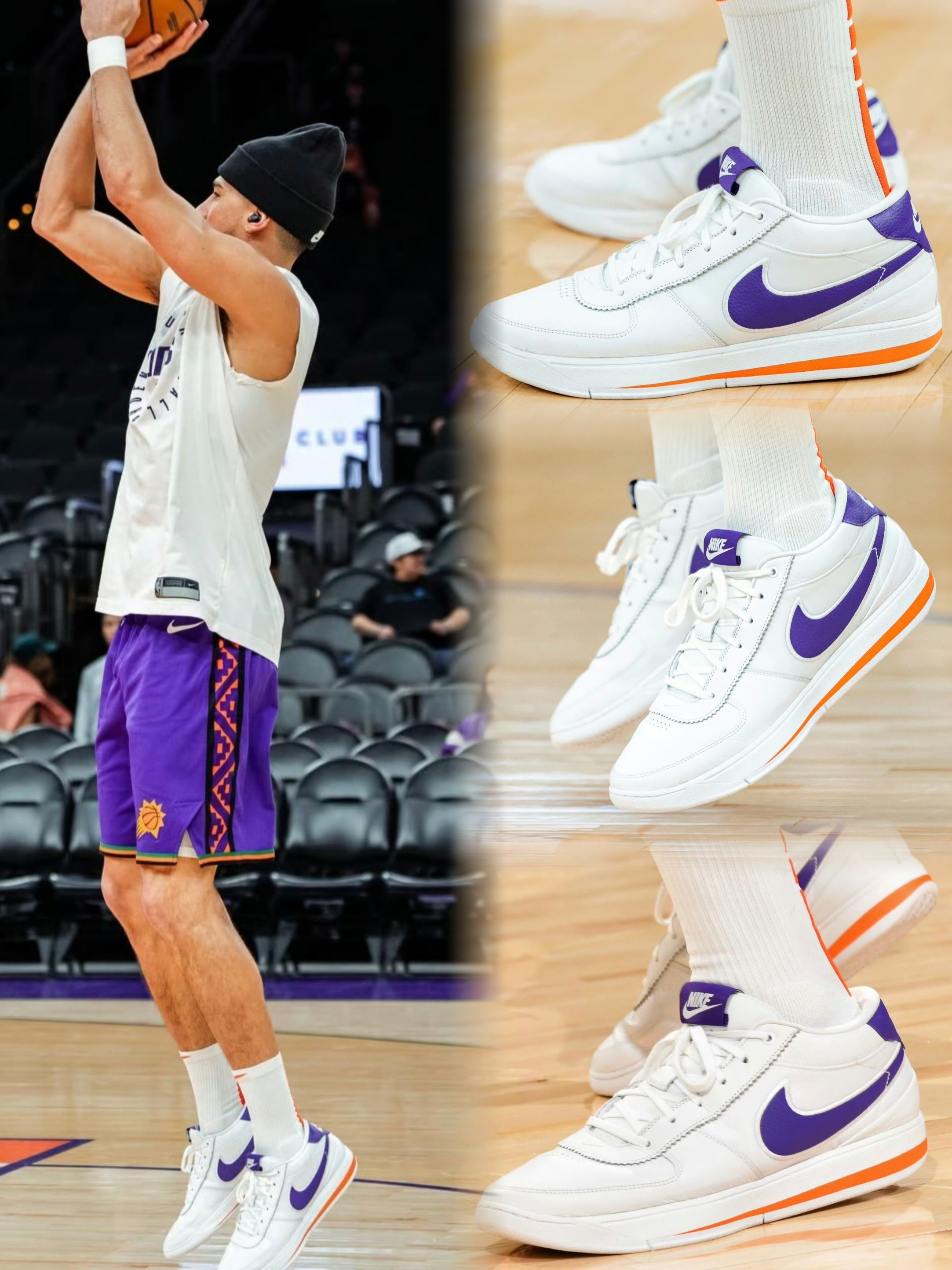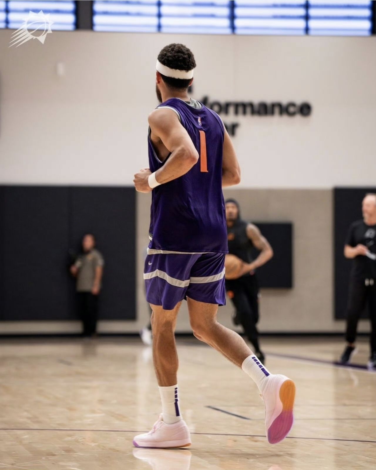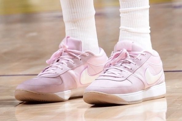 这双是布克首款签名鞋Book 1的“97005”球员版,淡粉蛇纹皮面配珊瑚粉鞋带,看着很温柔。全掌Cushlon 2.0泡棉+后跟Zoom Air,脚感软弹,XDR外底也耐磨,日常打球穿搭都合适。