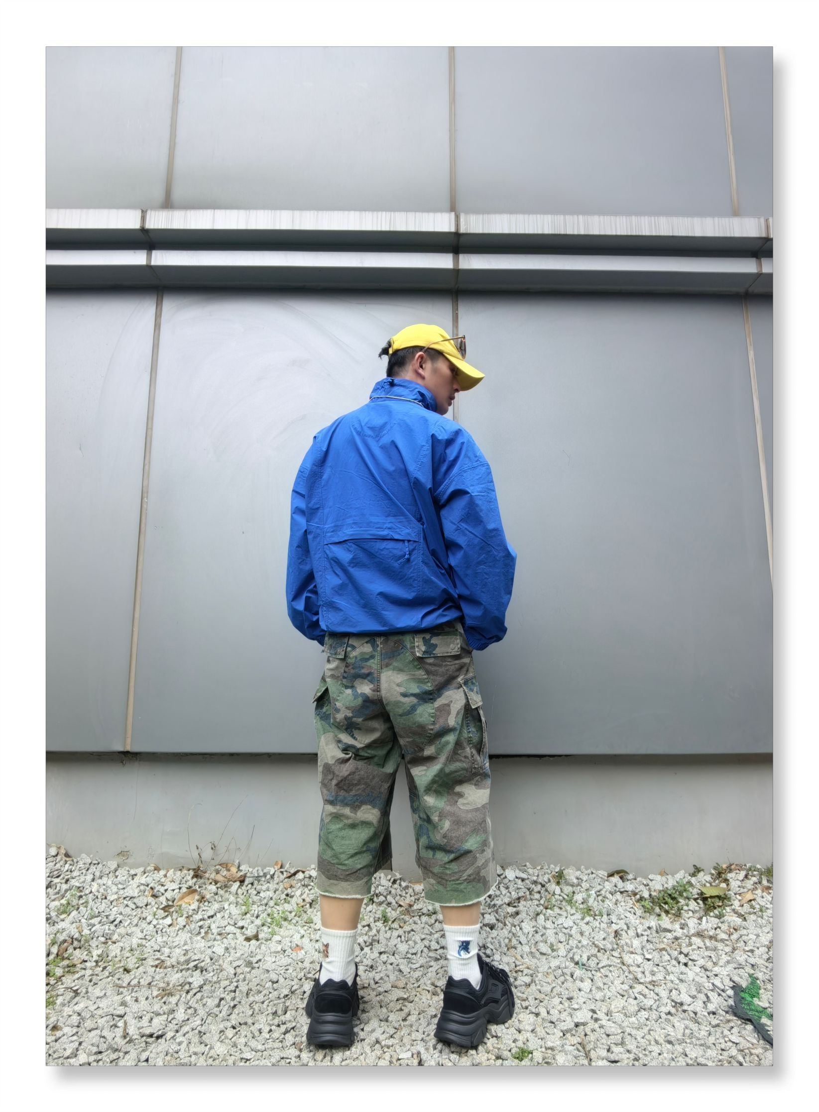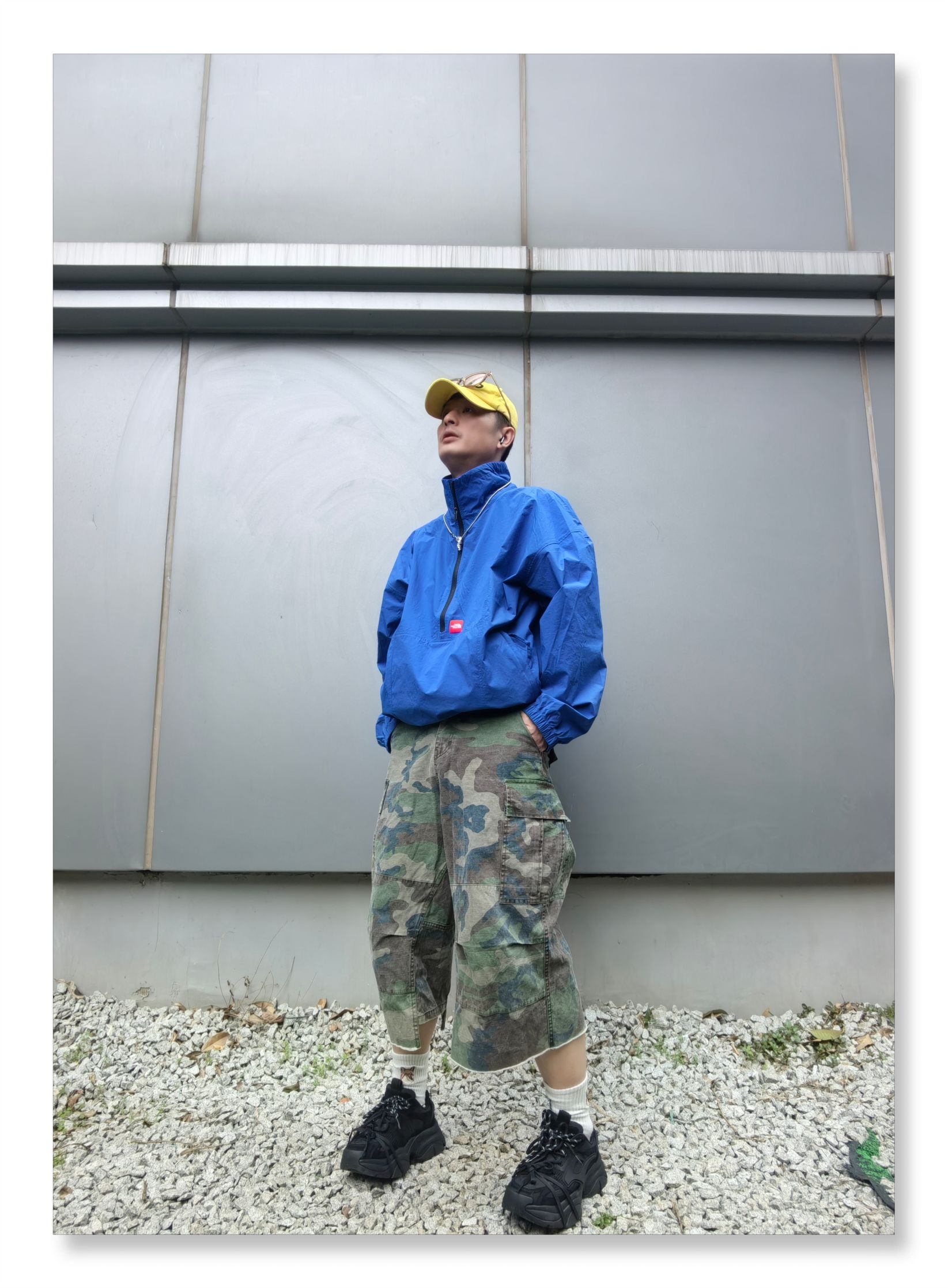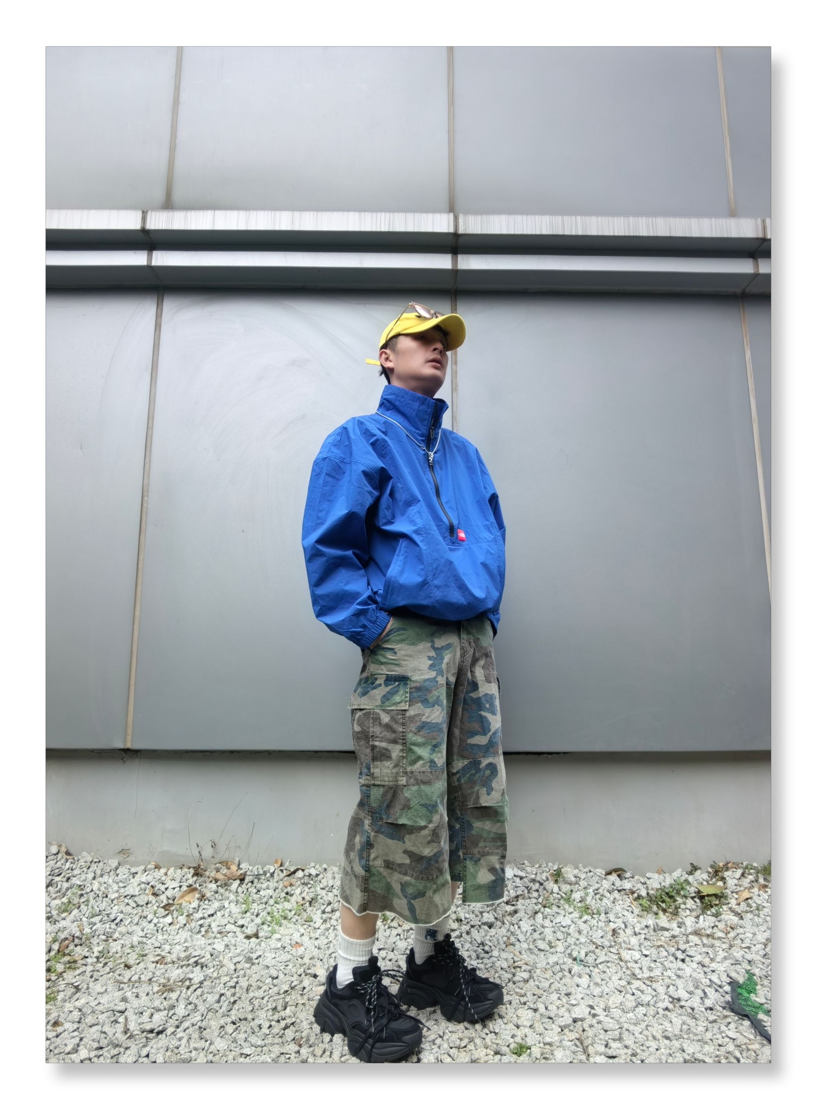 克莱因蓝Red Box皮肤衣 + 迷彩七分工装裤 + 黑色厚底老爹鞋穿搭 上衣:北面高饱和克莱因蓝梭织上衣 打造视觉焦点,亮黄色帽子做撞色提亮,瞬间打破沉闷,美式户外感拉满; 下装选择做旧迷彩七分工装裤,复古工装风与皮肤衣的户外属性完美契合,七分裤长露出脚踝,搭配厚底鞋,显高又利落 黛西法罗 鹰眼 黑色厚底老爹鞋 呼应整体户外调性,同时平衡上装的亮色,造型更稳。