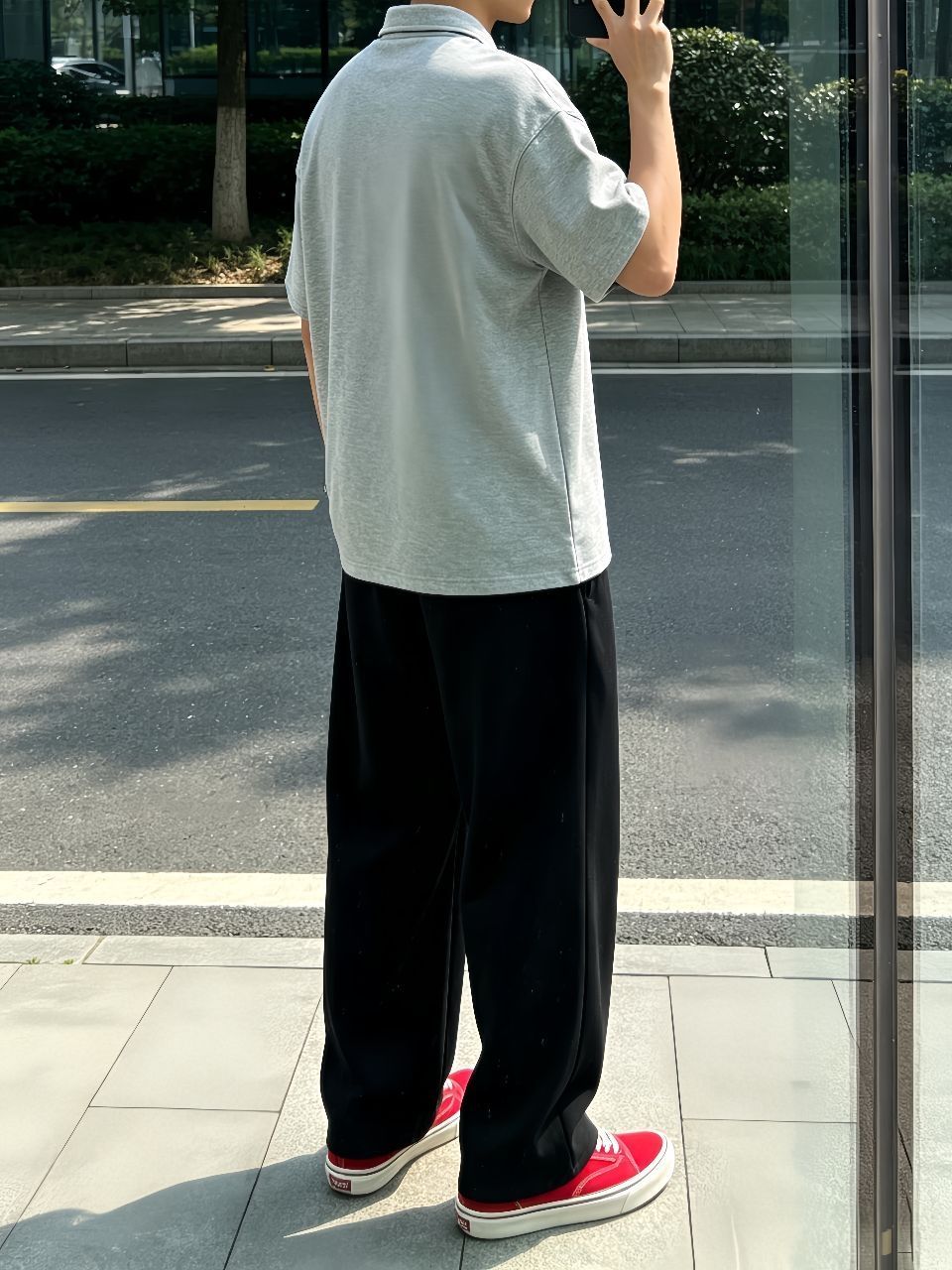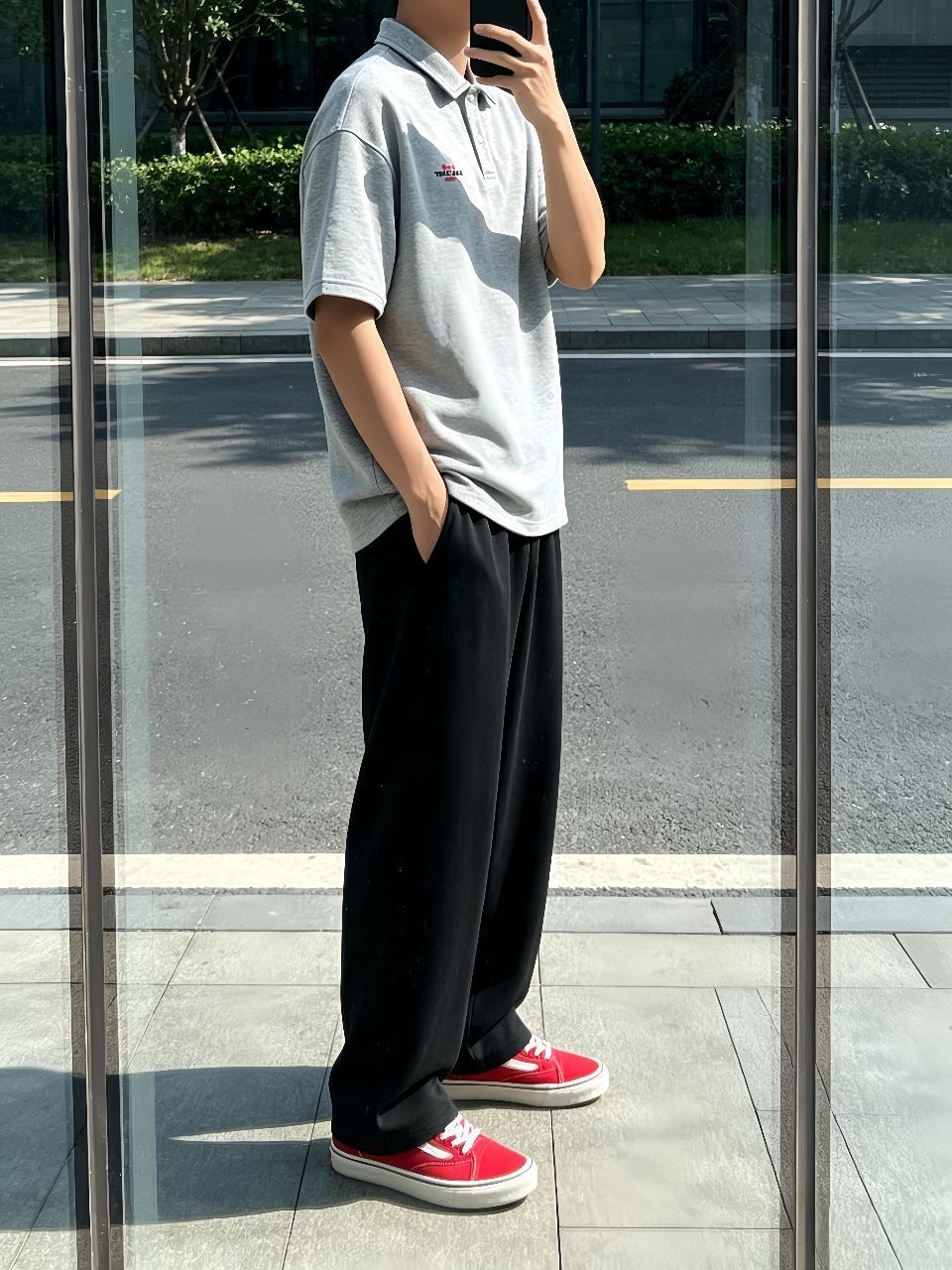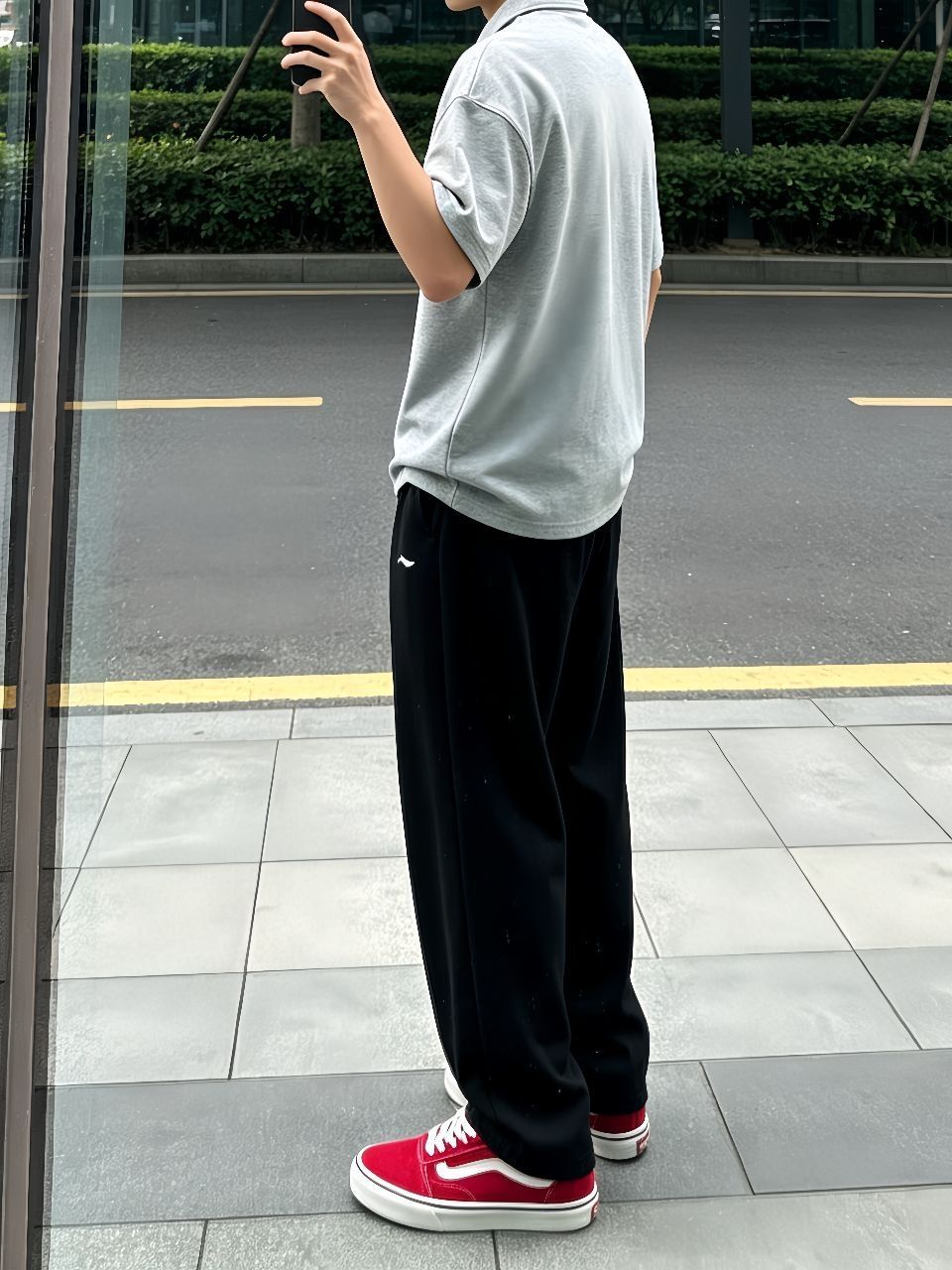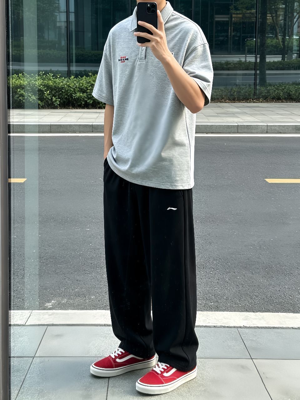 今儿这身真穿得住!MANYSTON这件Polo衫,胸前小徽章挺有意思,260g棉质料子厚实不软塌,单穿或当薄外套都行。李宁这条卫裤真是我近期最爱,棉质宽松直筒,膝盖不绷,坐下起来都没褶子。Vans红板鞋低帮正好露脚踝,颜色给全身提了个亮。三件搭一起就是那种不用费力的街头感,上班周末都能穿。关键是真舒服,出门随便一套就走,不挑人。