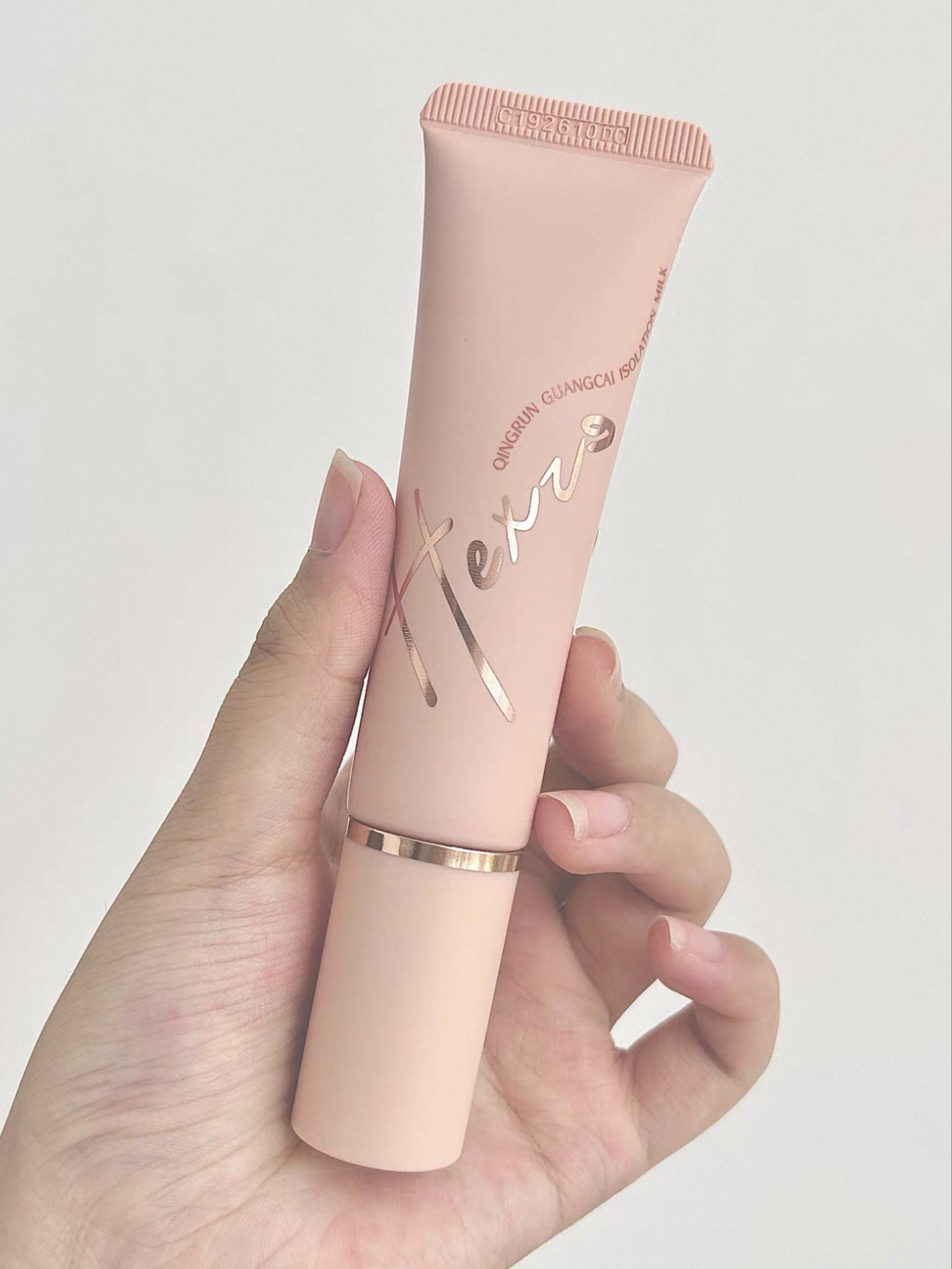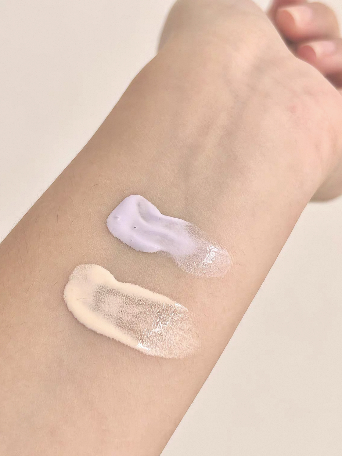 奶油乳液的质地有一点流动性,上脸很滋润不油腻。 伪素颜底妆很适合用这种,上妆效果轻薄不厚重,打造妈生无暇皮。 搭配送的紫色隔离效果会更好。