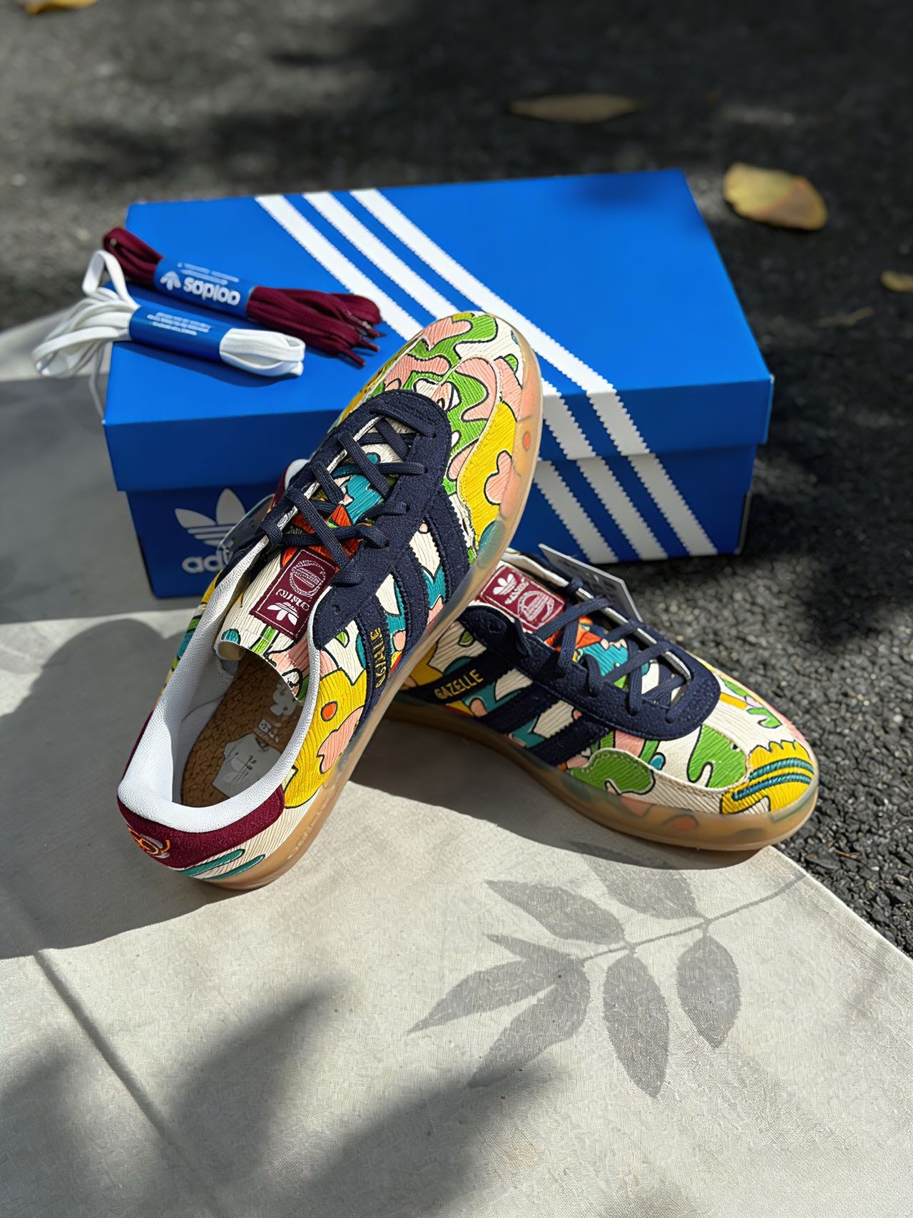 上脚这双Sean Wotherspoon联名GAZELLE,第一眼就被多彩的灯芯绒图案吸引住了! 鞋面摸着有纹理感,软木塞鞋垫踩上去软软的,走路一天都不累脚👟白彩配色超清爽 搭配牛仔裤或工装裤都很有复古感~半透明生胶底防滑不错,下雨天穿也不怕打滑 不过灯芯绒材质确实有点娇贵,出门得小心别蹭脏了,打理起来要费点心思 整体来说颜值真的高,适合日常穿搭和citywalk,男女同款配情侣鞋也超合适