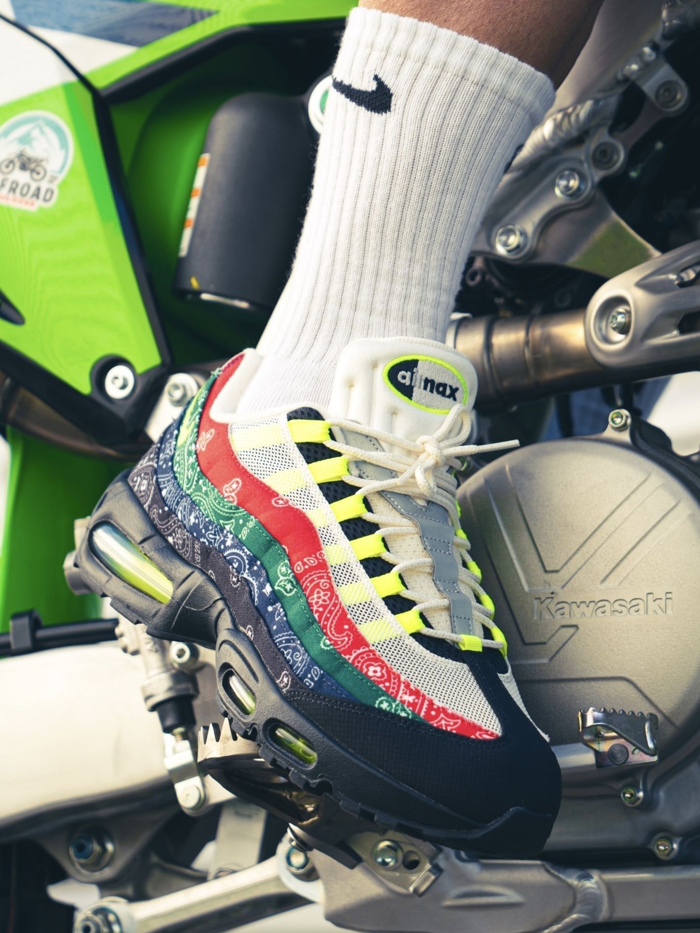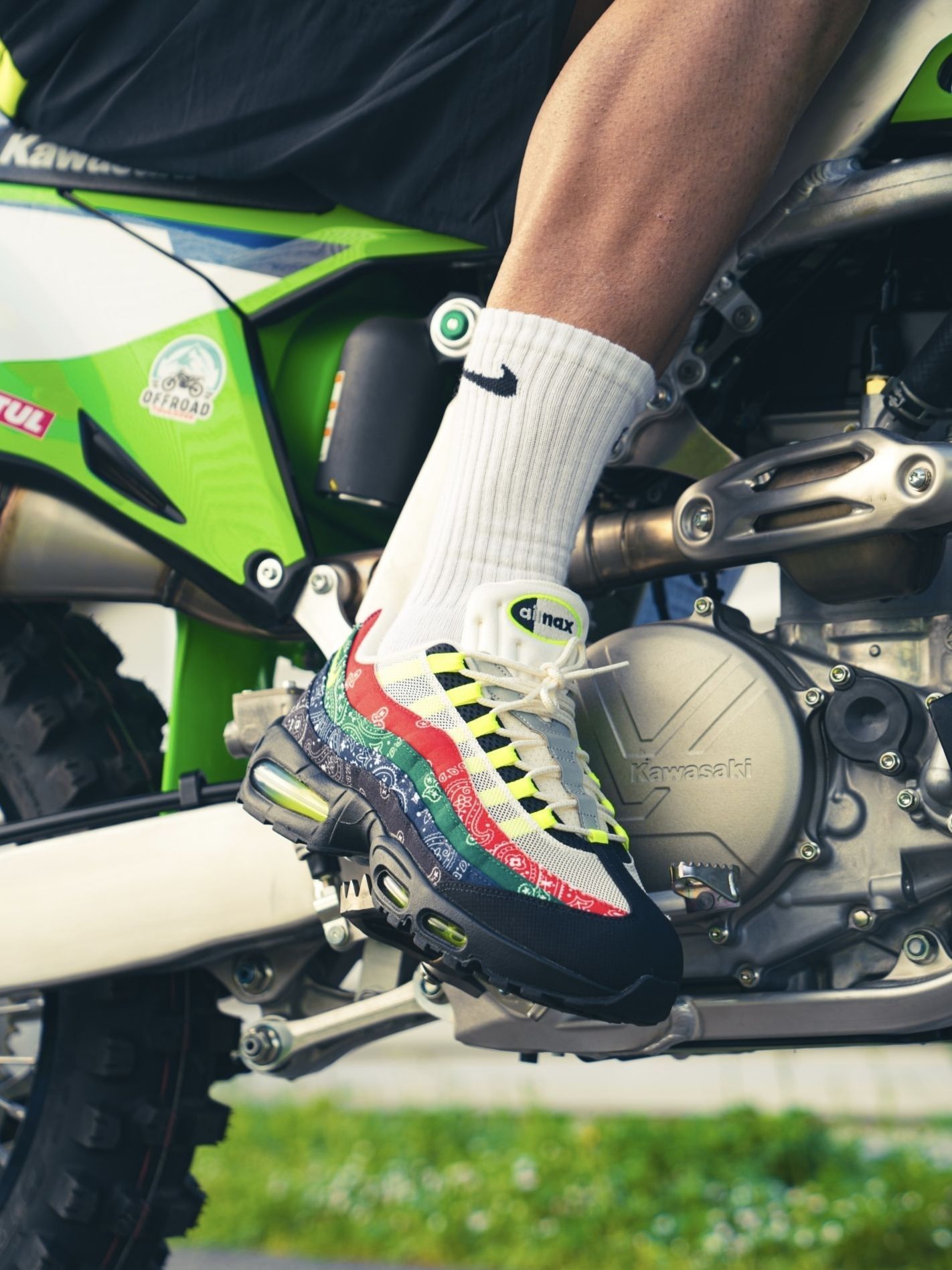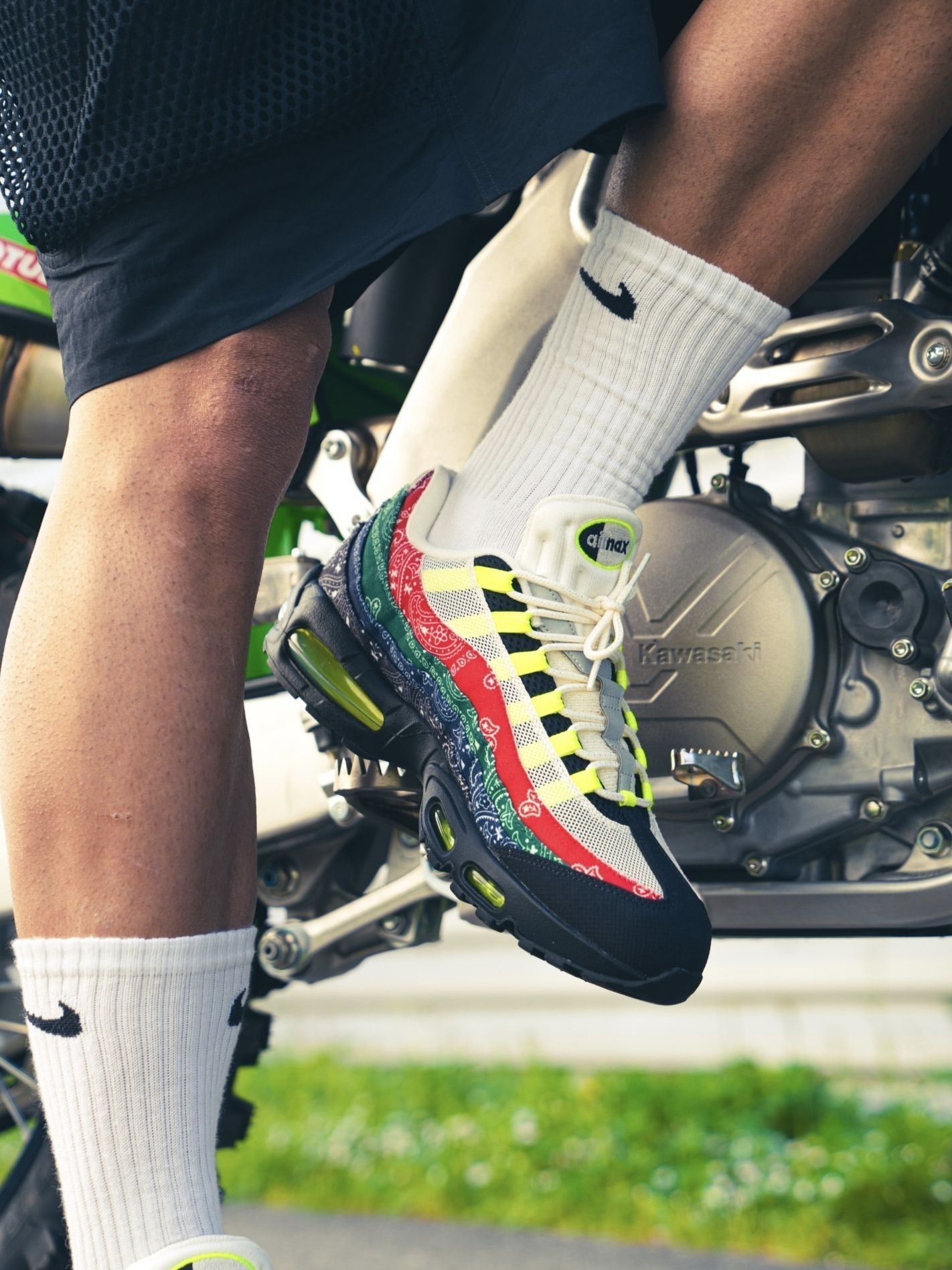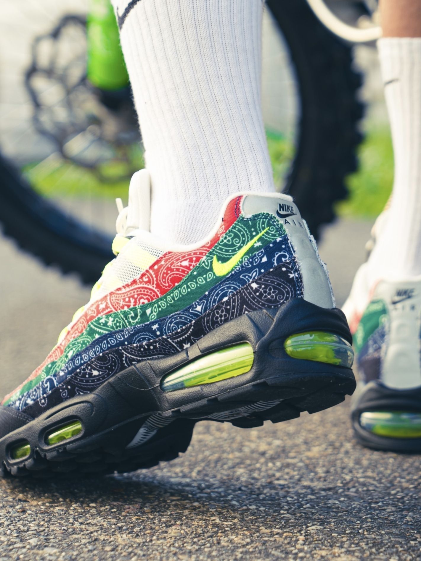 我直呼带感,这双Air Max 95 Big Bubble是我近期上脚最野的一双。周末骑越野摩托跑山、逛市集,连着穿了一整天,网布+腰果花布面的拼接鞋面透气不闷脚,前后掌可视化气垫回弹感很明显,走久了也不会脚酸,鞋身的分层设计贴合脚型,完全不用担心磨脚,复古轮廓还能修饰腿型。 越看越爱它的撞色腰果花设计,黑红绿的渐变条纹搭配经典佩斯利花纹,像把复古街头的活力踩在脚下,黄色鞋带和Big Bubb...