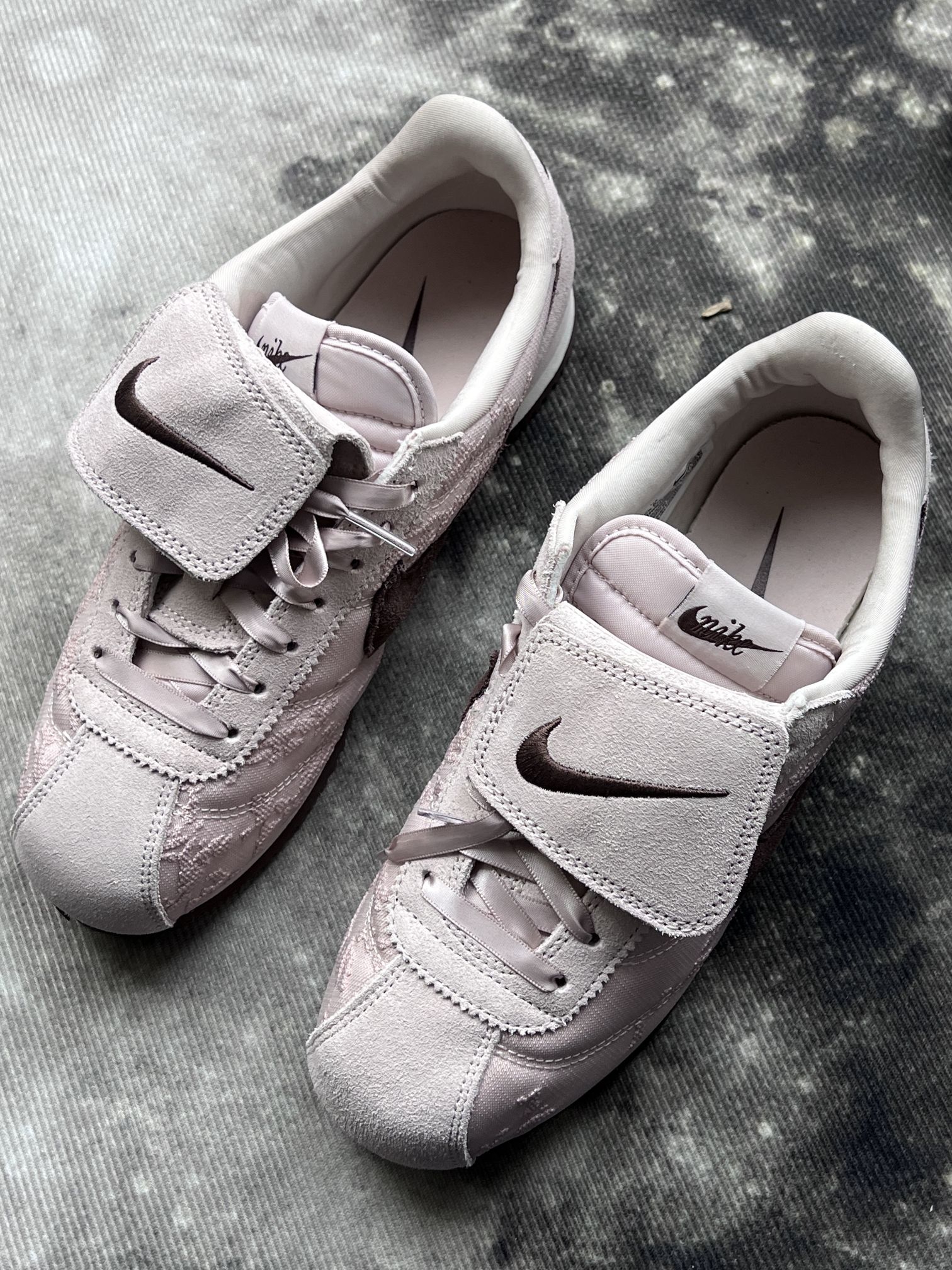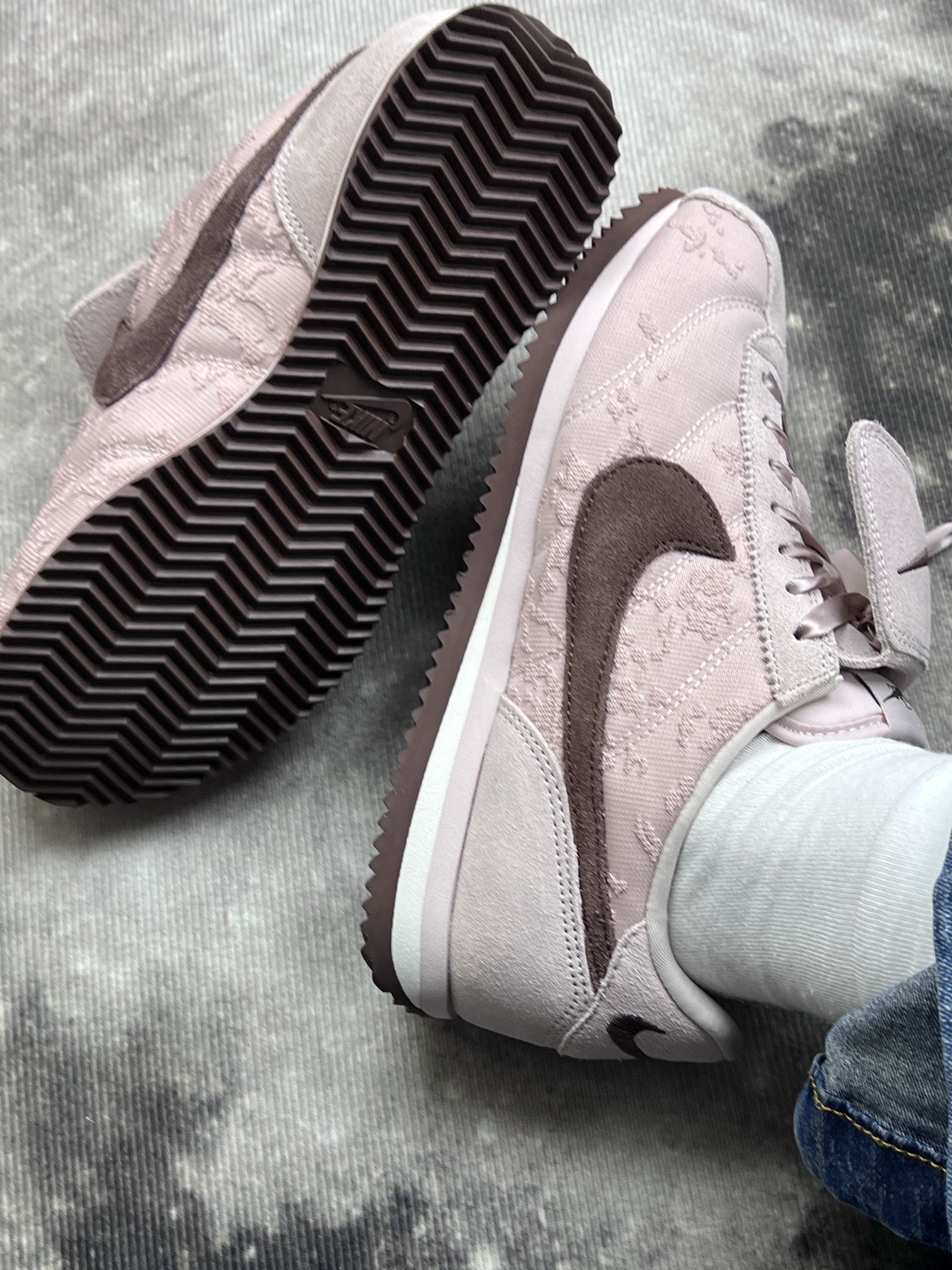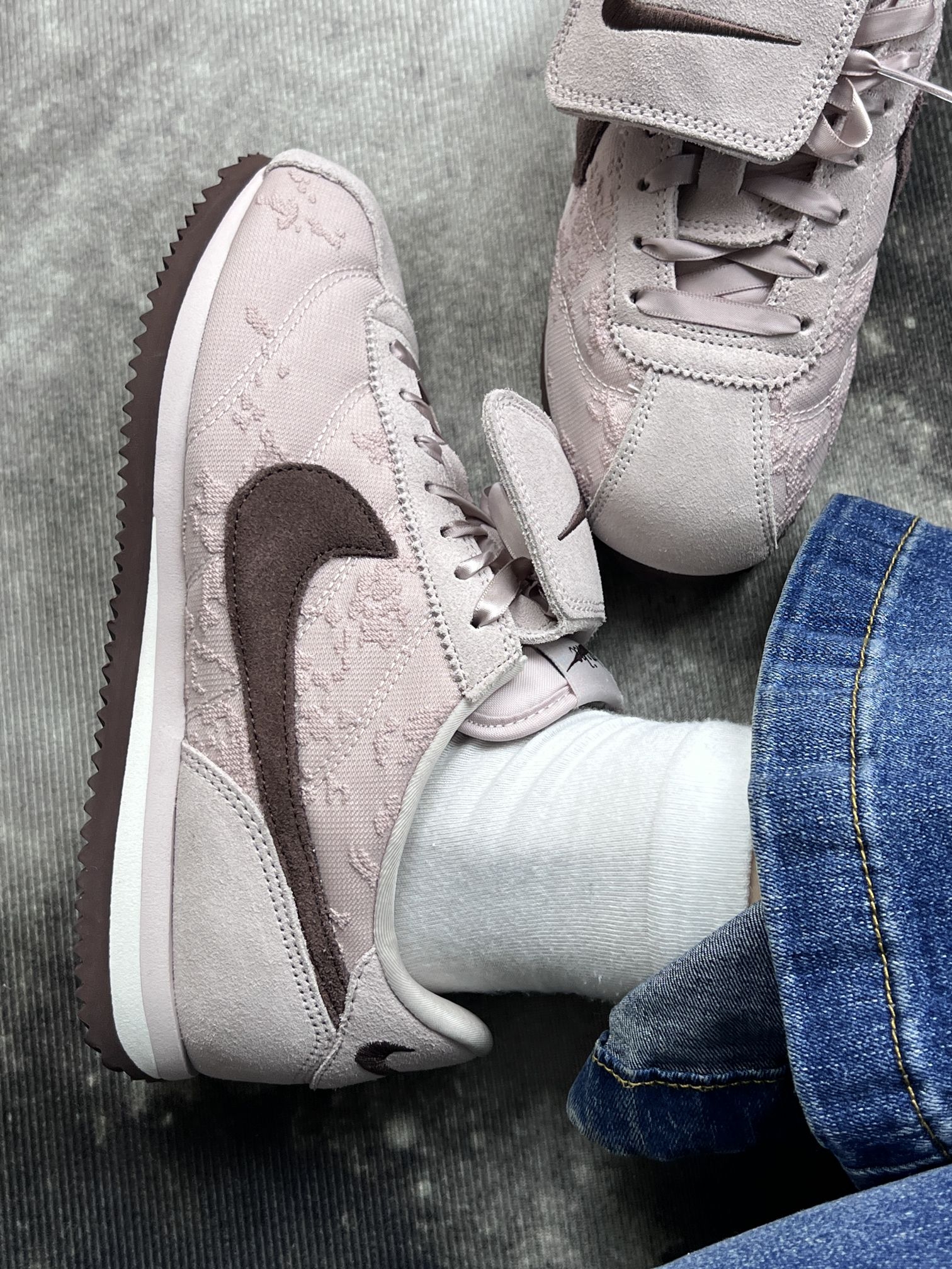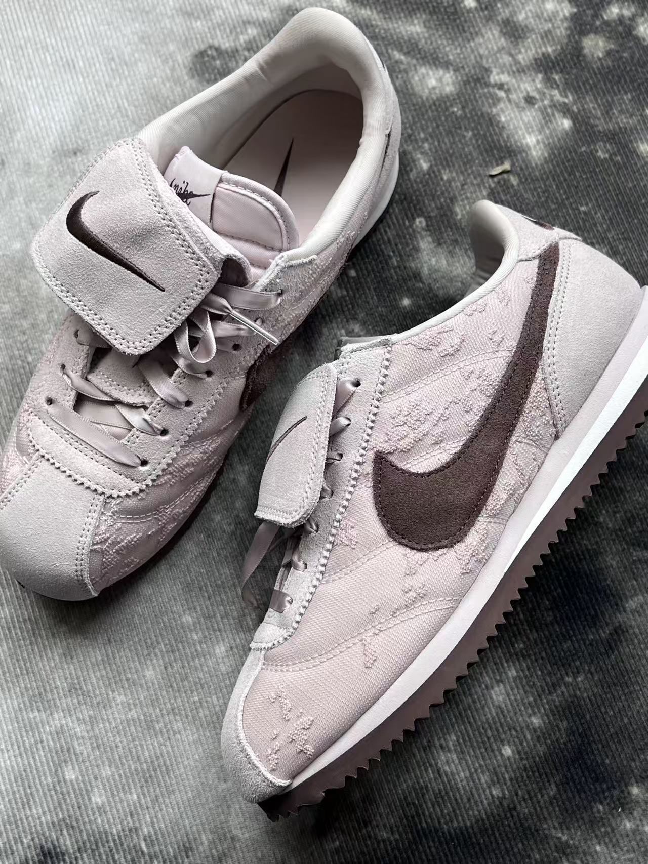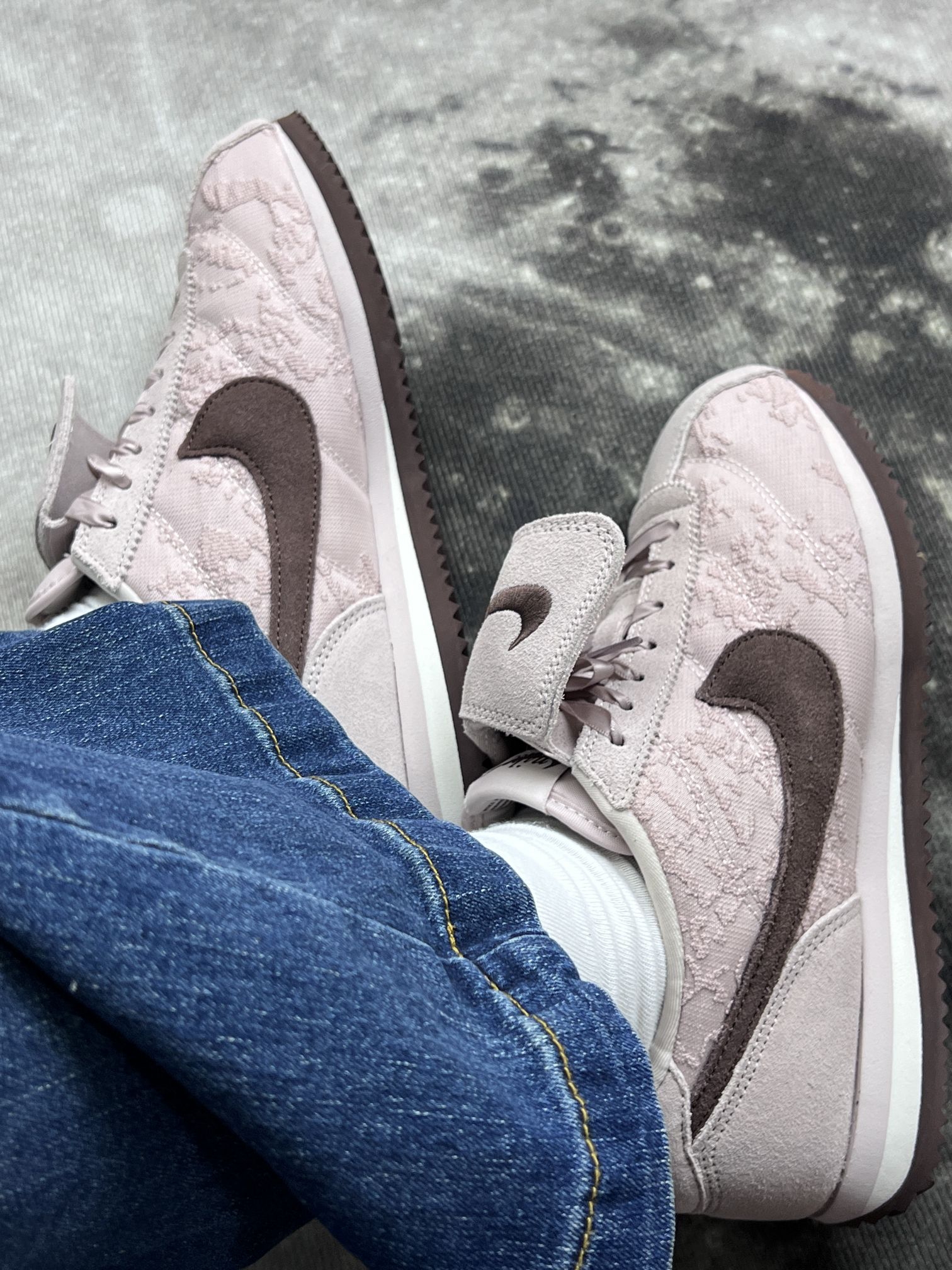 这双粉棕配色的Nike Cortez真的长在我的审美点上了🌸,豆沙粉的鞋面搭配深棕Swoosh,温柔又复古,搭配牛仔裤真的很有春日氛围感。 它的脚感是那种软糯的复古调,鞋型贴合脚型,日常压马路走久了也不会觉得磨脚,轻盈的脚感很适合学生党日常上课、出门逛。不过它的鞋舌设计有点偏窄,脚背偏高的朋友穿的时候会稍微有点卡脚,需要慢慢调整鞋带。 还有个小细节,鞋面的织物材质虽然透气,但遇水后干得比较...