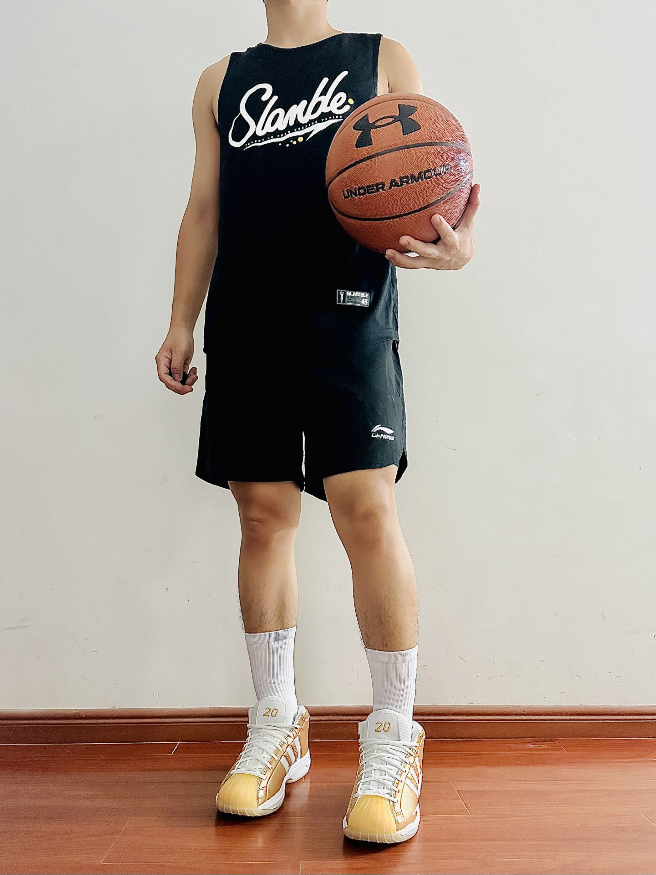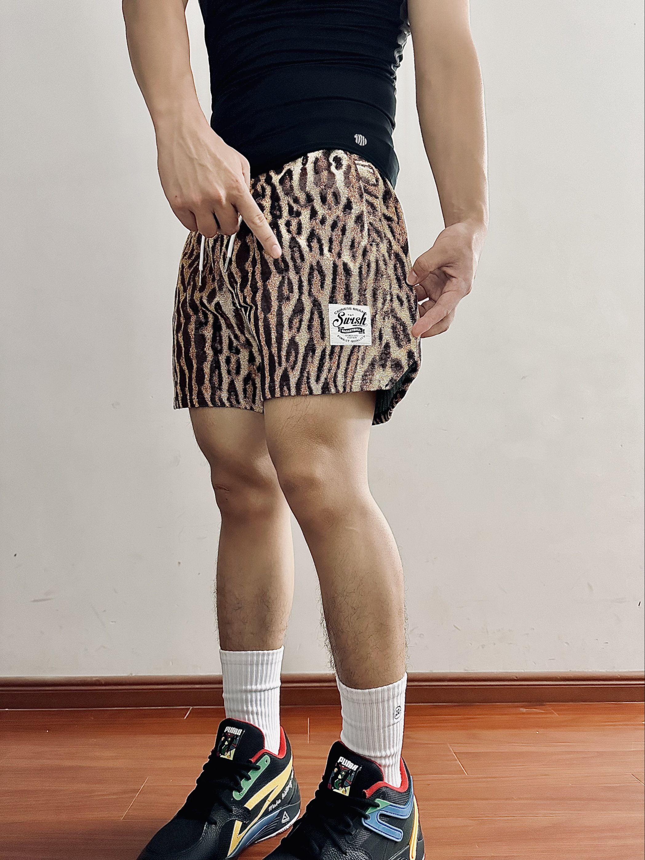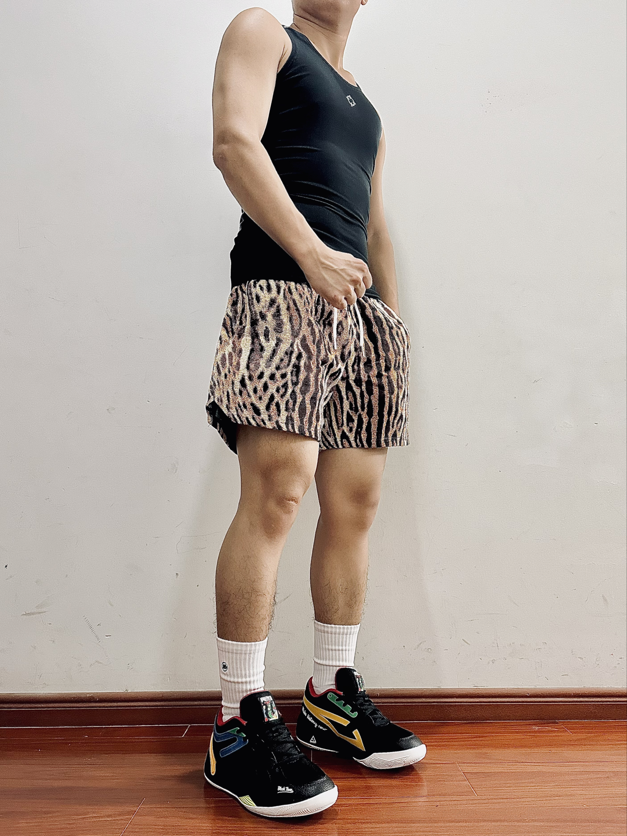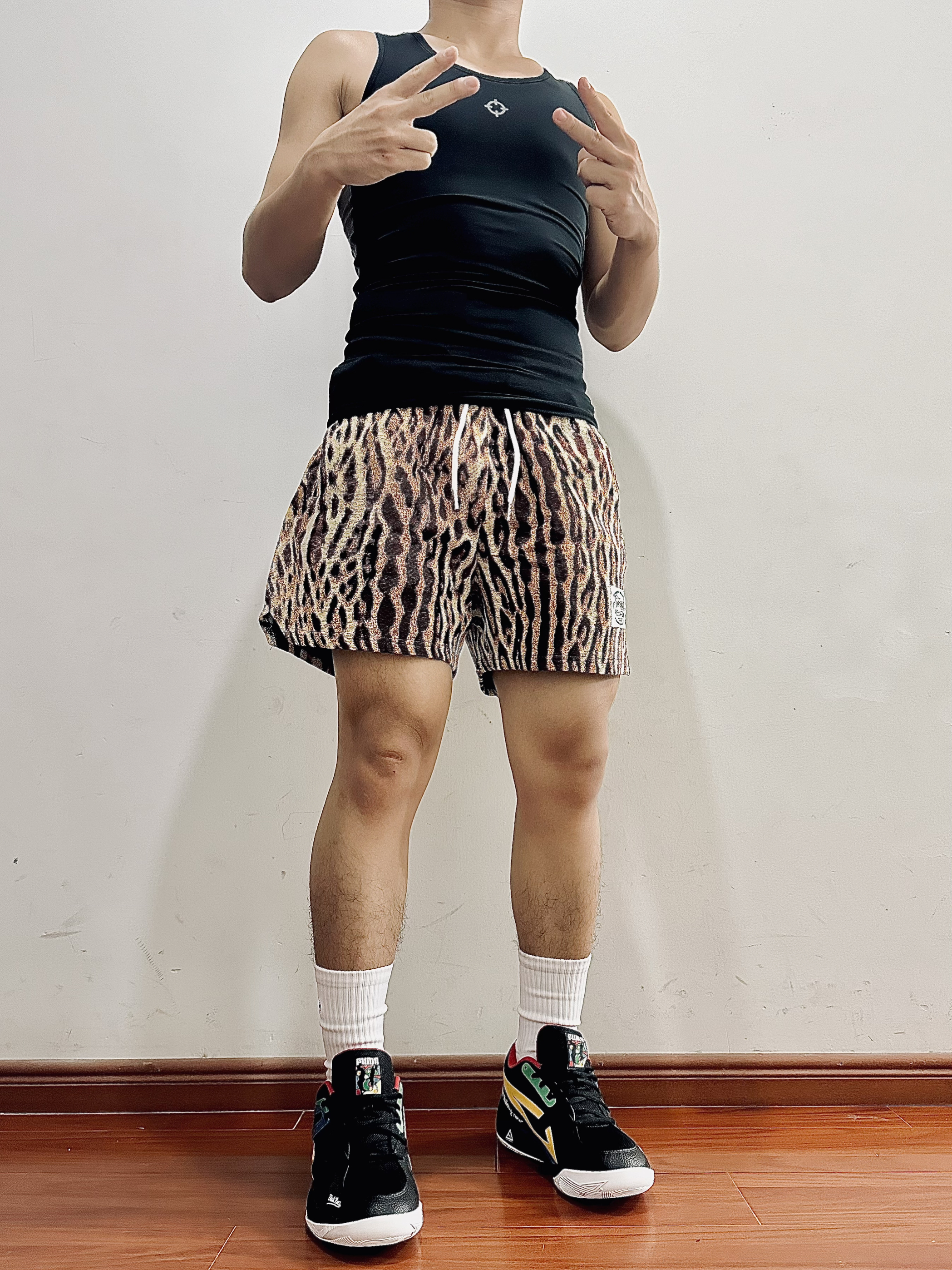 这个夏天 就要穿得亮眼一点今天这一身还不错吧 黑色紧身衣➕虎纹短裤➕彪马篮球鞋 🩳: SWISH THE BALL IN 虎纹版型美式味十足 很吸眼回头率超高 硬挺的面料 立体感很不错 四分的长度刚好 打球的时候不束缚 尺码推荐:170 65㎏ 选择尺码:L码