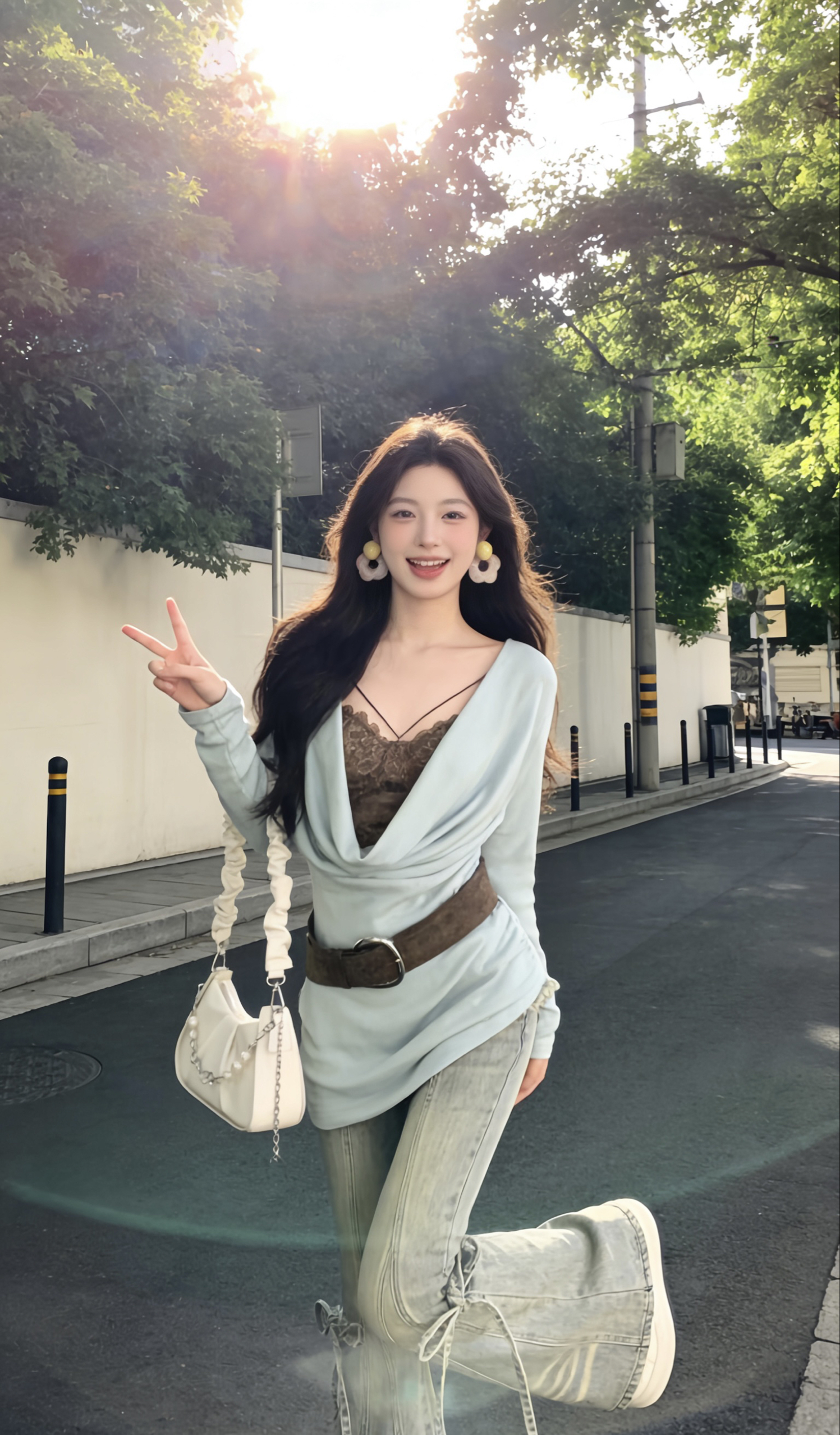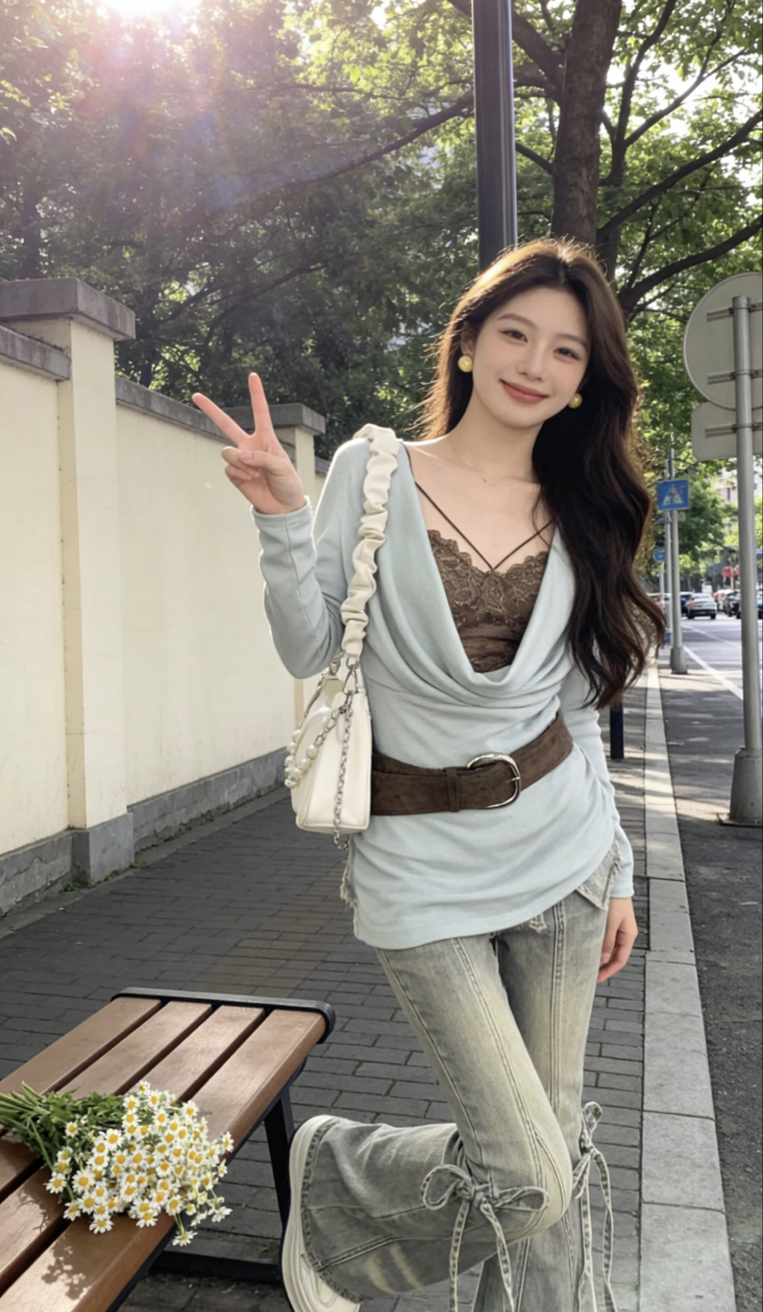 谁懂啊!这套早春穿搭真的把韩系慵懒甜妹感焊在身上了! 浅蓝荡领上衣自带松弛感,内搭蕾丝吊带+棕色腰带,小心机直接拉满,腰臀比瞬间封神,辣度刚刚好; 做旧灰调绑带微喇牛仔裤,梨形身材直接封神!腰头不规则毛边设计超有个性,裤脚绑带细节感拉满,垂感绝了,显腿长到离谱! 奶白褶皱腋下包+黄白撞色花朵耳钉+复古小白鞋,整套搭配清新又元气,青春活力感直接溢出屏幕! 📍阳光明媚的绿意街道太适合出片了! 暖调春...