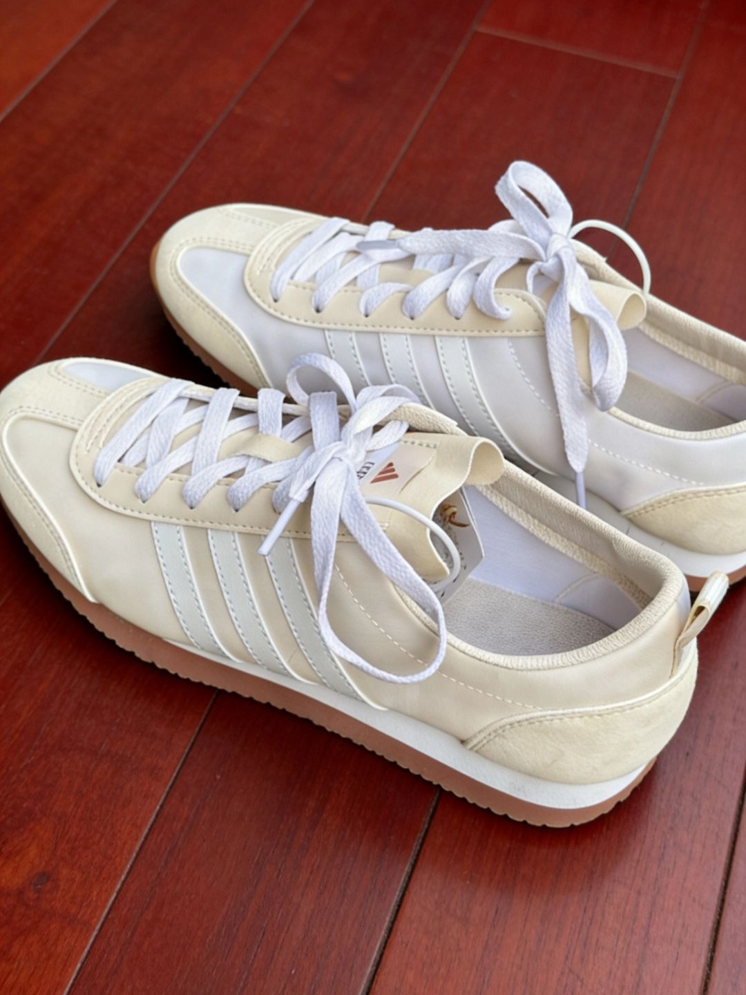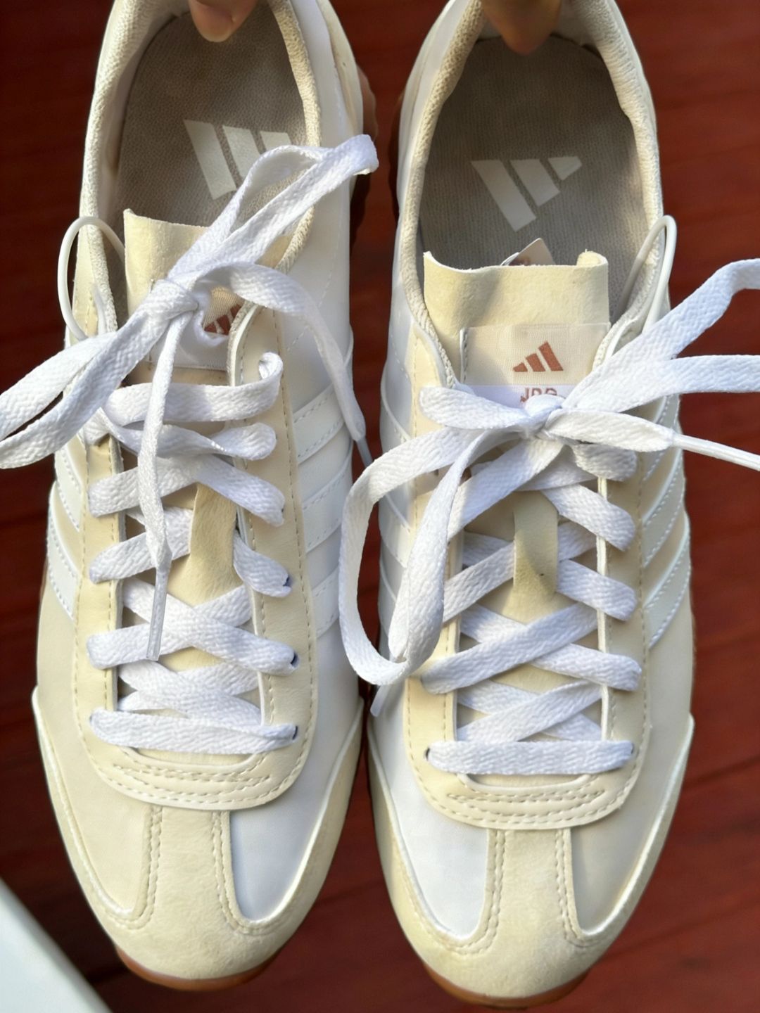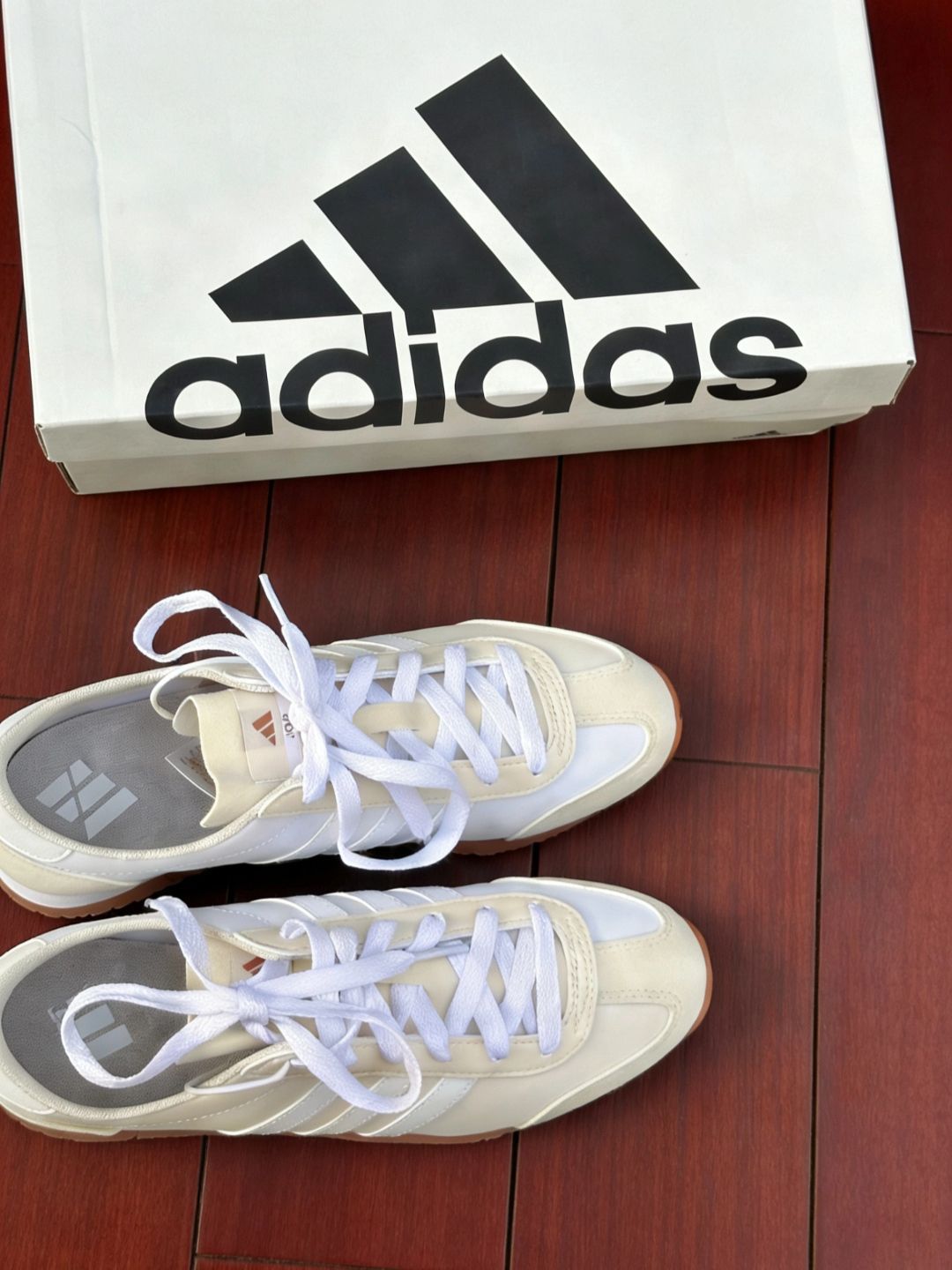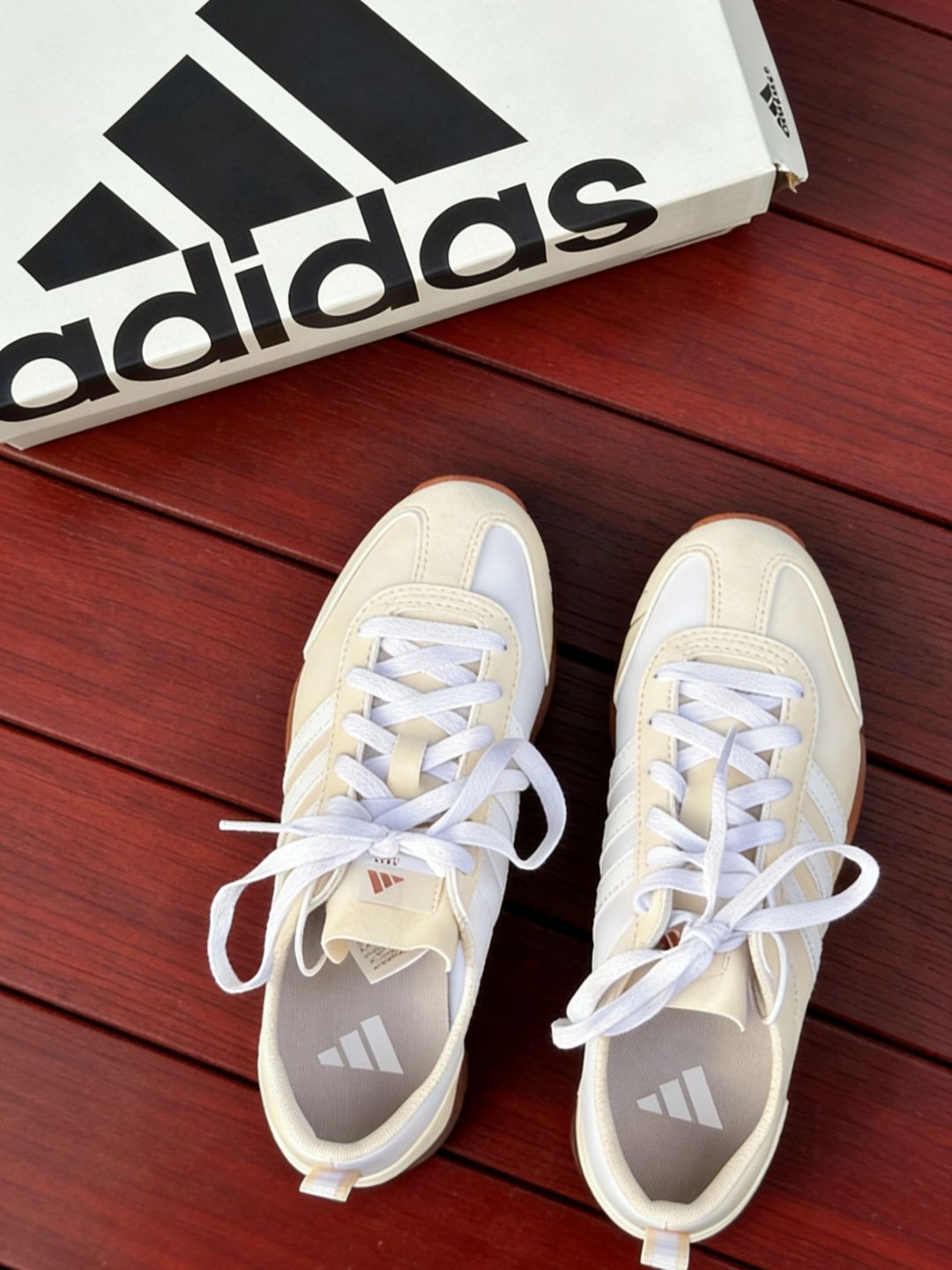 这双阿迪复古跑鞋真的好穿!奶白+浅米的配色很干净,翻毛皮和尼龙布拼接,摸起来质感很舒服。 生胶底抓地力不错,室内运动完全够用,跳操、练核心都不滑脚。 室外运动建议少穿、不耐脏[吃瓜_blue] 不管是在家练瑜伽,还是下楼取快递,都显得很清爽,是那种越看越耐看的款~😌✨