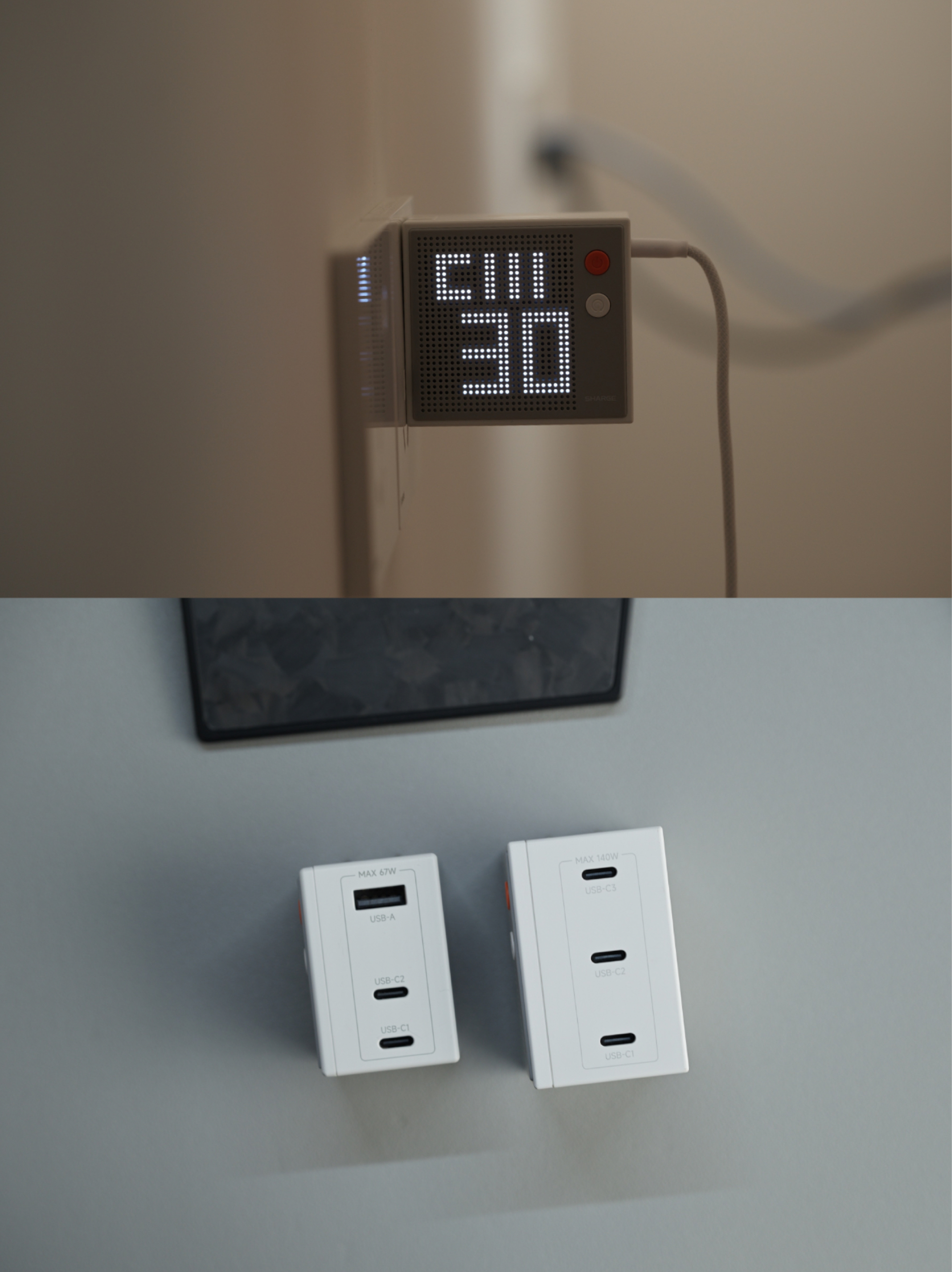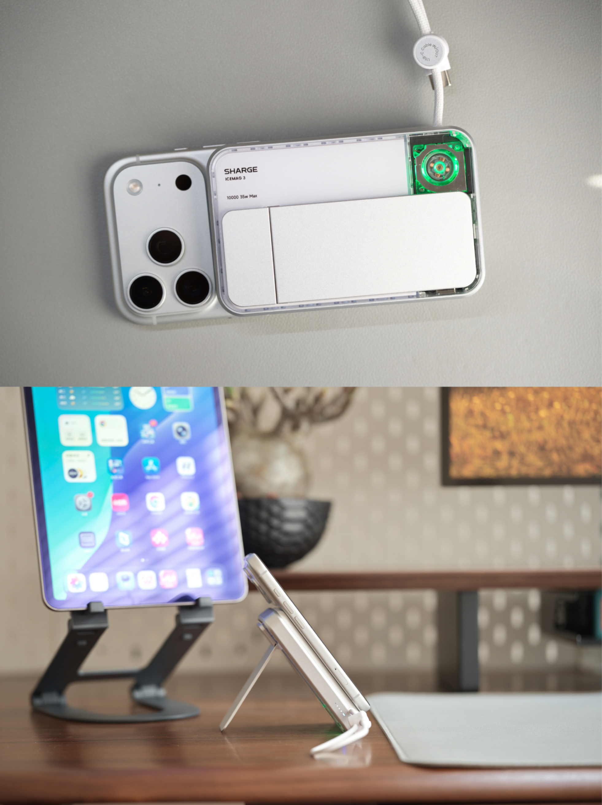 充电头我选闪极,点阵屏140W是桌面供电中枢,三个USB-C接口均支持PD3.1 140W满血输出,单口可满功率驱动笔记本,多口同充智能分配功率,点阵灯实时显示充电状态,仪式感拉满。飓风3是移动续航随身站,支持Qi2.2协议25W磁吸快充、35W有线双向快充,自带15cm编织短线,适配多设备,内置万转主动散热风扇与NTC智能温控,充电低温稳定,半透明外壳搭配RGB呼吸灯效,既是充电宝也是桌面摆件。