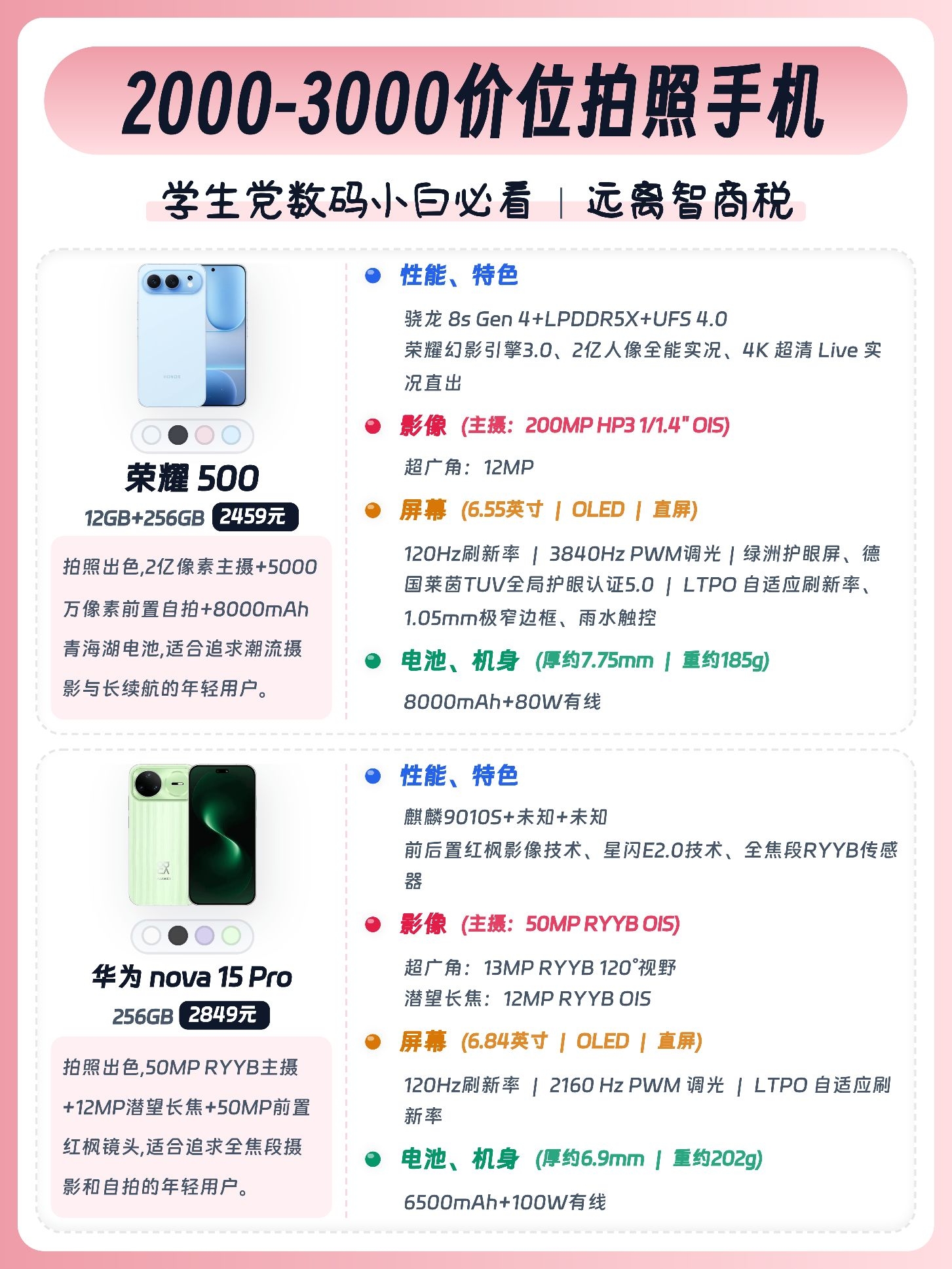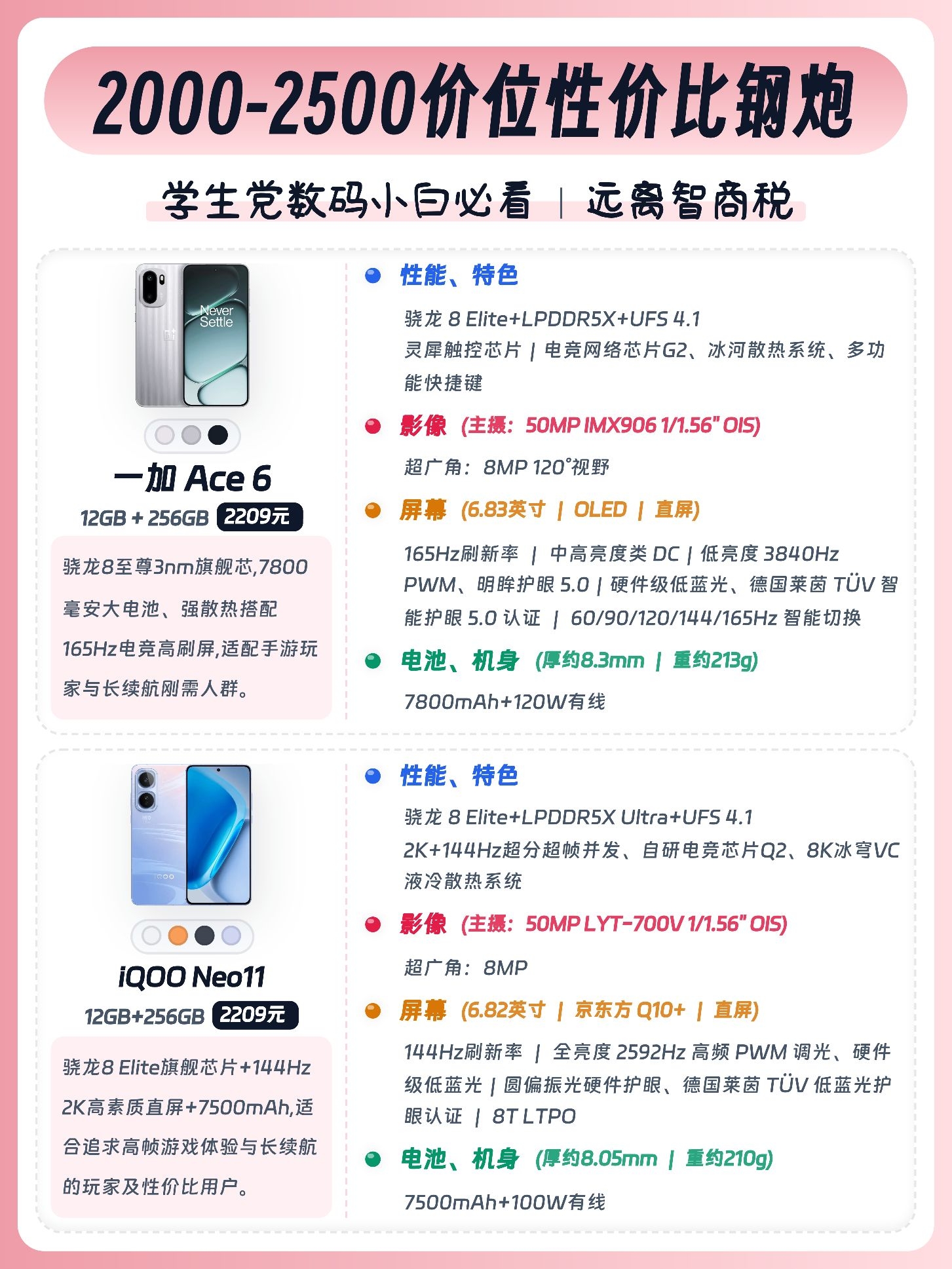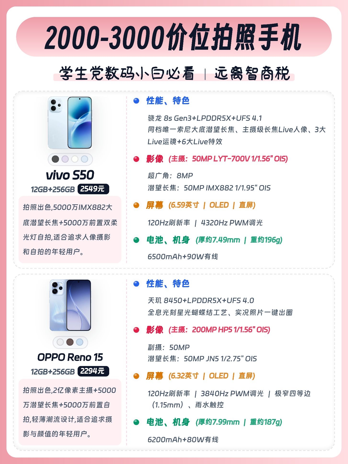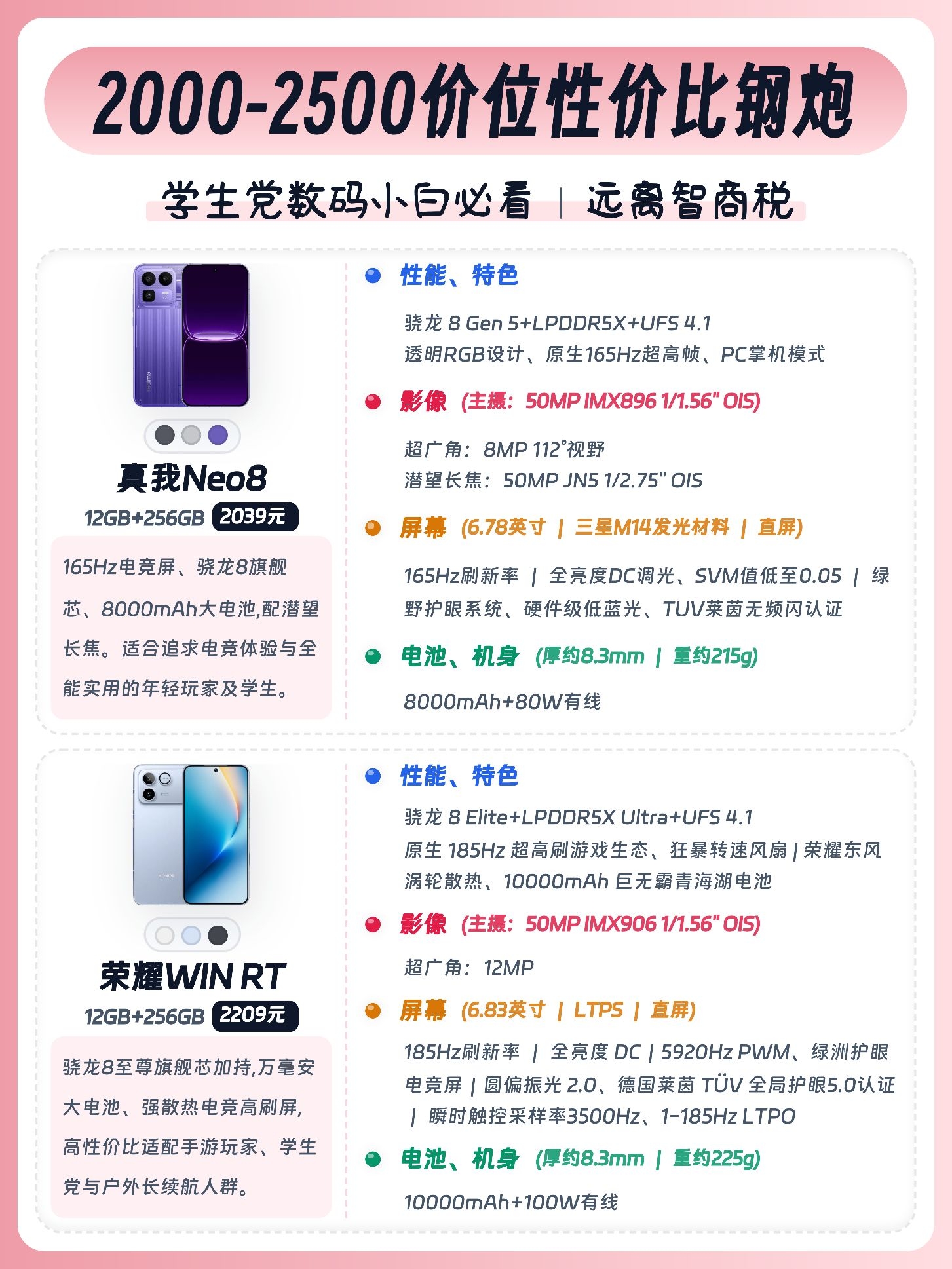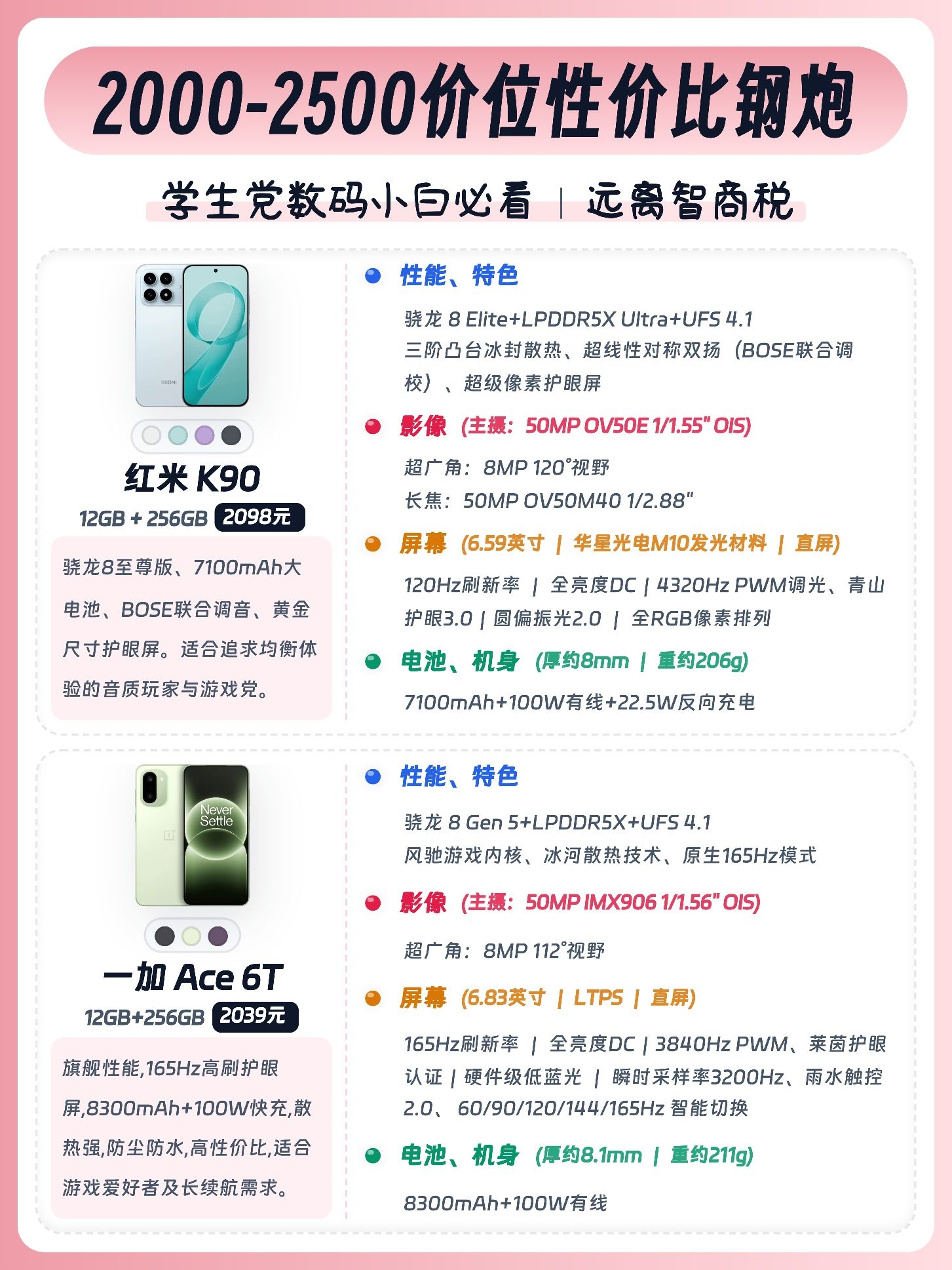 如图所示,这些手机都是个人觉得目前比较值得入手的国产手机,覆盖2000-5000价位,刚需的换机用户可以码住了,全是干货没广哈 - ✅ 学生党刚需的性价比小钢炮👇 1️⃣ 红米K90、真我Neo8、一加Ace6T、iQOONeo11、荣耀WIN RT ✅ 女生刚需的轻薄拍照|重自拍颜值神器 2️⃣ vivoS50、OPPOReno15、荣耀500、华为Nova15Pro ✅ 重性能|打游戏|重拍照...