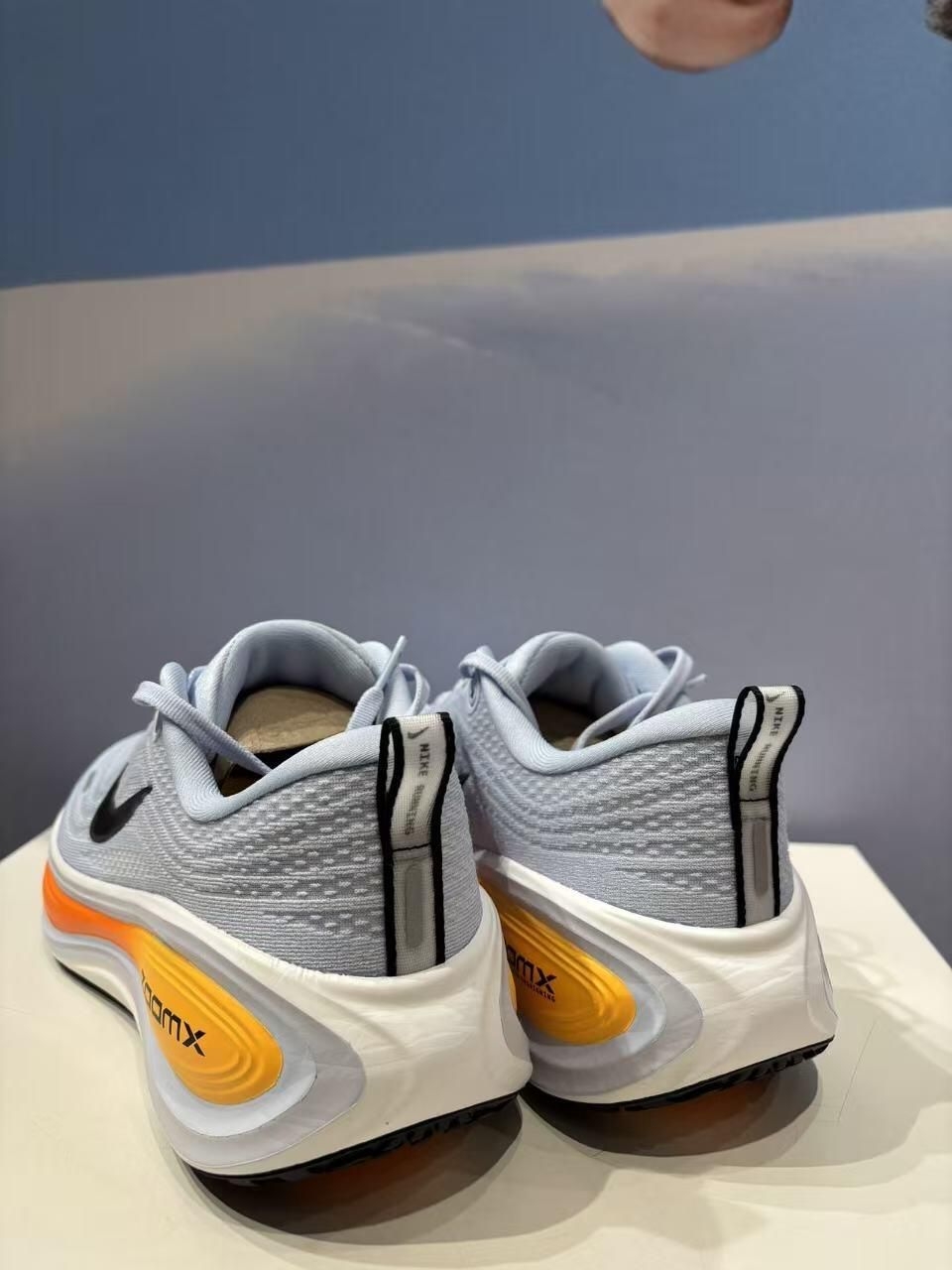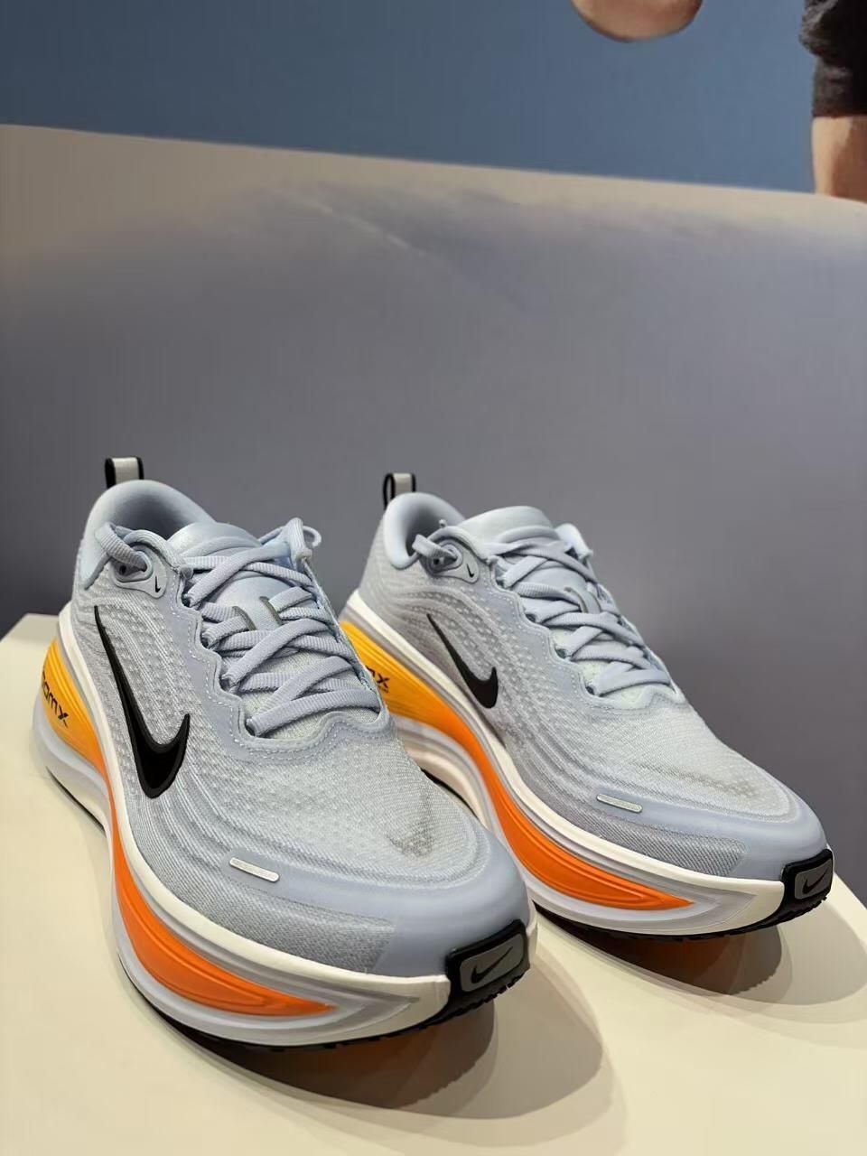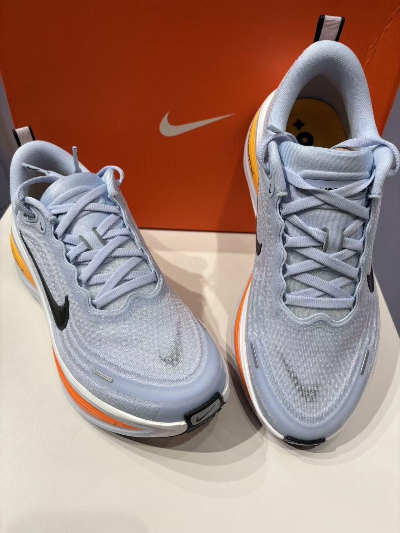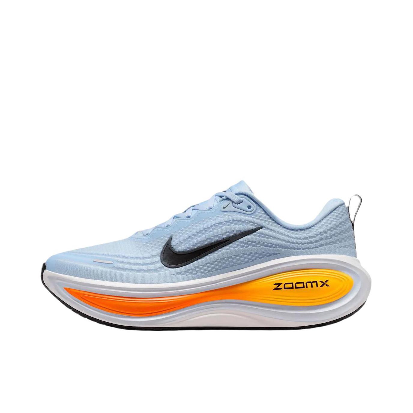 Nike Vomero Plus(超级迈柔)跑鞋,外观有浅蓝橙撞色与灰白简约款,针织鞋面纹理细腻,质感高级,侧边Swoosh和ZoomX中底辨识度拉满。 脚感上,ZoomX泡棉+稳定结构,慢跑五公里时缓震回弹充沛,落地软弹不卸力,长时间穿着也不闷脚,后跟支撑到位,两小时下来足弓和膝盖无酸痛感,兼顾舒适与长距离跑