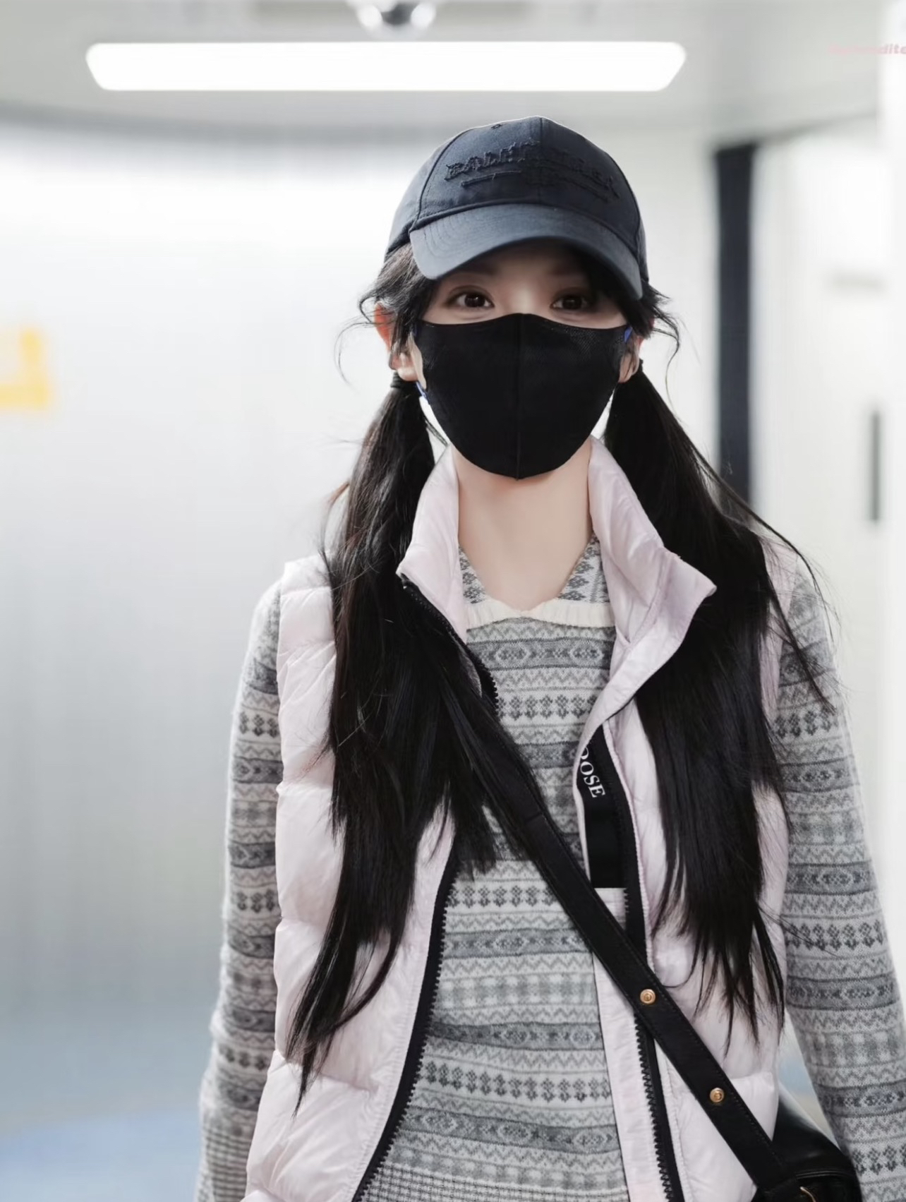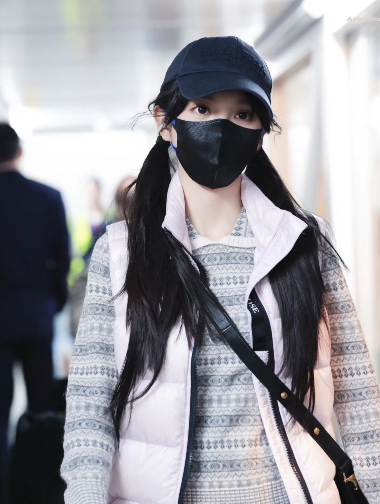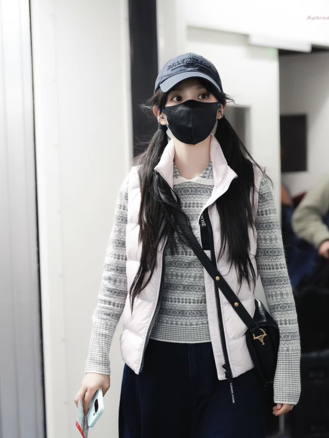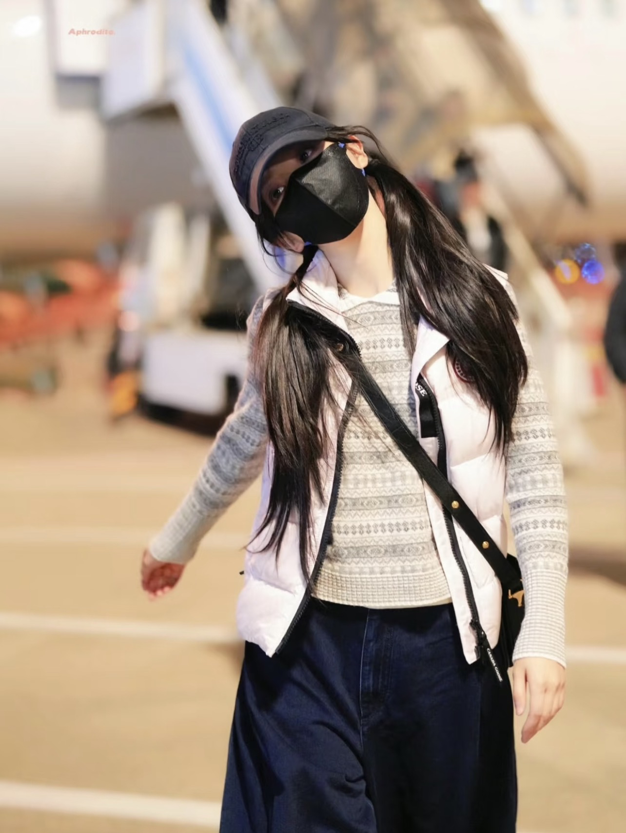 浅粉羽绒马甲叠穿费尔岛毛衣,甜酷感直接拉满 双马尾+棒球帽,少女感和休闲感平衡得恰到好处 藏蓝阔腿裤+厚底穆勒鞋,随性又显腿长 整套look清爽又有层次,机场也能穿出画报感